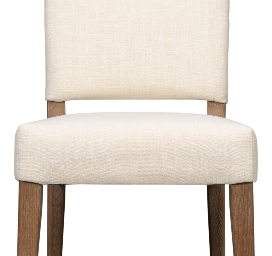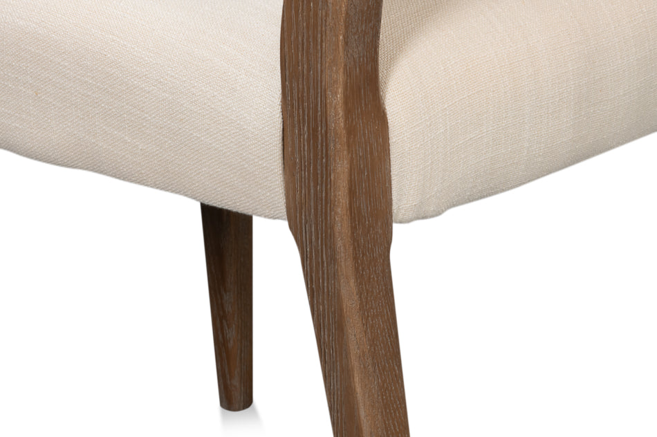 The Bauhaus Chair features a clean, upright frame crafted from solid oak, highlighted by spit-tack detailing and an open-framed back that reflects mid-century design influences. Its neutral ivory lined upholstery complements the sturdy oak frame, offering both timeliess style and comfort.