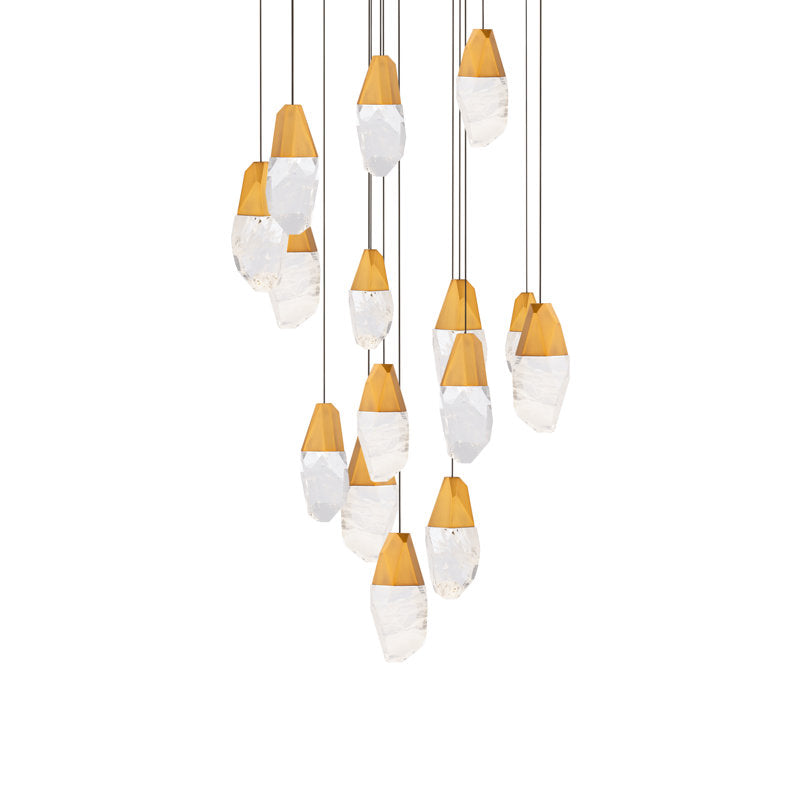 Multi Lights: A shower of jewels. Suspended in mid-air, Schonbek optic or optic haze crystal elements composed of natural quartz gemstone illuminate at varying heights to entice. Cascading from above and perfectly designed for over breakfast tables or nightstands in a bedroom to make a powerful but elegant statement. Mini Pendant: Suspended in mid-air, a jewel of Schonbek optic or optic haze crystal composed of natural quartz gemstone illuminates to entice. The chiseled metal fitting is congruent with the faceted crystal to confer elegance in design continuity.