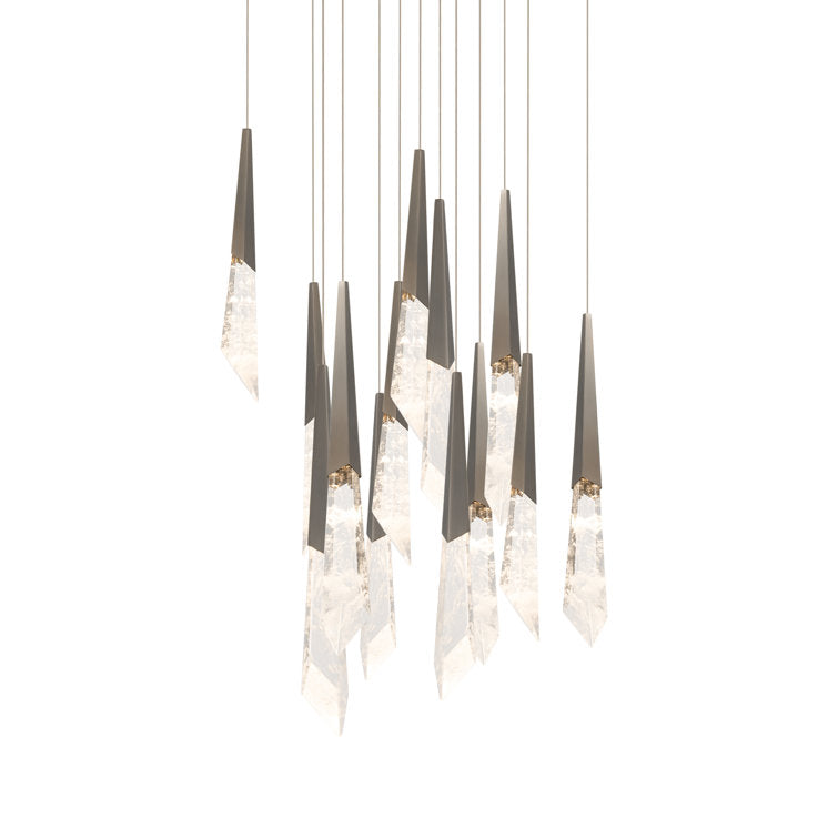 A dramatic character you can't help but fall in love with. The Solitude chandelier features Schonbek optic haze crystal composed of natural quartz gemstone that illuminates and gravitates. Crystal spears juxtapose heroically with bolts of luminous energy.