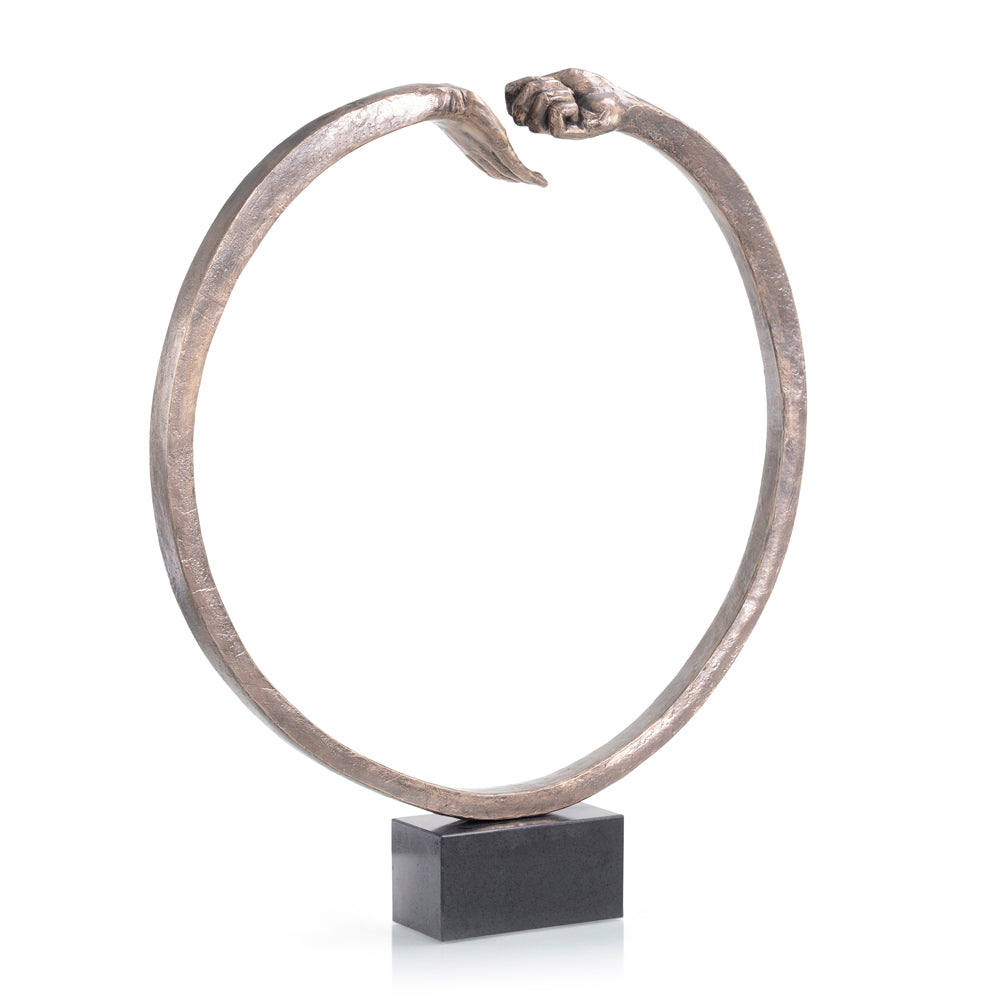 This monumental sculpture features two hands sweeping together in eternity. The hands are in a finish of bronze, and they are mounted on a black marble base.