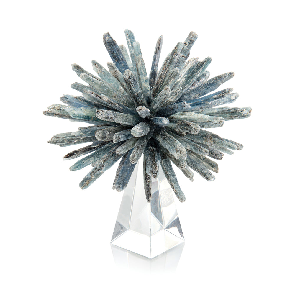 A silvery grey-blue burst of color is created with this kyanite star on a crystal base.