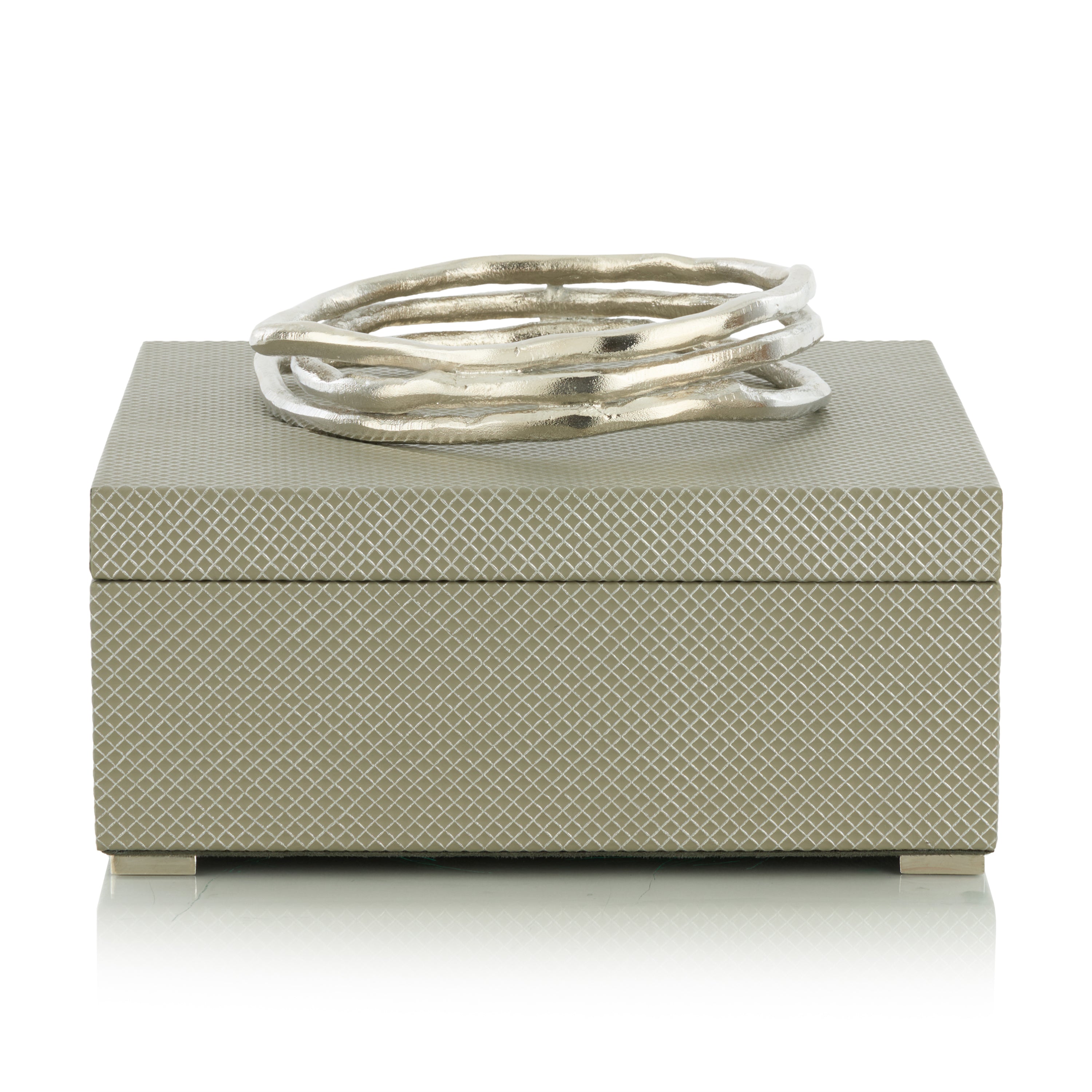 The Silver Coil Box is an elegant decorative vessel that captures playful dimension and refined opulence. It features a textured gray surface, crowned by a coiled aluminum handle in a sleek Nickel finish.