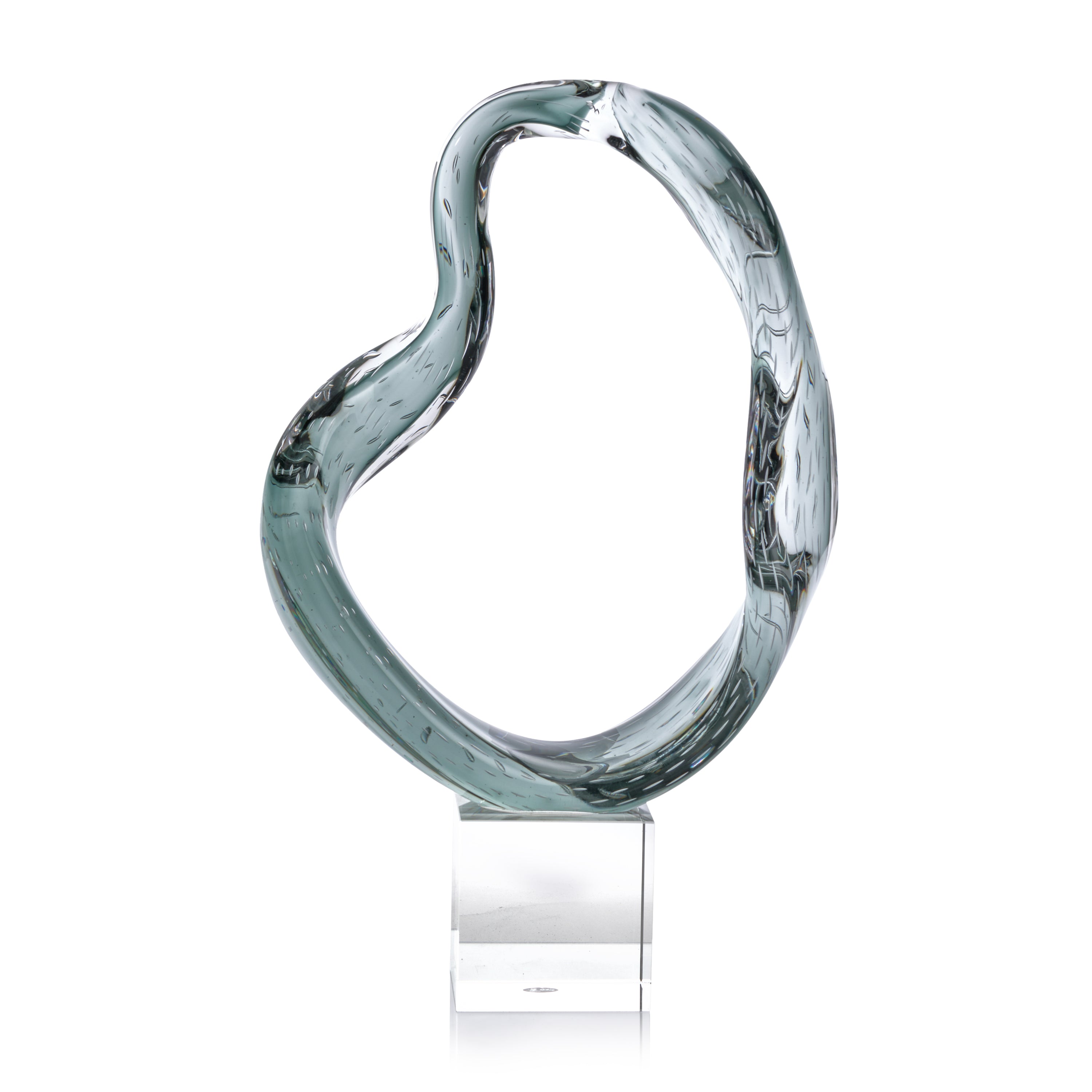 The Viridian Flux Sculpture showcases sleek, contemporary style through dynamic, abstract forms. Hand-blown from dark green art glass, it features a sinuous silhouette that twists and turns to convey a striking sense of motion. The design is anchored by a square base of clear crystal, offering a crisp contrast to the flowing shape above.