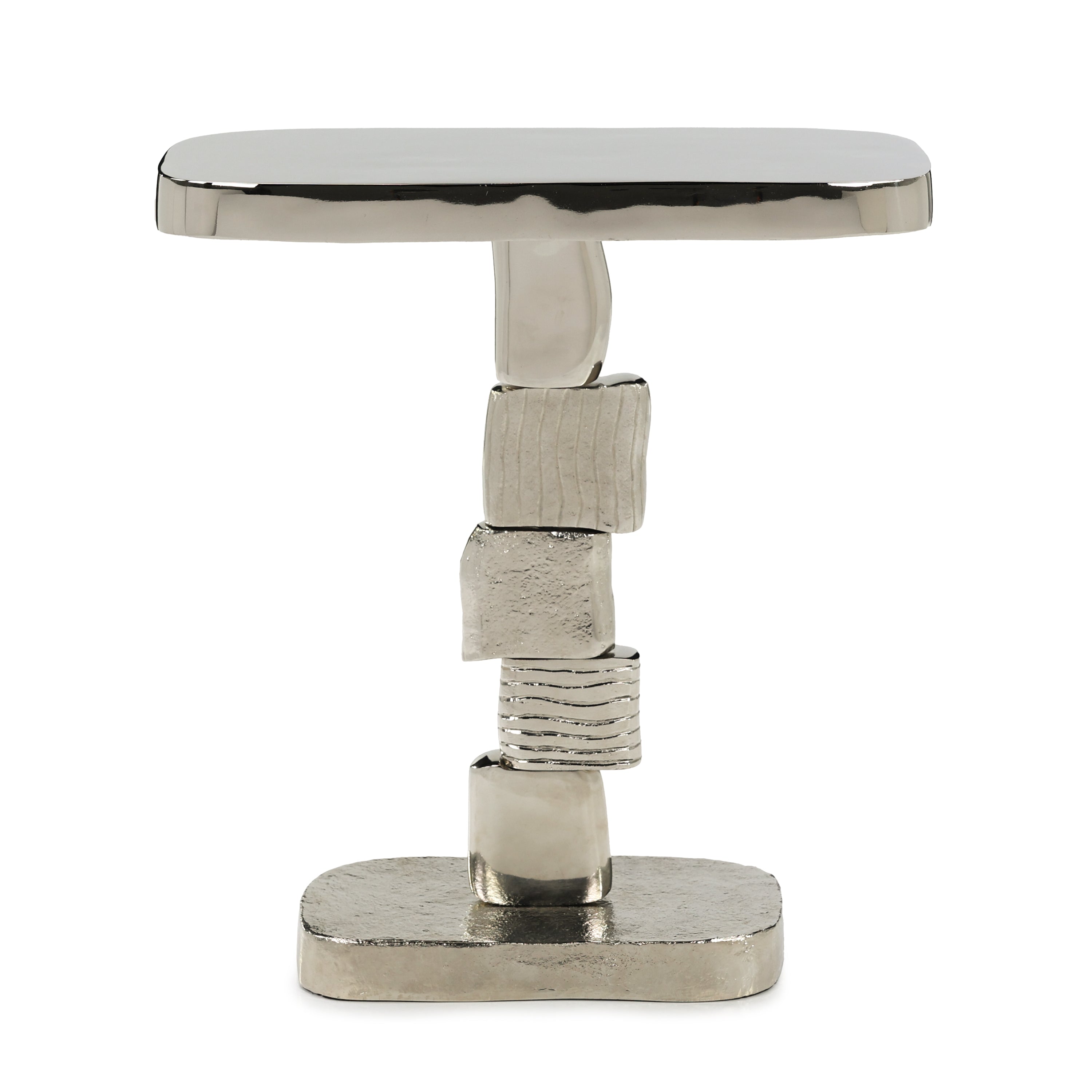 The Cube End Table is a gorgeous contemporary piece, crafted from aluminum in a Nickel finish, displaying an arrangement of asymmetric blocks etched with varying textures. The piece masterfully leverages geometric motifs to evoke a sense of depth and dimension within a space.