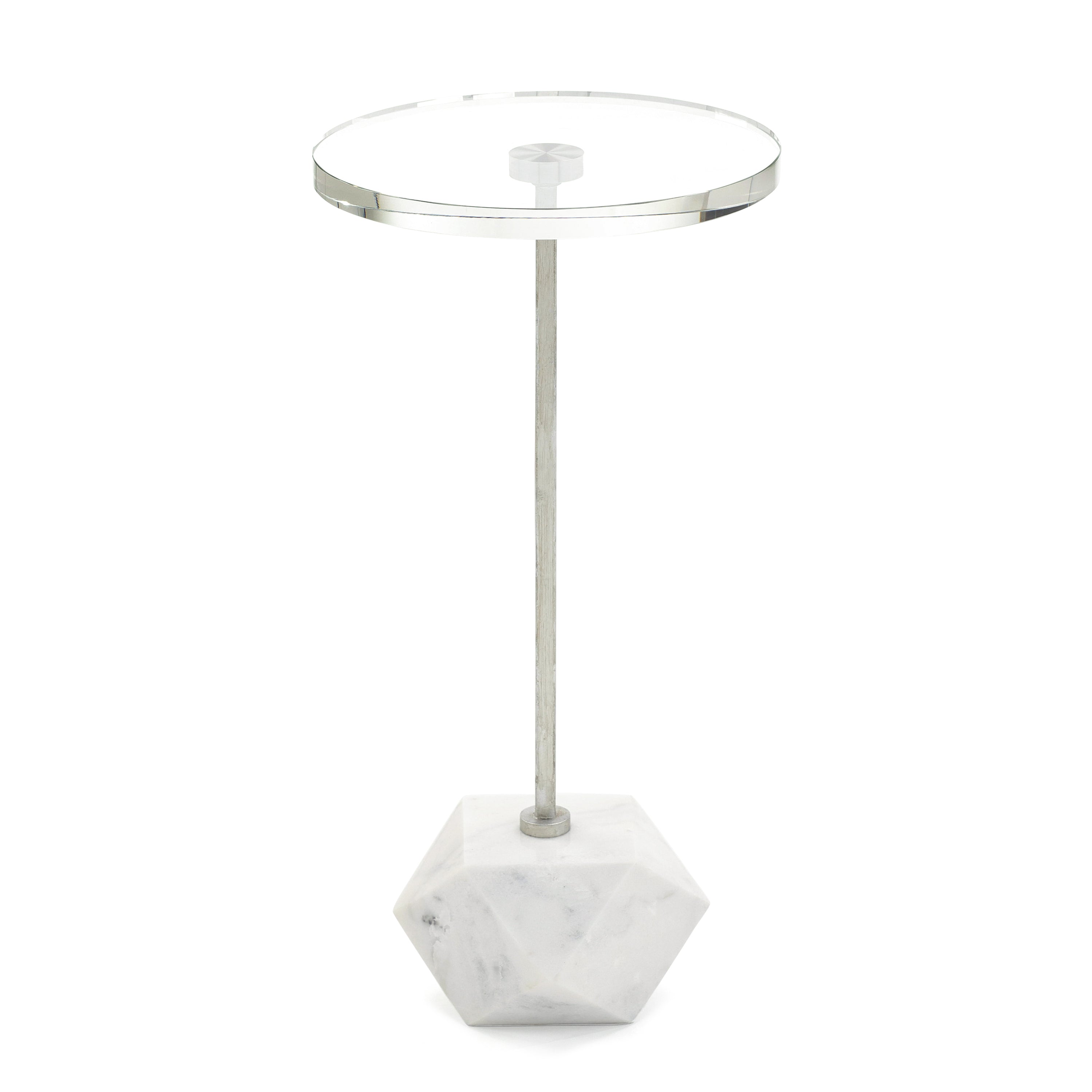 The Facet Martini Table is a contemporary design statement with a tastefully subtle silhouette. A geometric base crafted from white marble supports a slender steel rod adorned in Antique Silver Leaf. A clear, rounded crystal surface completes the look of this stylish accent table.