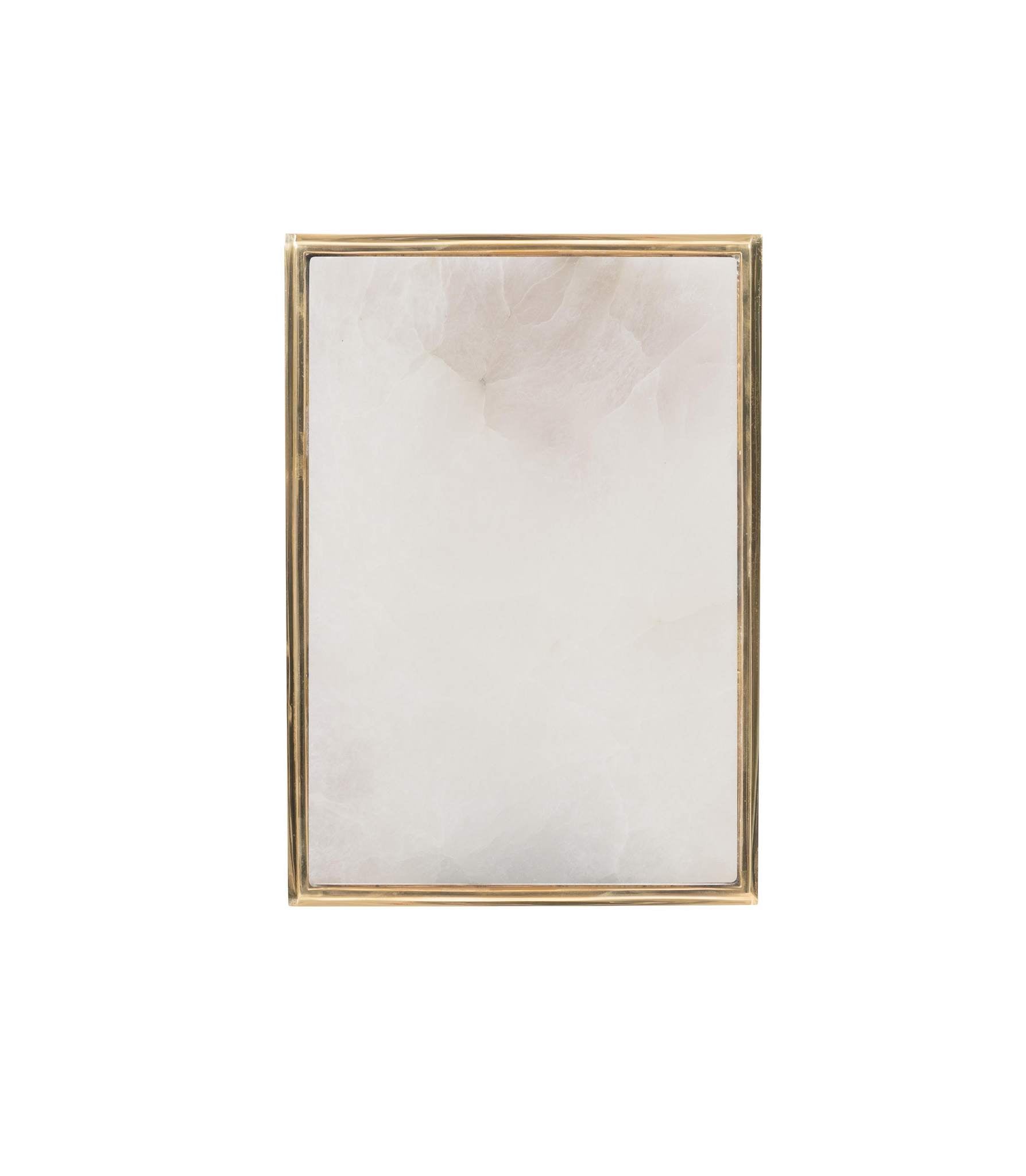 The Giselle Spot table is stunning in its solid alabaster upright and slab top and stepped, polished brass base and top border. Alabaster is a translucent ivory stone with heavy tonal veining. On occasion, mineral deposits can result in darker veining. These natural features make Alabaster a stunning stone. The Giselle Spot Table is the perfect statement piece for any space. The alabaster is sealed with a water-based stone sealer to protect against oil and water-based stains. Please note the metal is solid lacquered brass and can only be cleaned with a clean, dry, microfiber cloth.