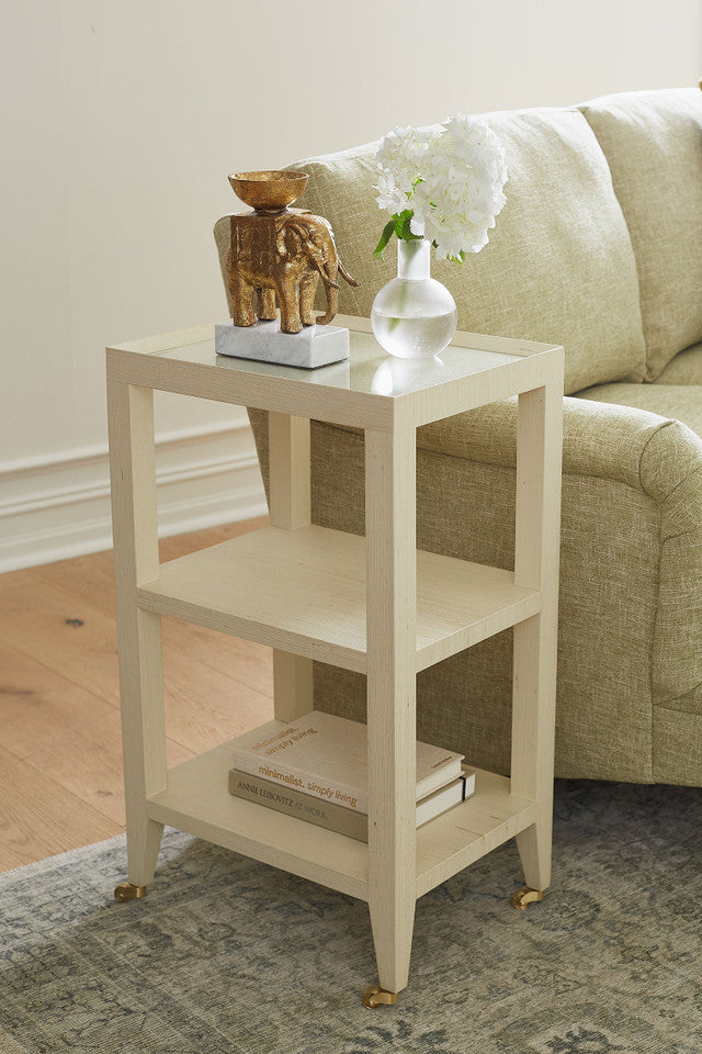 The Isadora Collection revisits old world luxury through a modernist lens, bringing structural furnishings to life with rich finishes, polished hardware, and a portable aspect that harks back to the golden age of entertaining, when pieces were rolled into parlors and drawing rooms according to one's needs. Of course, Villa & House has timelessness in mind when it comes to the likes of our Isadora Side Table, a longstanding staple of our collection. Featuring an open silhouette wrapped in lacquered grasscloth, stacked shelves, and a tabletop with a slightly inclined edge, the piece is ideal for everyday use or decorative display. Set on four brass wheels, the Isadora is glamorous yet practical, and can act as a versatile serving table or bar cart.17w x 13d x 29h