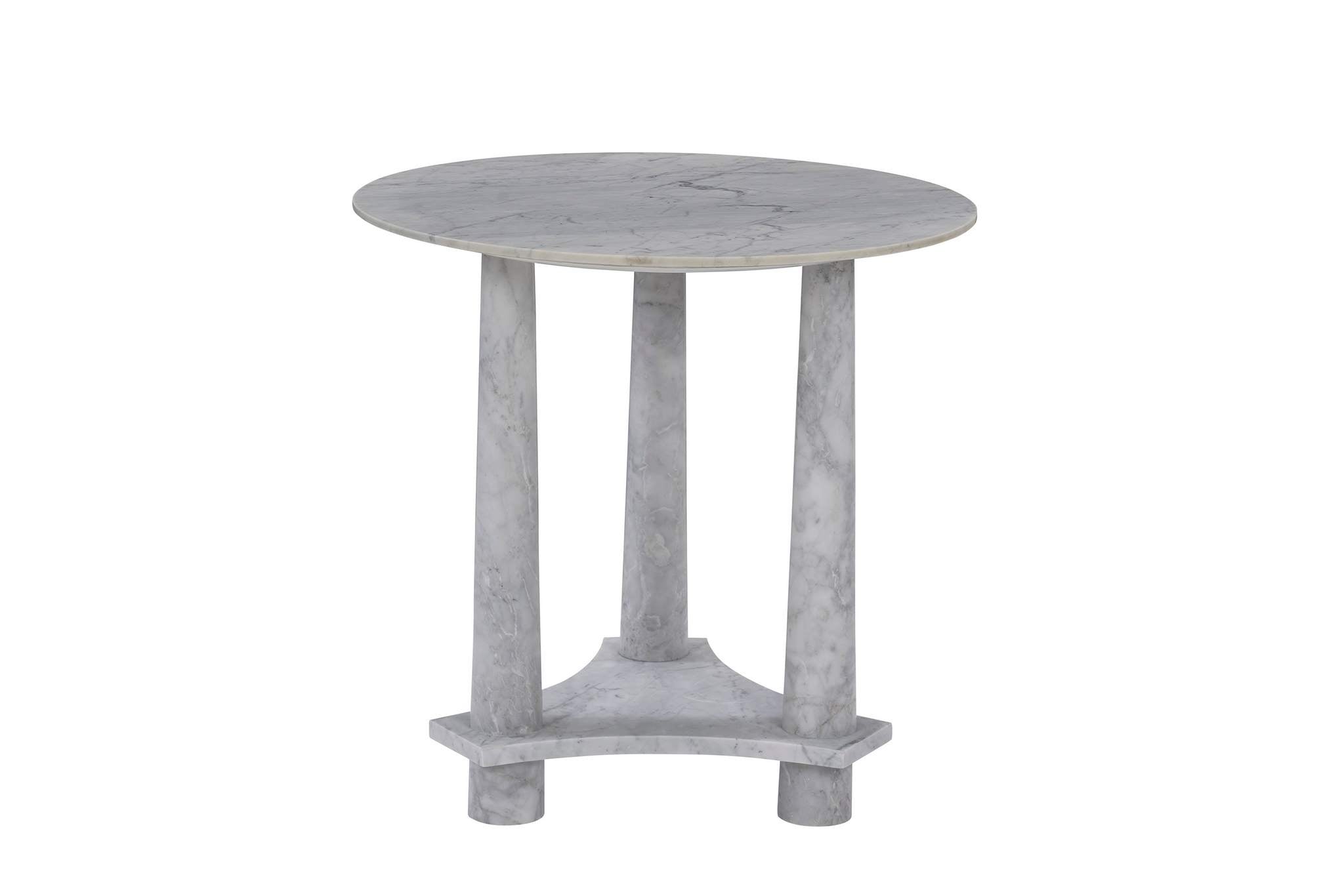 The Ivo Occasional Group is expertly crafted from solid honed Carrara marble. Each piece features a refined chamfered edge along the perimeter and delicate coned legs. While the substantial marble construction ensures a strong presence, the open legs and lower shelves lend a visually light and elegant quality to the design.
