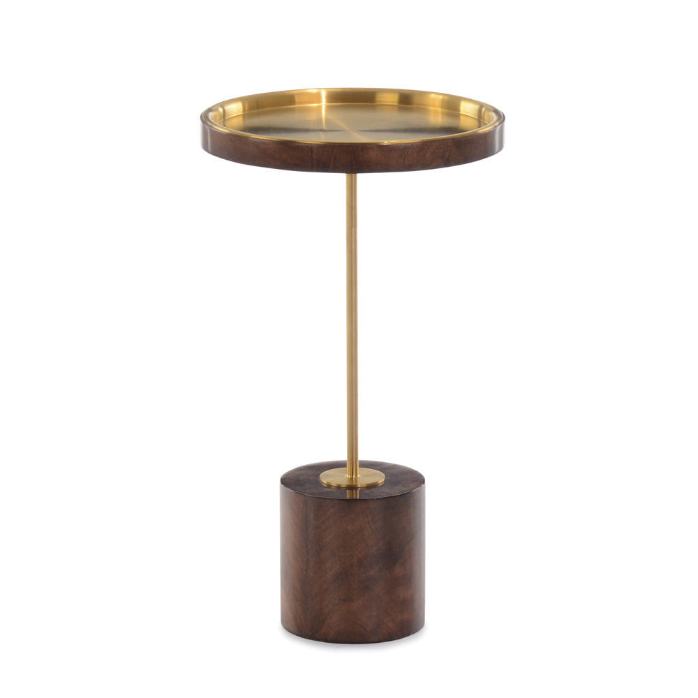 This martini table features a European walnut crotch veneer top rim and base in a walnut finish. There is a fixed, inset stainless steel tray in the top. The top and base are attached by an elegant stem in stainless steel. All metalwork is finished in polished brass.