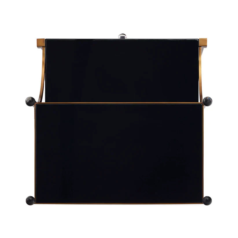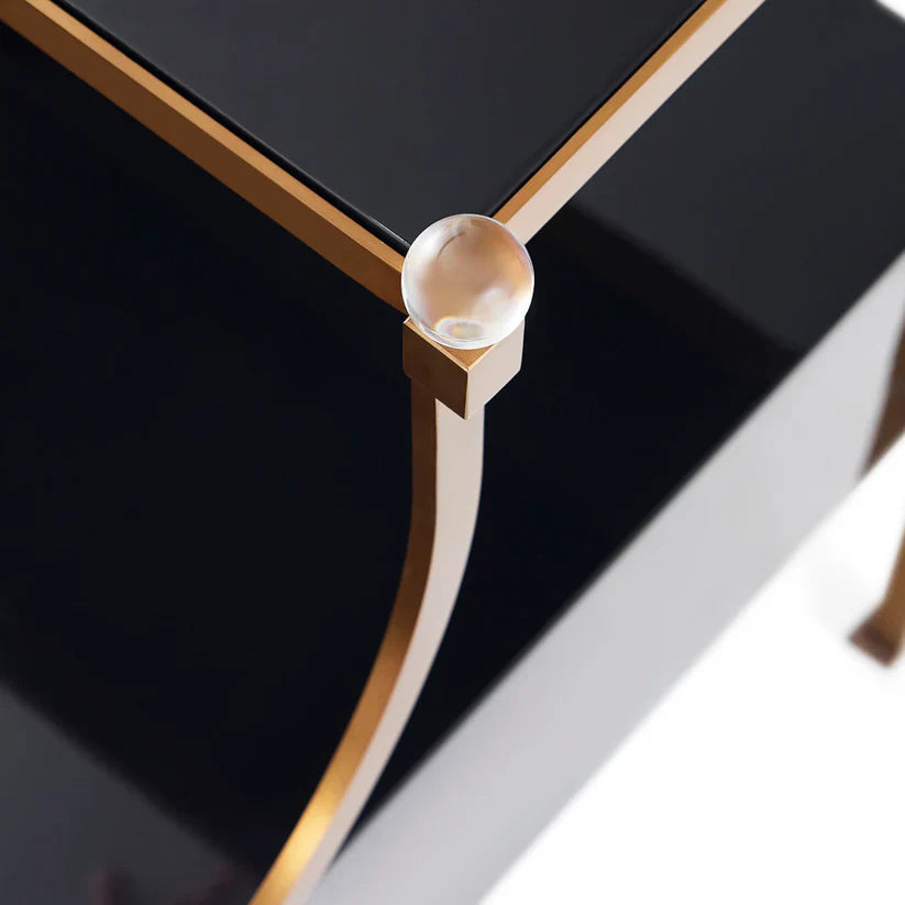 A fab storage solution next to your sofa, our Rider Terrace End Table is an updated take on French Empire style. Featuring a glossy black lacquer case with a swopping antique brass frame topped with glamorous acrylic orb finials. With a top shelf and a deep, soft close drawer, there’s plenty of space for stacking books and styling décor. A fab and functional surface and storage solution at the end of any high-armed sofa.