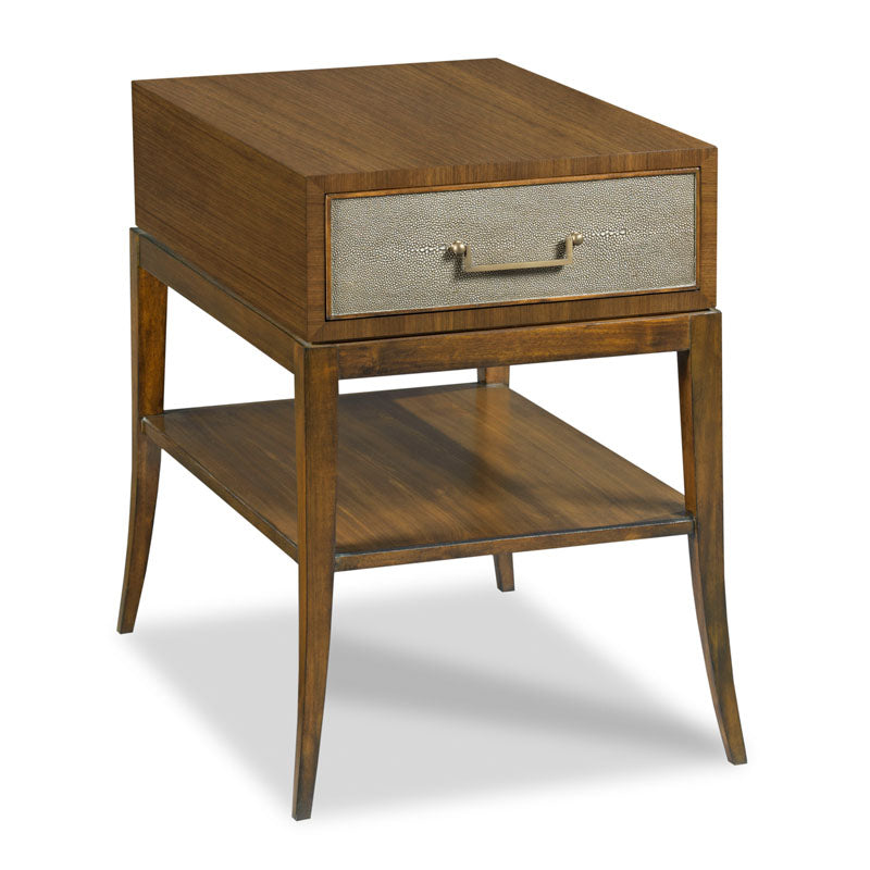 A wonderful table that is veneered with American walnut and fitted with a handy drawer that is overlaid with faux shagreen and a cast brass pull. The table is elevated by graceful tapering legs that are joined by a low shelf.