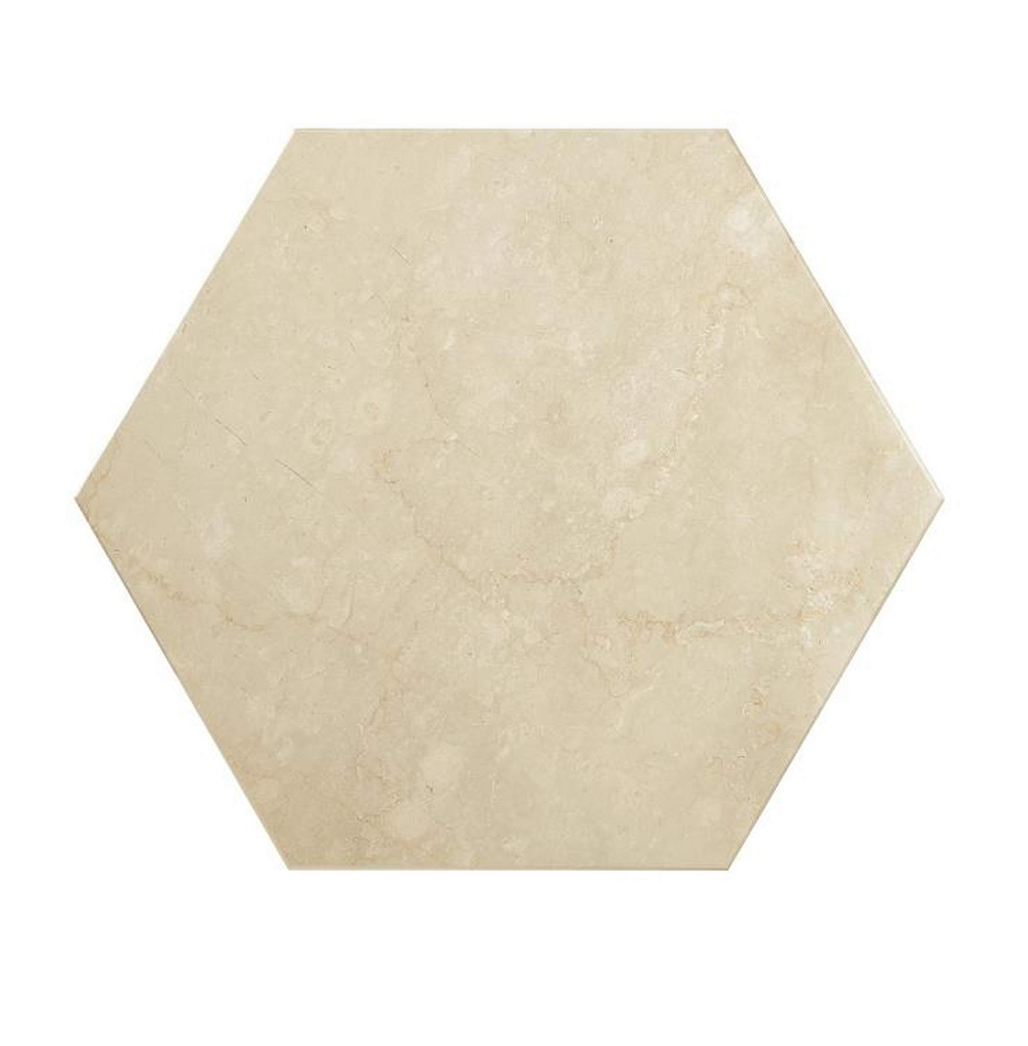 The curved stance of the Sienna's bronzed metal tripod base is paired with the crisp geometry of the table's hexagonal Botticino marble top. Sienna is the only finish as shown.