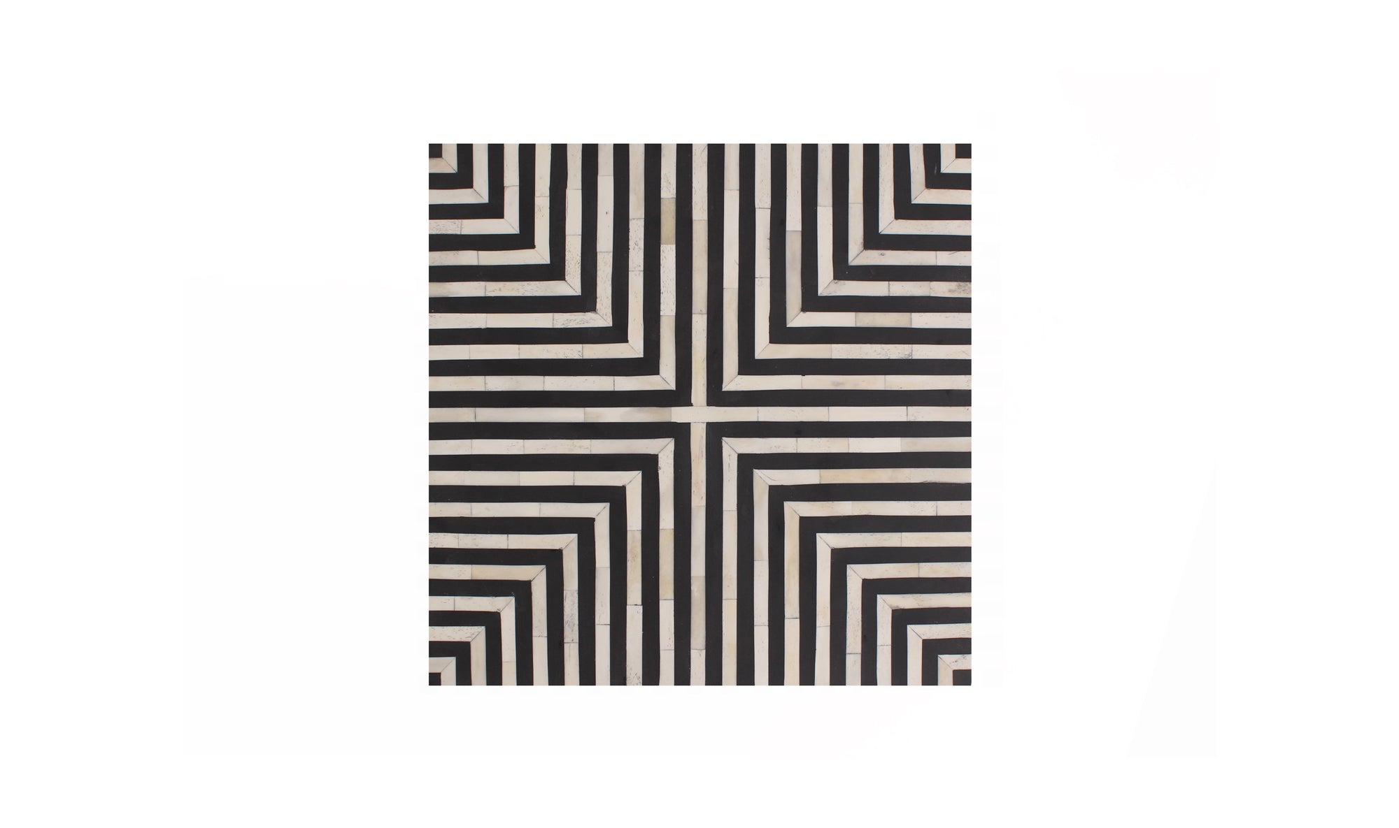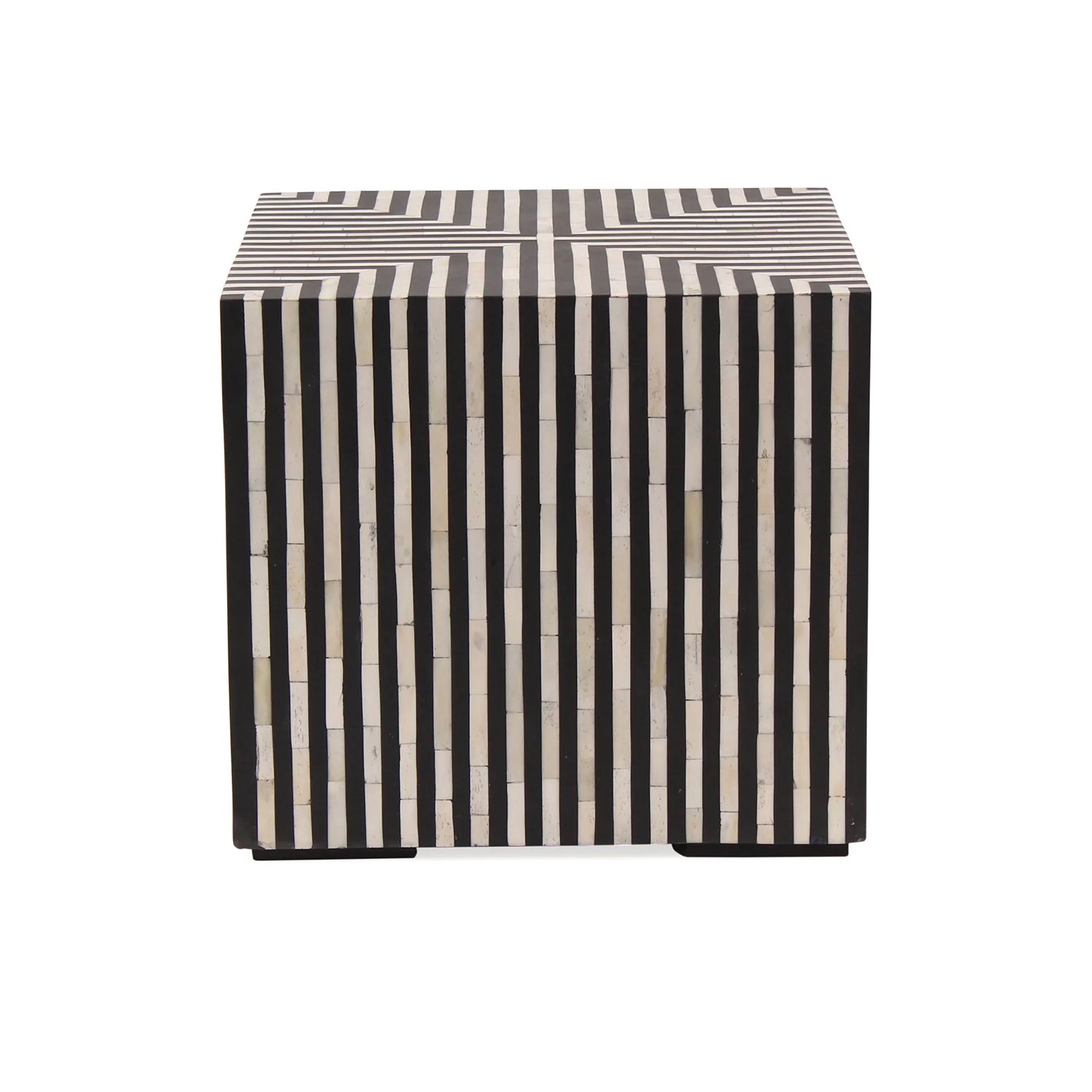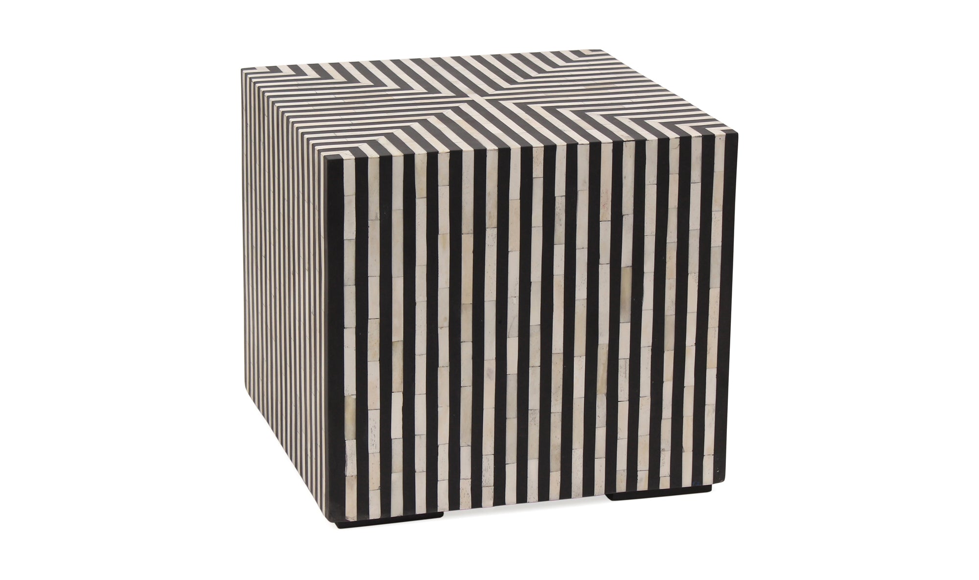 Simplistic and bold, the Terning side table's hypnotic art deco design is an exercise in contrast. A veneer of ethically sourced white and black camel bone with resin adds a visual statement that contrasts with its simple construction and square shape. The Terning series features a coffee table and a side table to better suit living spaces of all sizes and shapes.