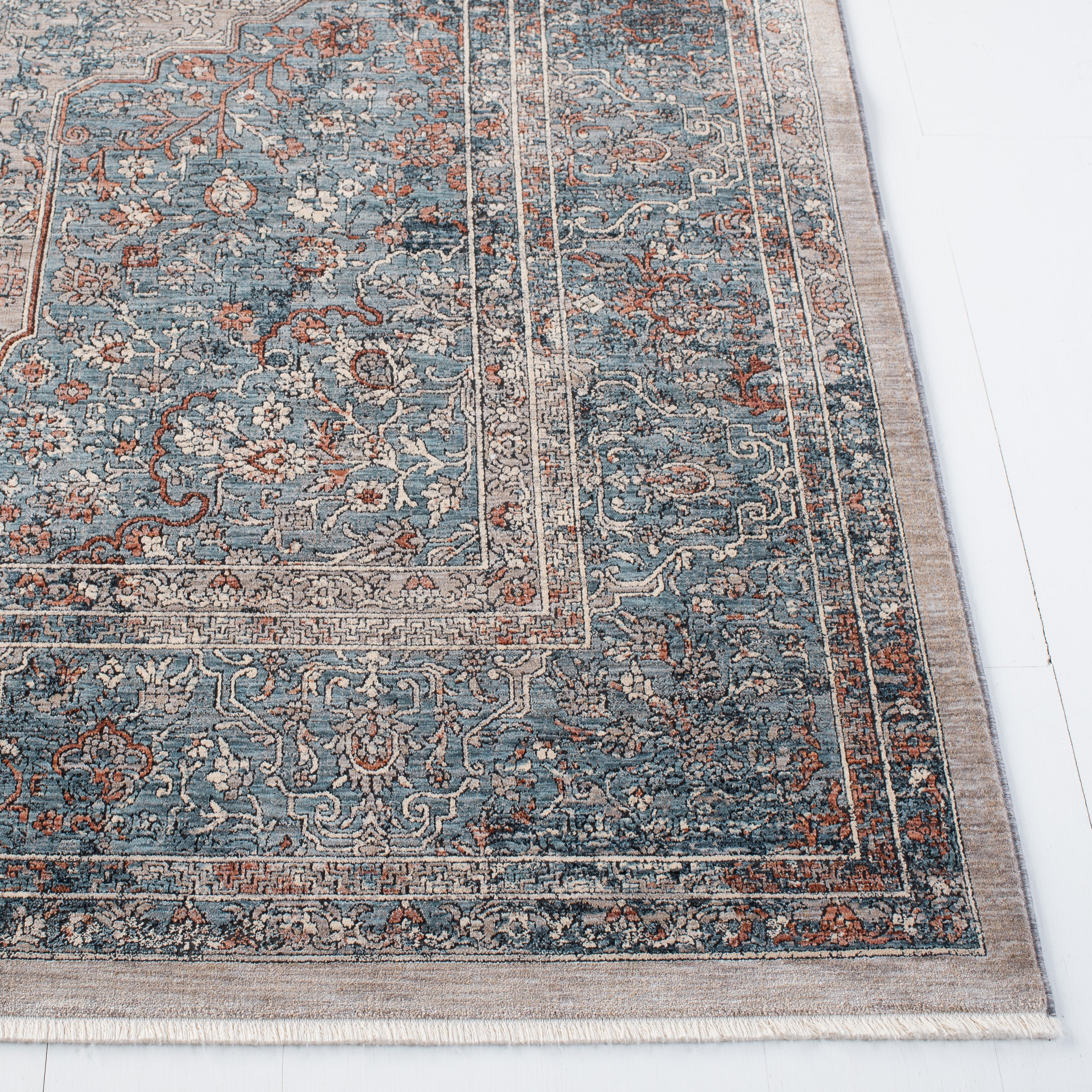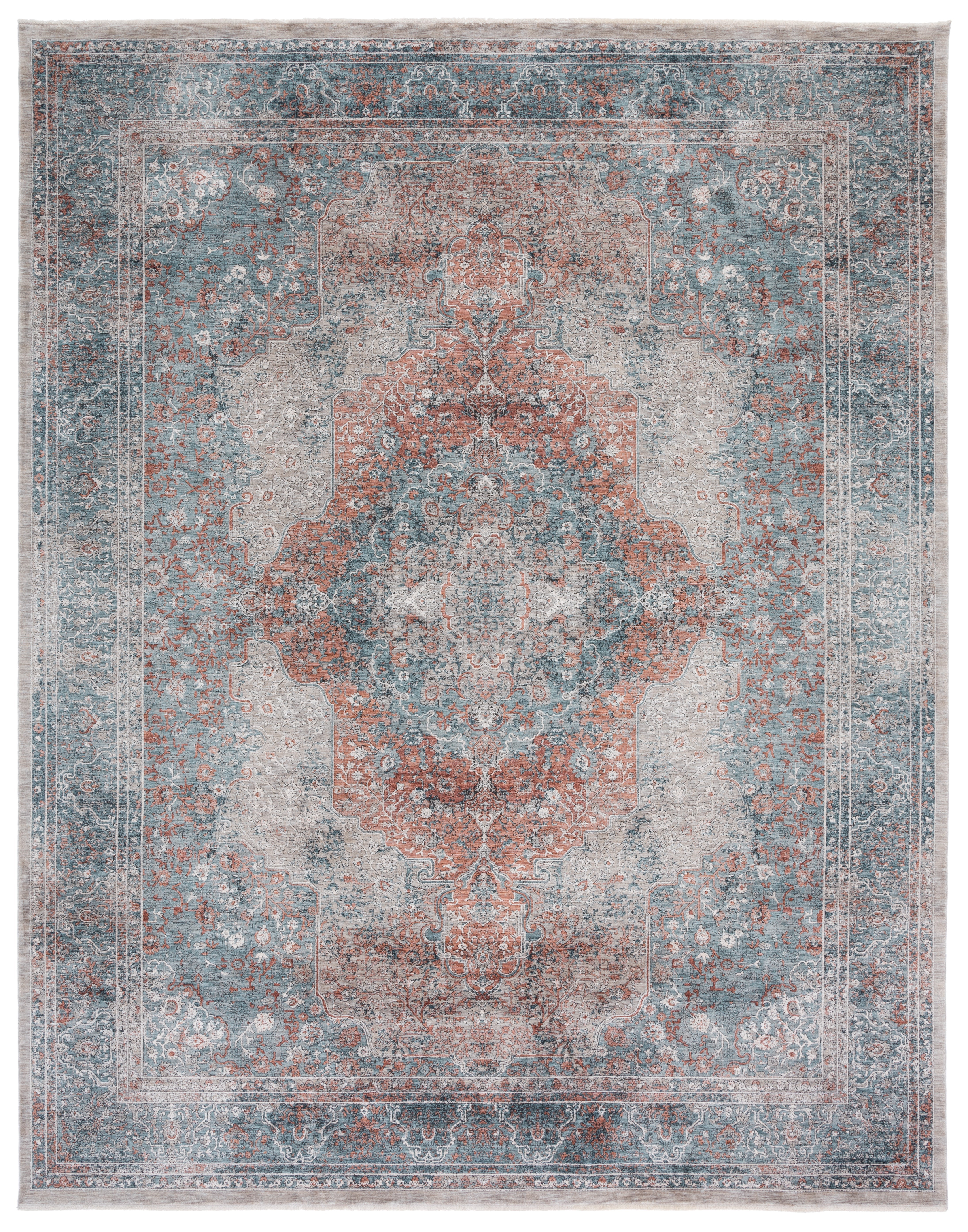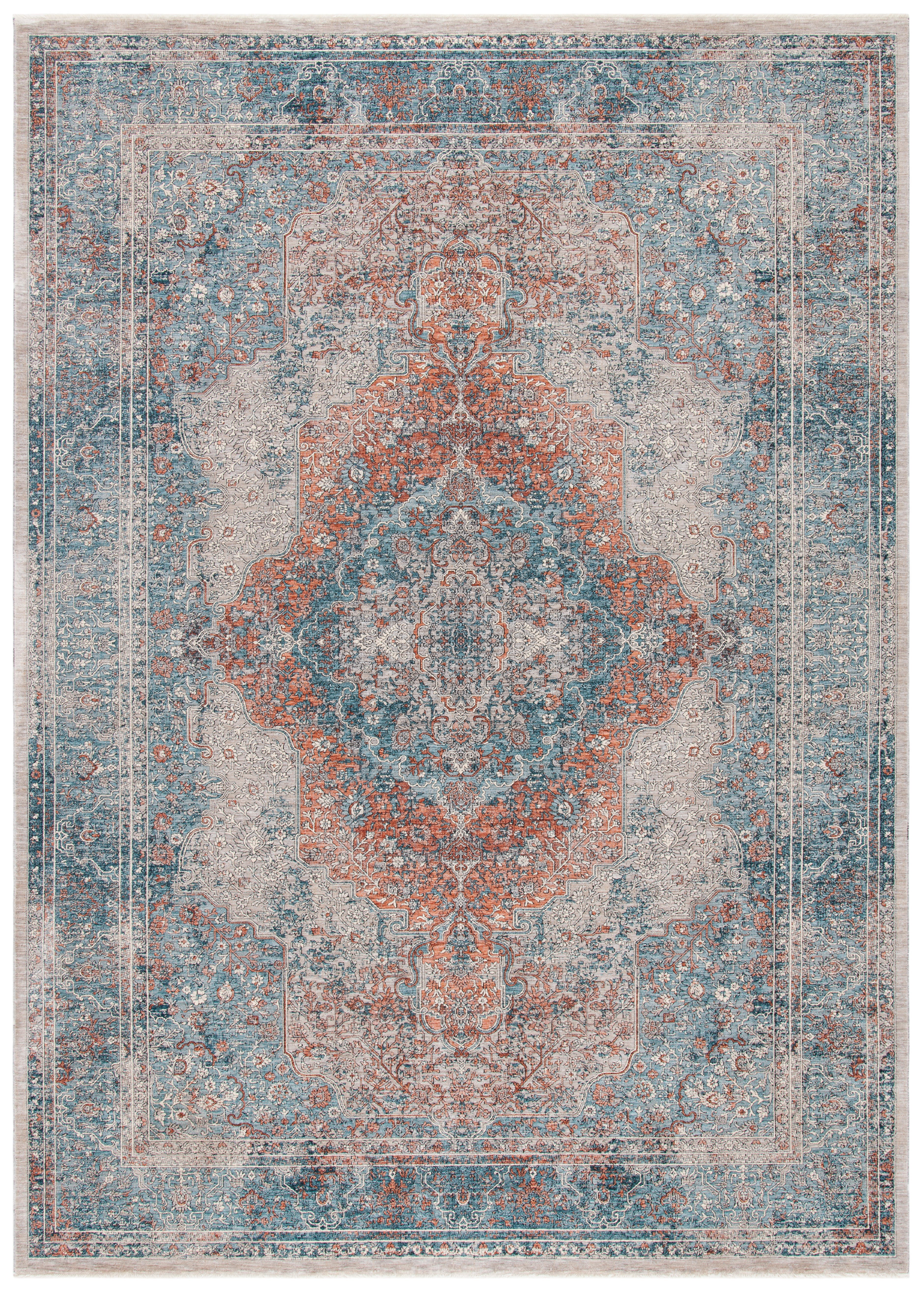 Elevate your living space with the timeless elegance of our Transitional style area rug, spanning an impressive 9 feet 8 inches by 13 feet. This large rectangular rug is an exquisite blend of BLUE and RUST hues, creating a vibrant yet sophisticated atmosphere in any room. Masterfully constructed in Turkey using the latest Power Loomed techniques, our rug boasts a low pile height of 1/4 inch for a sleek profile and easy maintenance. The premium blend of 70% Polyester and 30% Acrylic ensures durability and a soft underfoot experience, suitable for high-traffic areas and busy households. Adorning this rug is a captivating pattern featuring intricate motifs and floral elements, artfully distressed to merge modern design with classic beauty. The OEKO-TEX certification further ensures that every fiber is tested for harmful substances, providing peace of mind for you and your family. Add warmth and style to your home with this luxurious rug, promising to be a focal point that is both visually stunning and comfortably practical.