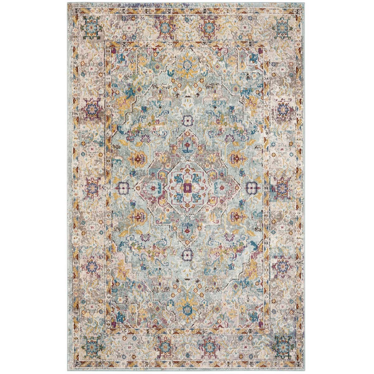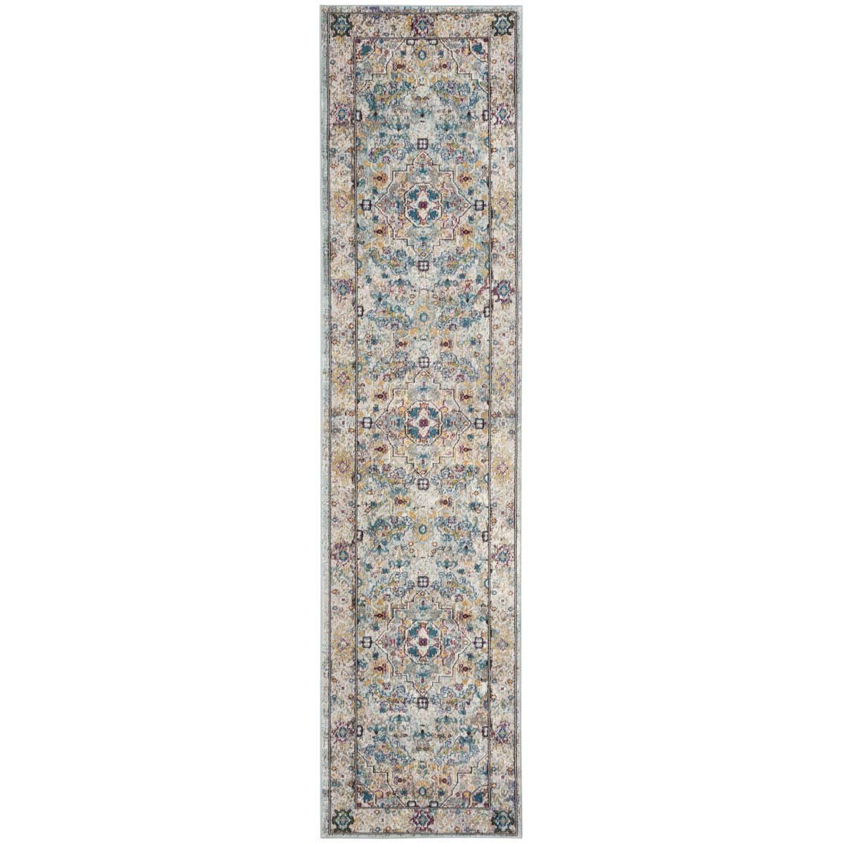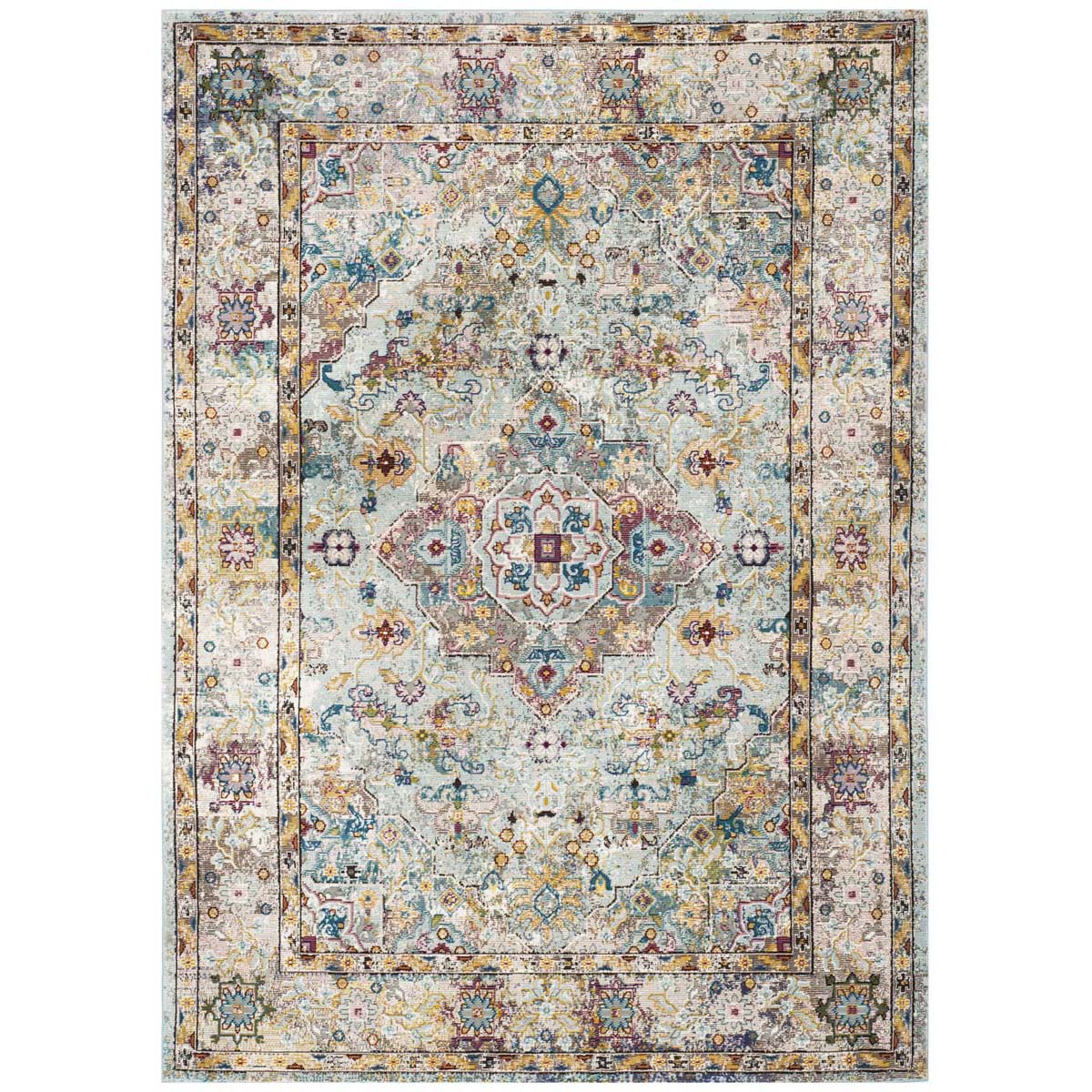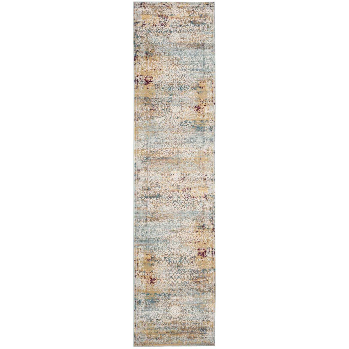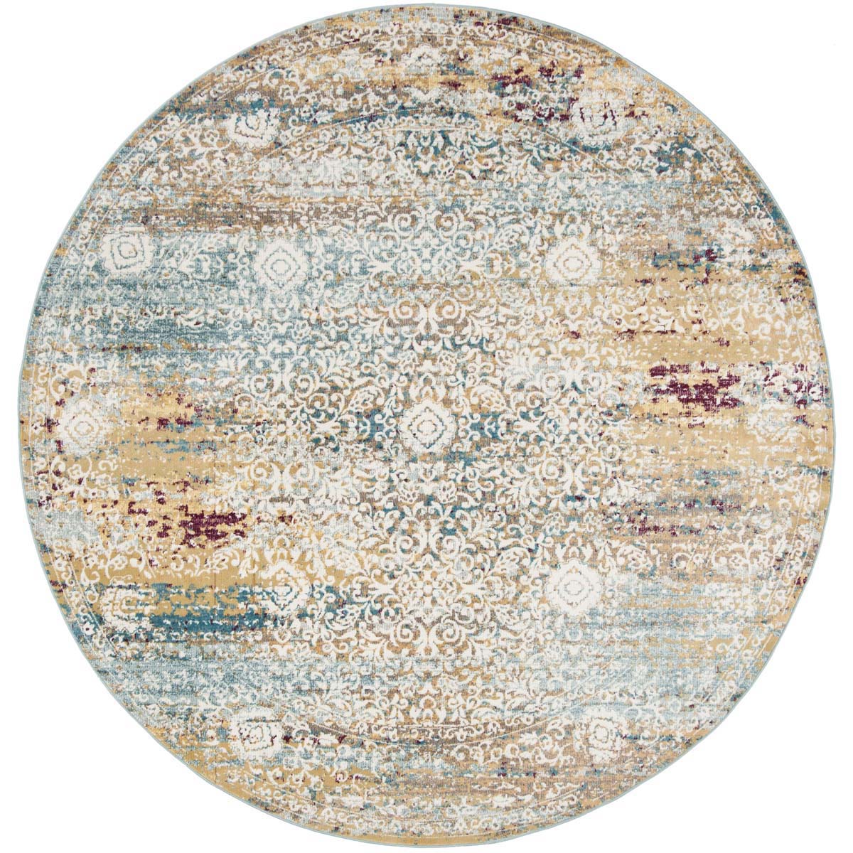 Designed with a sophisticated transitional style, it seamlessly blends traditional charm with contemporary flair, making it a versatile addition to any decor. The rug features a harmonious blend of beige and blue tones that are accented with subtle hints of gold, red, and green, creating a rich yet understated backdrop that complements a variety of color schemes.