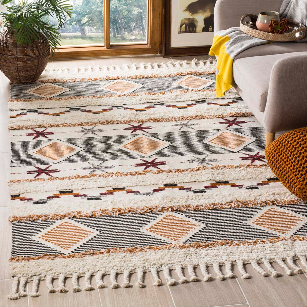 Add a well-traveled look to any room with artfully detailed Kenya collection rugs. Hand-knotted of pure wool in un-dyed natural shades or vibrant colors, the layers of texture in these tribal designs are achieved with thick, over-stitched cut pile yarns.