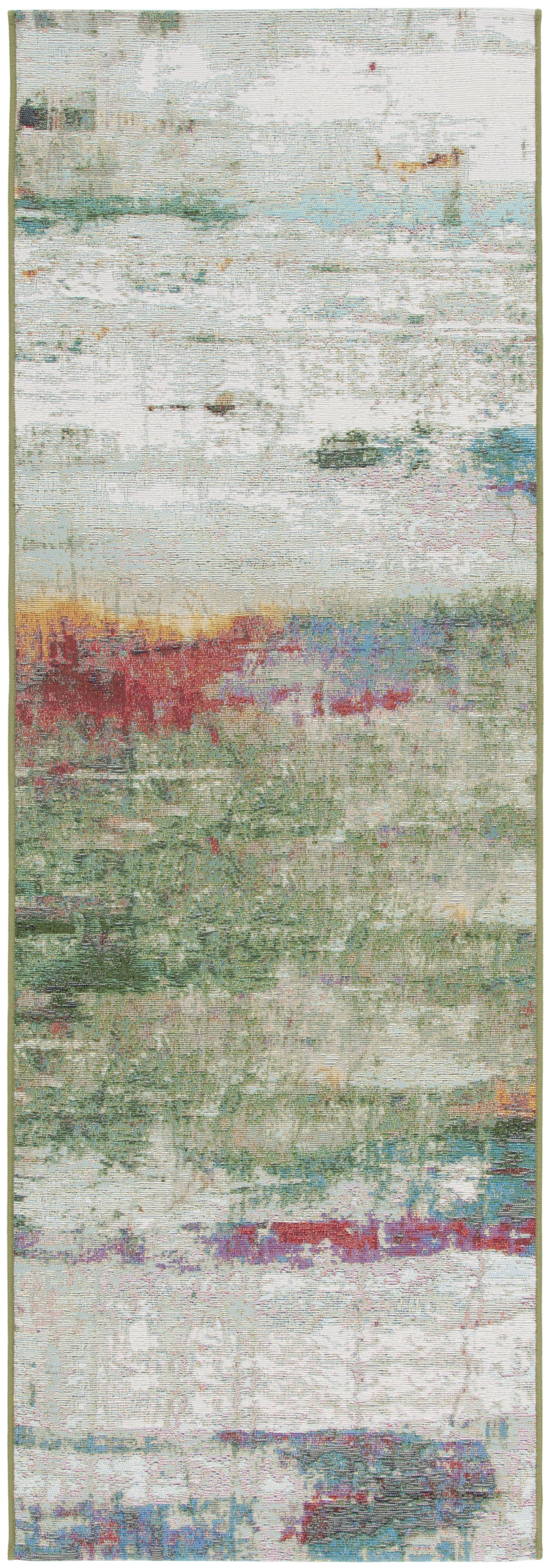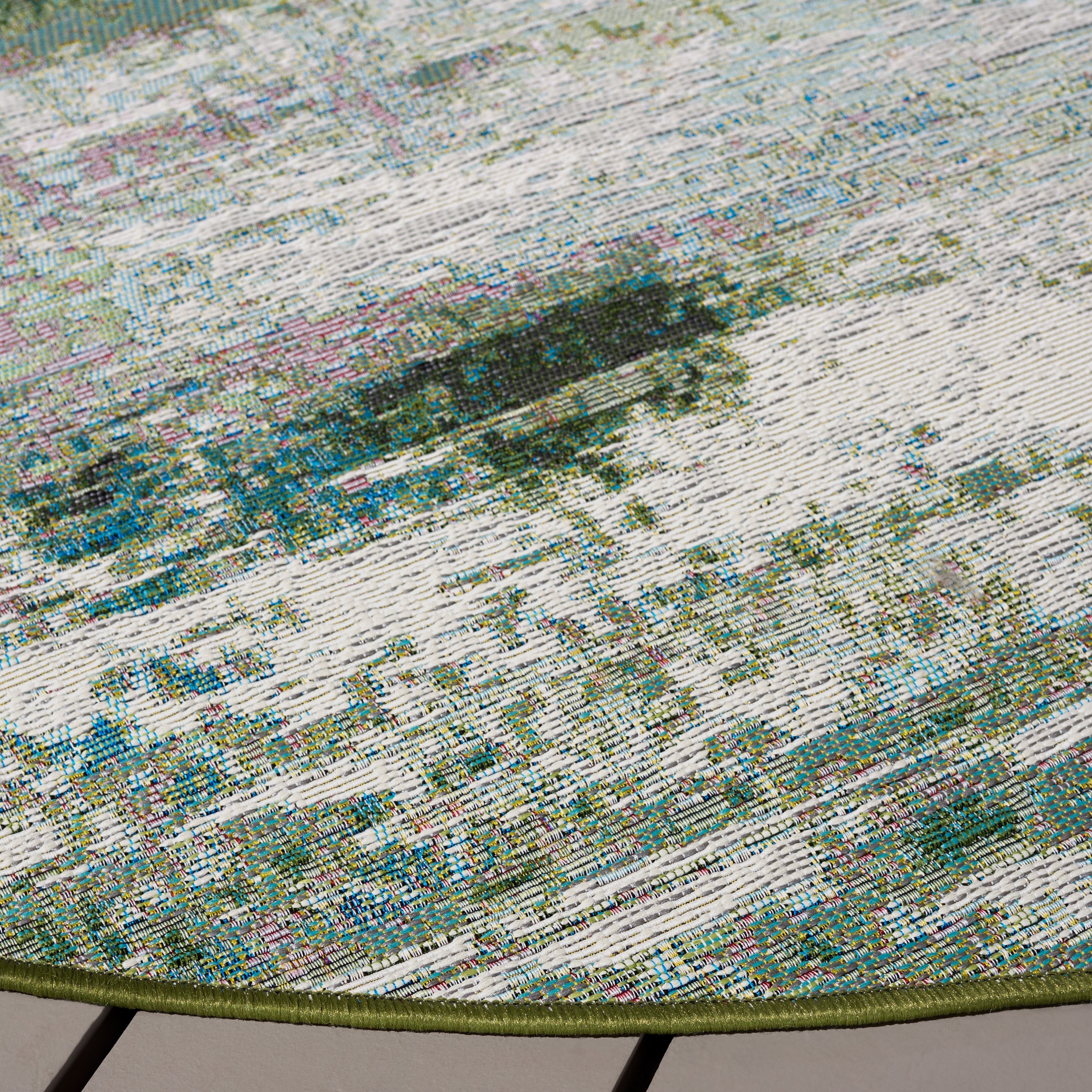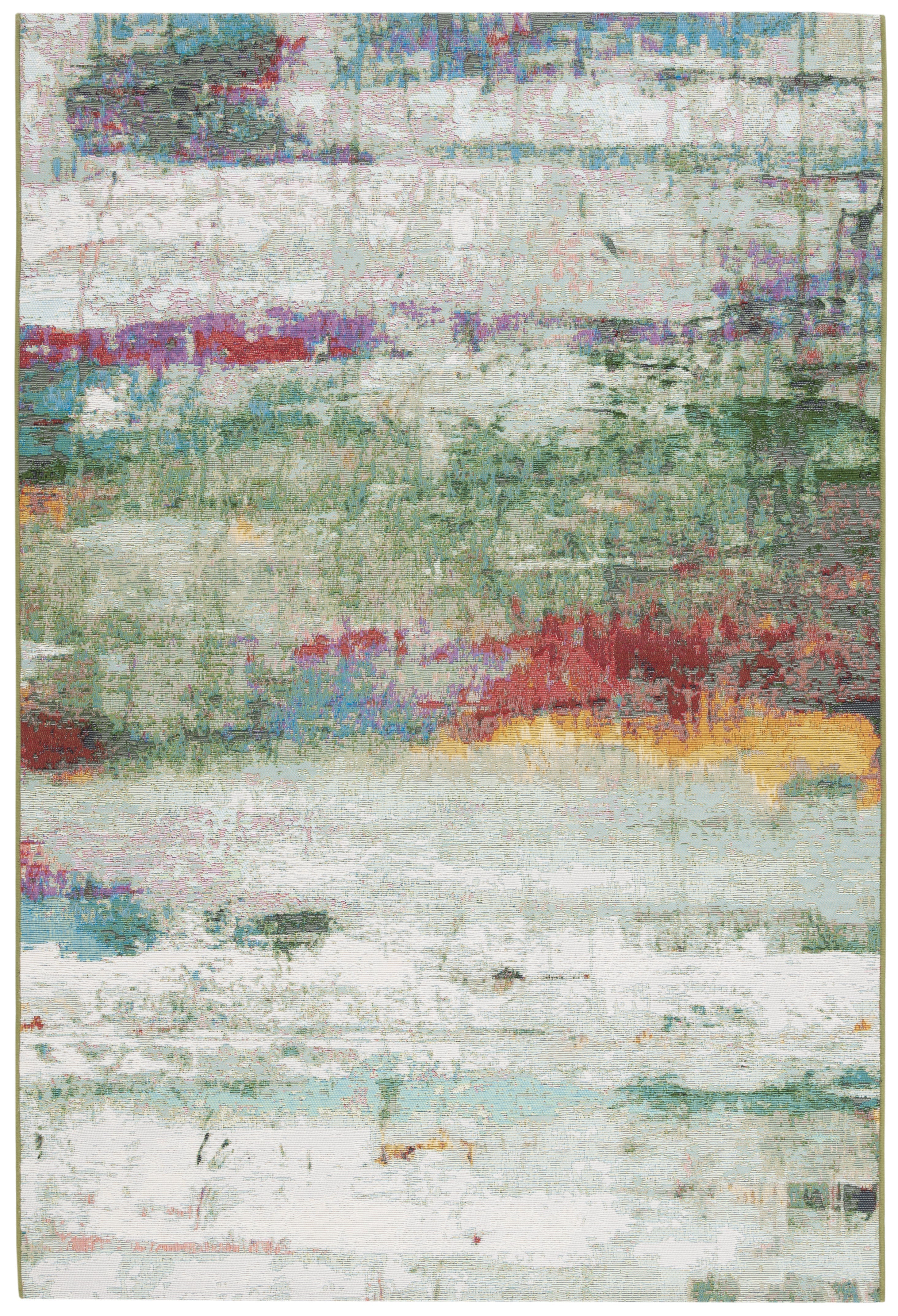 Elevate your space with the exquisite artistry and vibrant charm of our Power Loomed Indoor/Outdoor Rug. This stunning piece, meticulously crafted in Egypt, features a dynamic interplay of GREEN, BLUE, and PURPLE hues, creating an abstract expressionist tapestry that will infuse your home with contemporary elegance.