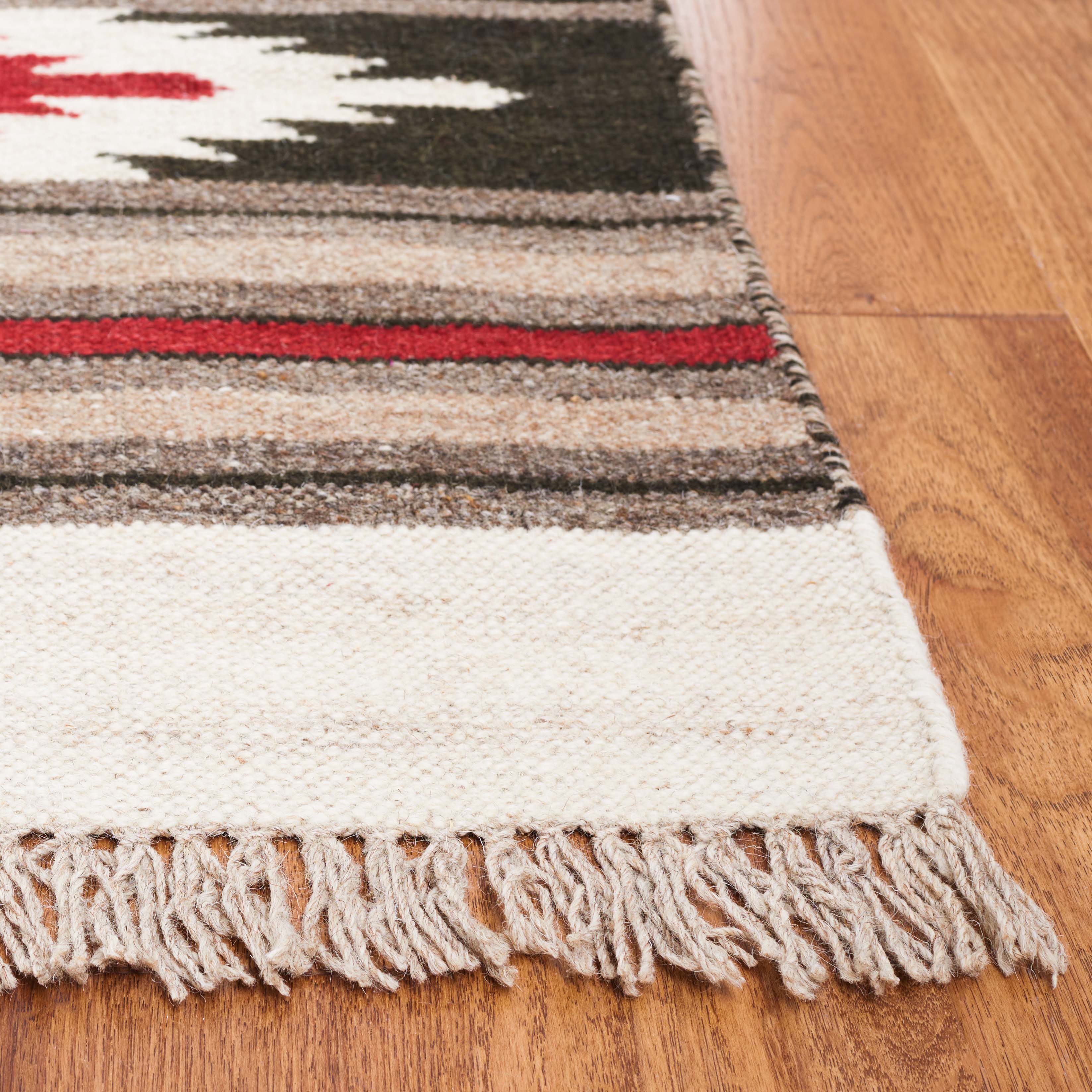 Constructed from high-quality wool, this rug not only brings a touch of natural luxury but is also durable enough for everyday use. The rug's pattern features a rich tapestry of traditional motifs, incorporating earthy tones juxtaposed with bold red accents to create a visually stunning centerpiece.