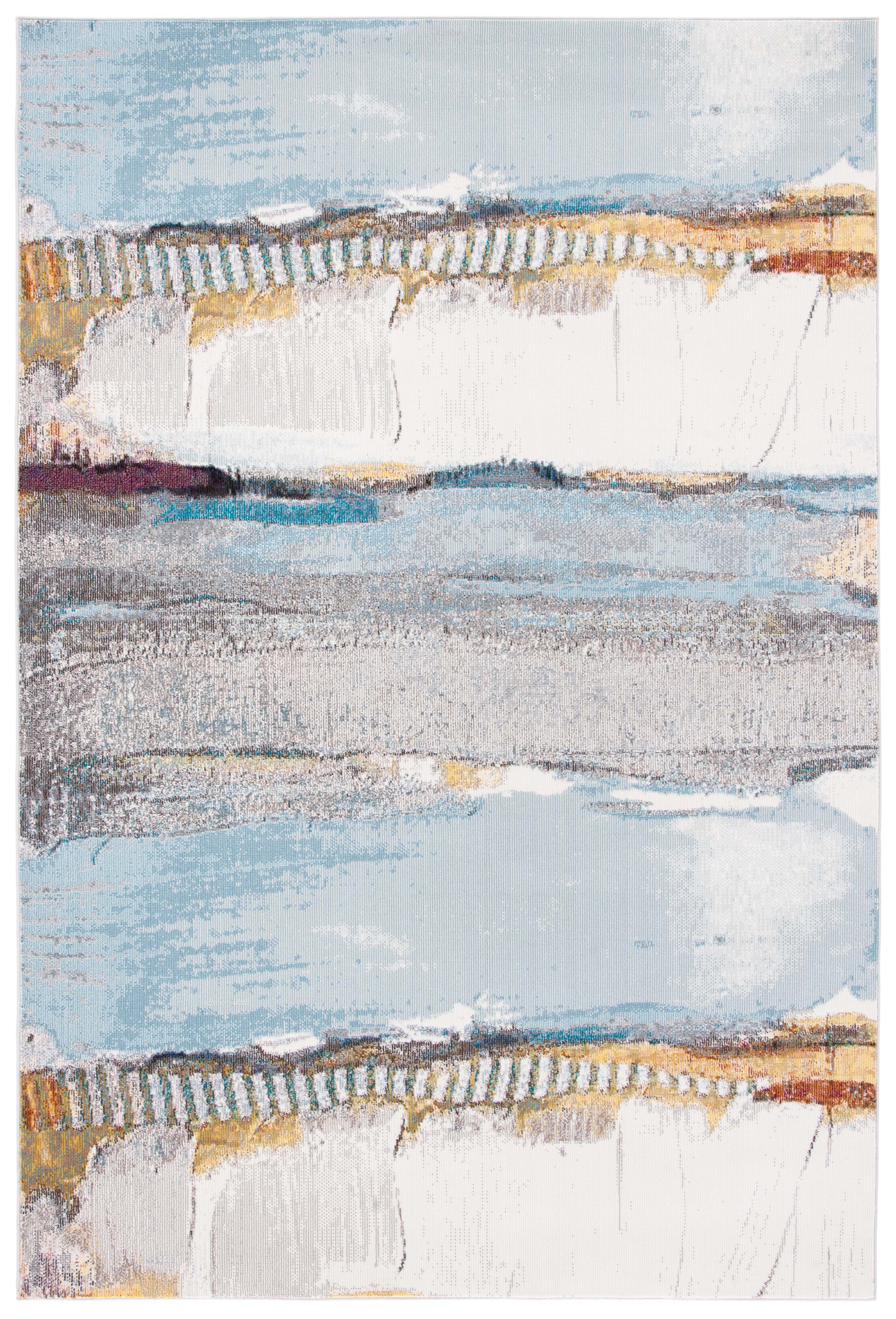 The rug's design features a harmonious blend of ivory and light blue hues, creating a serene yet eye-catching pattern that exudes tranquility and elegance. The image showcases a distinct pattern, reminiscent of abstract art, with strokes of gray and touches of warmer tones that add depth and complexity to its visual appeal.