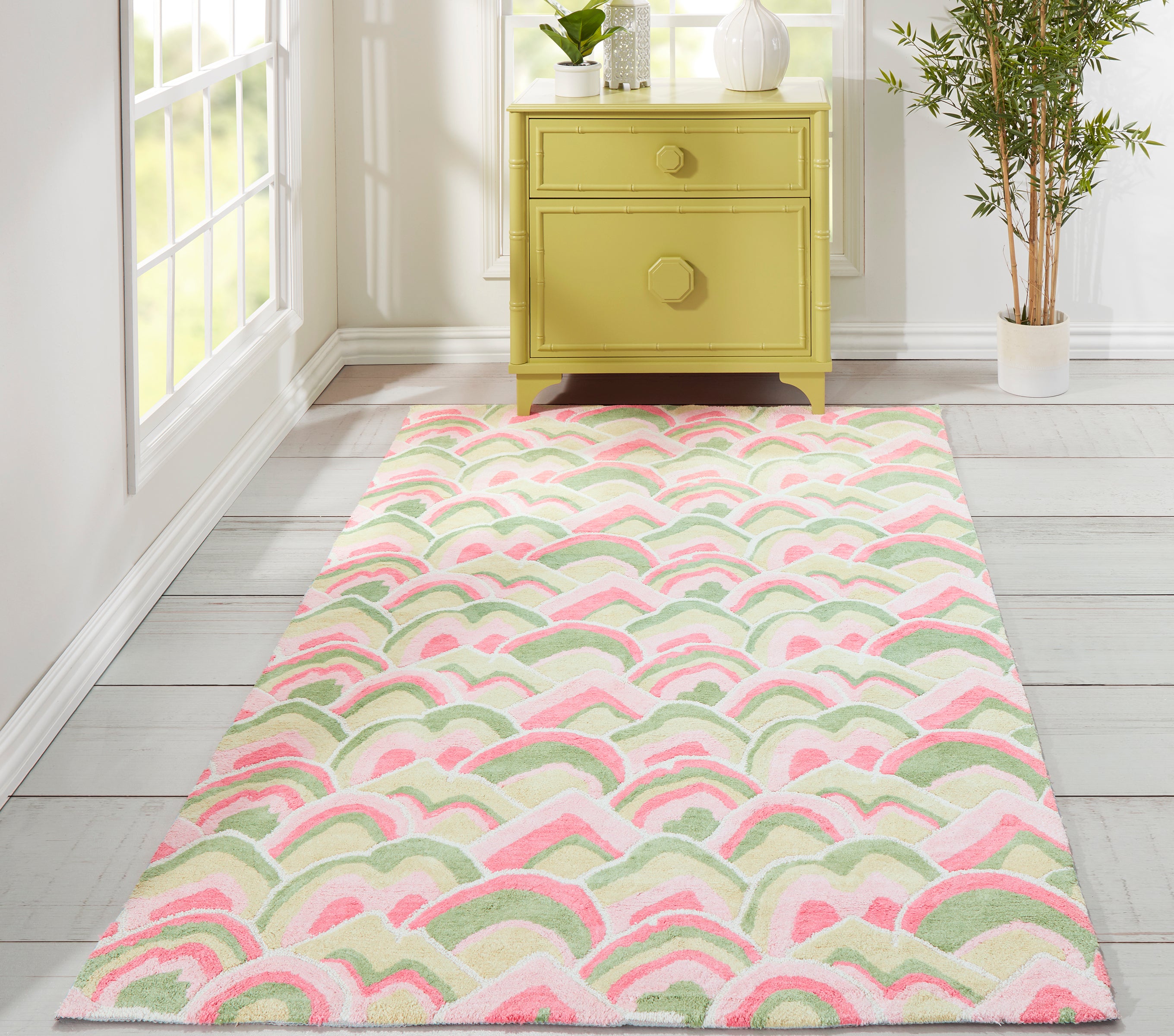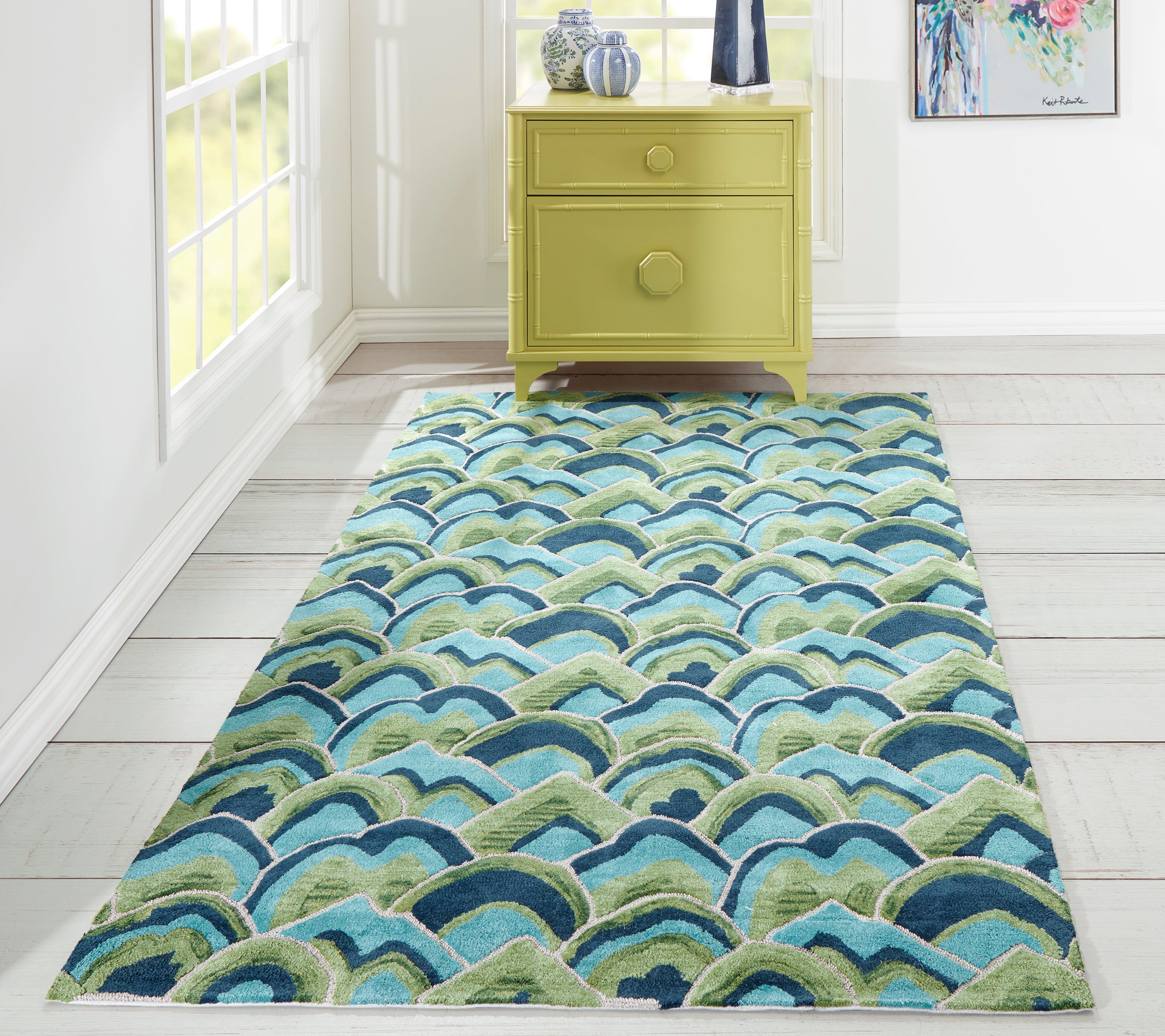Painterly perspectives fill the field of this Madcap Cottage by Momeni rug collection with ornamental grandeur. Each carpet becomes a canvas for vivid watercolor designs as hand-tufted techniques transform natural cotton fibers into elegant tapestries fit for every floor. Lush mountainscapes and overlapping scallop designs suggest traditional chinoiserie motifs while a verdant color palette carries the classical design themes into the present. Bring the adventure home.