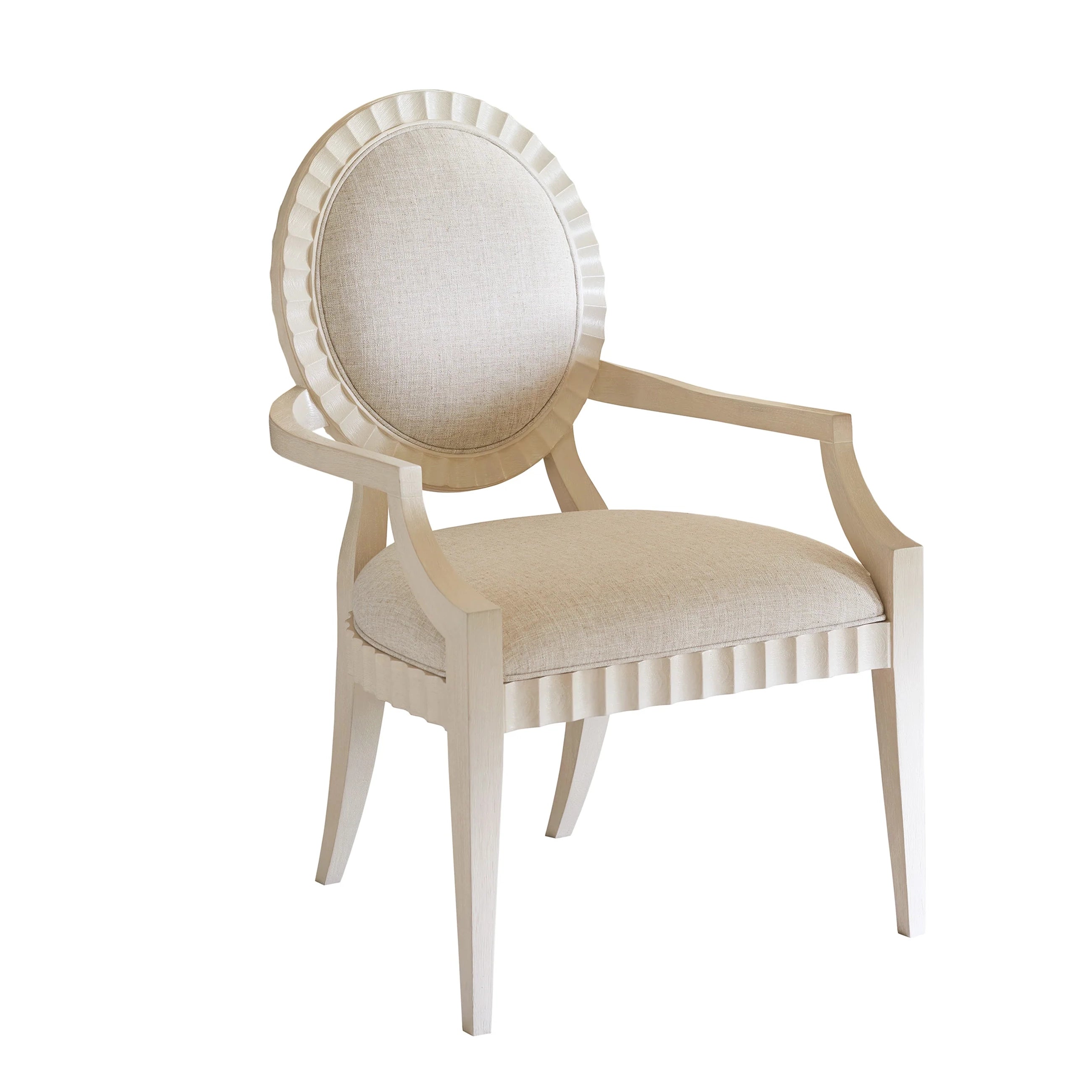 The scallped outside back and apron reflect the sunburst dimensional outback of the chair. The upholstered inside back and seat are standard in 222111 Chatfield, a wheat colored indoor performance fabric featuring a linen weave construction with a soft hand. You may customize as item 310-937 or choose the Preston game chair with casters, same silhouette. Inspired by the timeless elegance of Hollywood Regency and Art Deco styling, designs in Cascades feature scalloped detailing that accentuates the graceful lines and curved fronts that define the distinctive look. Crafted from white oak veneers, pieces are lightly wire-brushed and finished in a fresh linen-white coloration with custom hardware and finials in brushed nickel.
