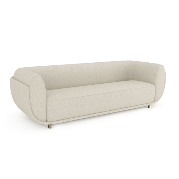 The serenity of this fully-upholstered sofa starts with the use of calming Ivory mélange performance bouclé fabric surrounding a generous bolster back and deep, long seat. The back and seat are nestled into a bouclé-wrapped frame that curves around the back and sides and along the bottom of the piece creating a nesting effect. This low piece rests on short, round peg legs in Brushed Champagne Gold.