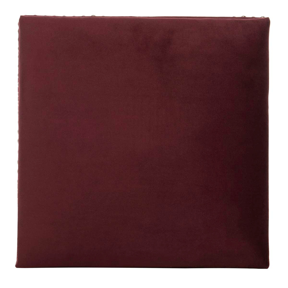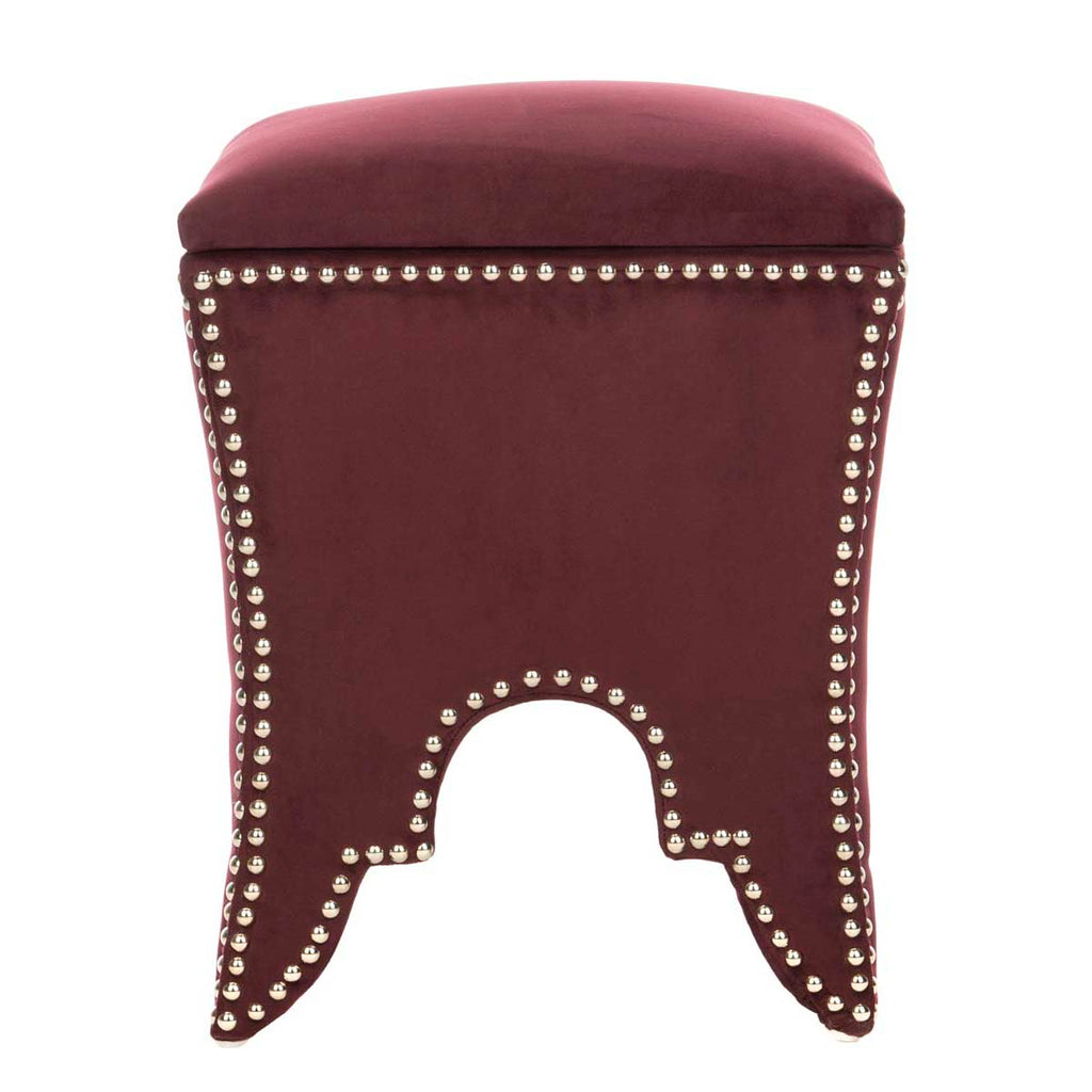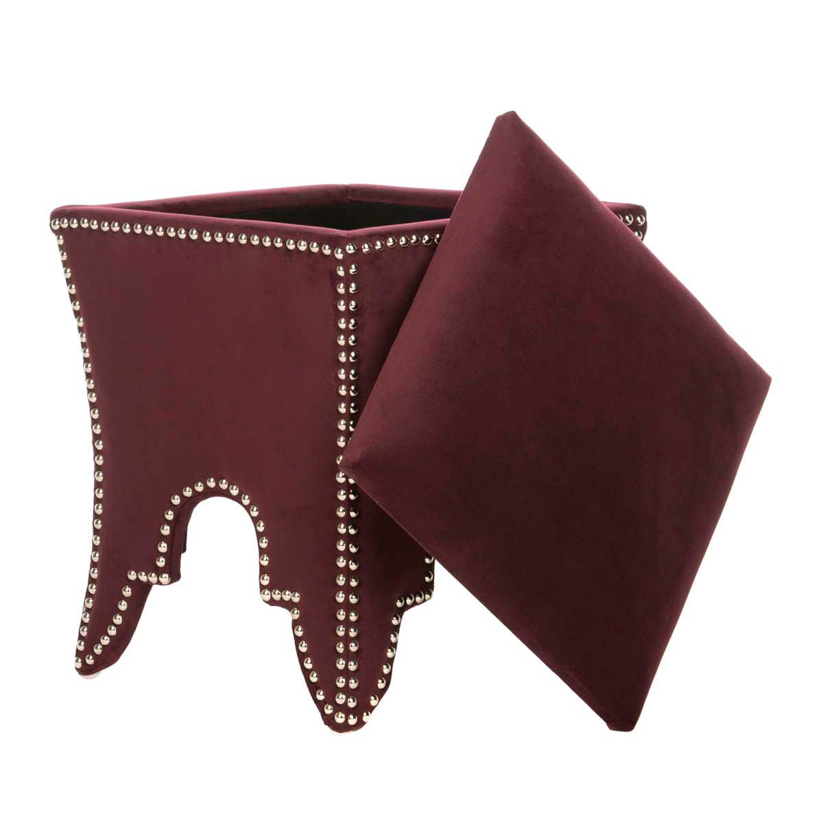The chic Deidra Ottoman recalls Spanish architecture with its cutout arch studded with silver nail heads. Beautifully upholstered in Bordeaux cotton velvet, this stylish accent provides glamour with hidden storage beneath its removable cushion top.