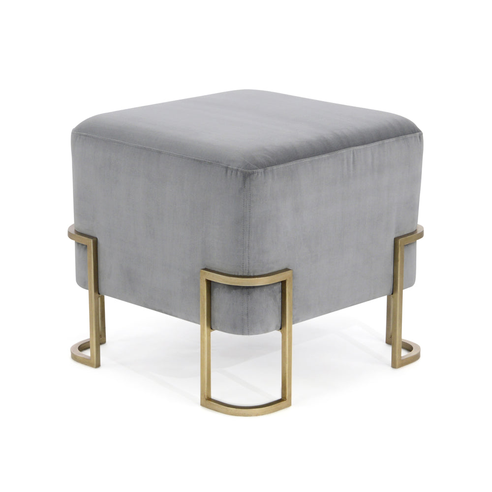 An upholstered square pouffe sits on four frame legs that curve neatly around each corner. The frame legs are finished with a gold glaze over silver leaf, and the pouffe is covered in a soft grey velvet fabric.
