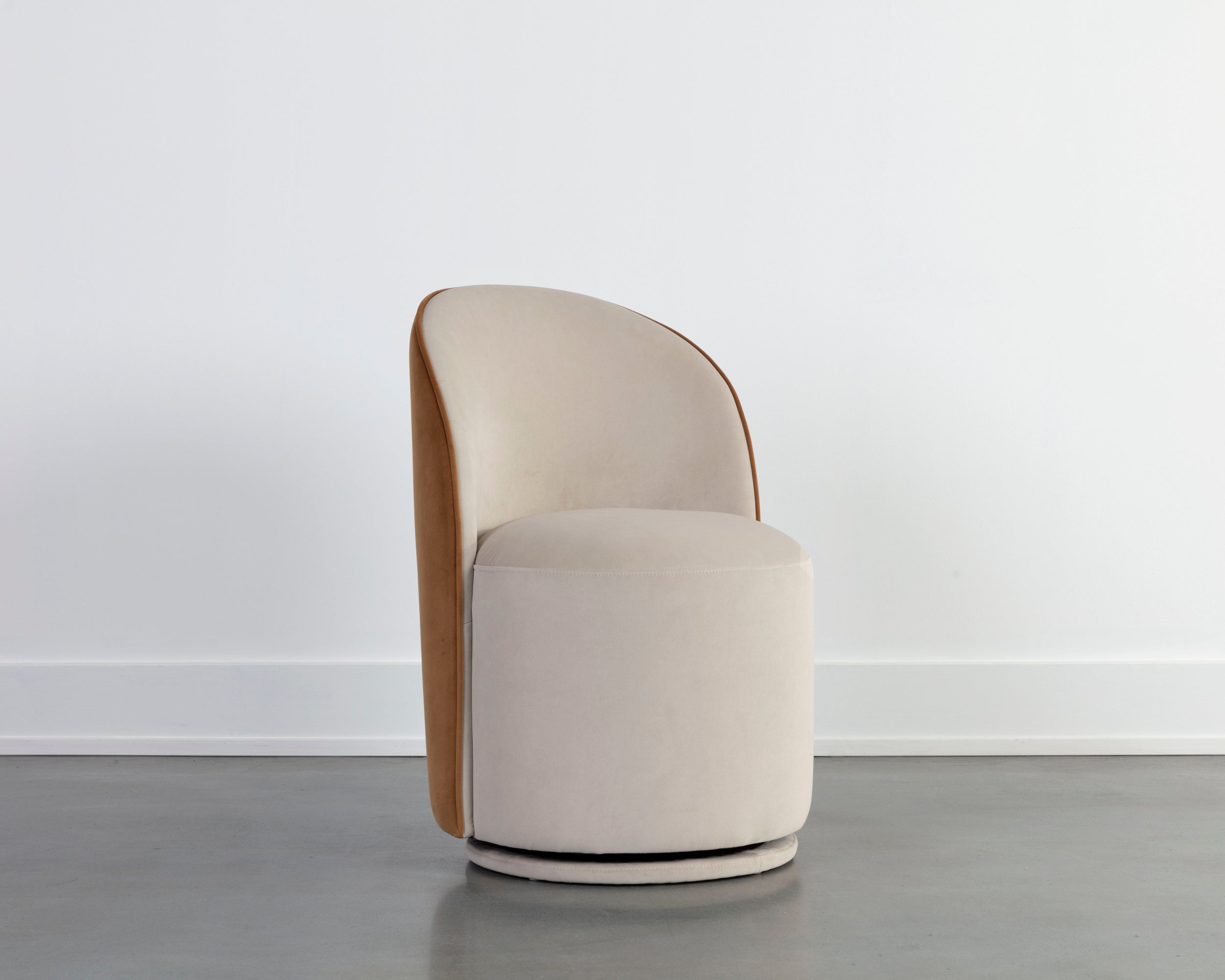 The Cavoli Swivel Dining Chair is distinguished by its curved silhouette. Fully upholstered in our meg taupe and gold fabrics for a contrasting look.