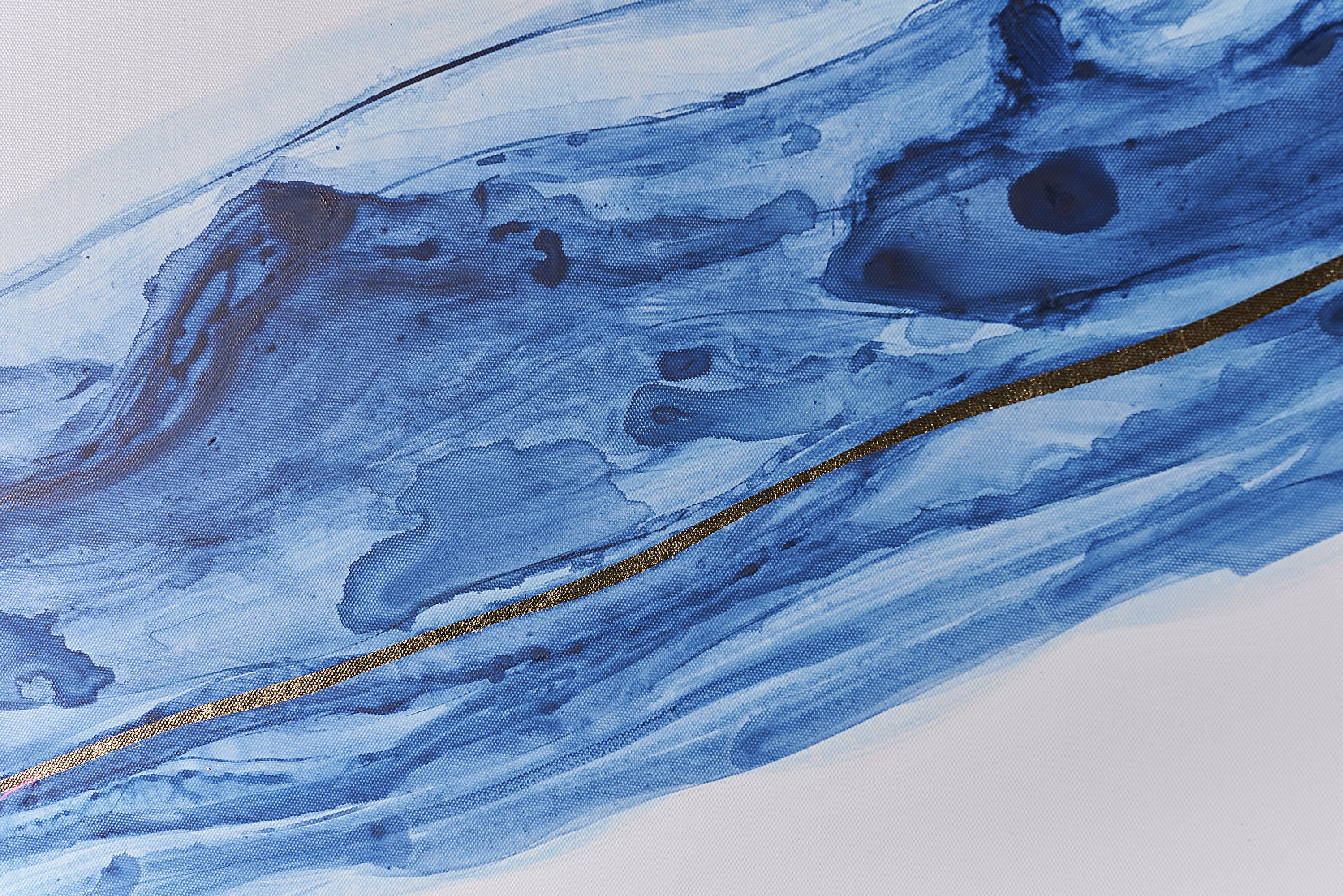 This diptych painting creates a refreshing mood with dramatic blue and gold strokes similar to flowing water. Features a gold finished floater frame. Each artwork is hand-painted and will feature slight variations that make every piece unique.