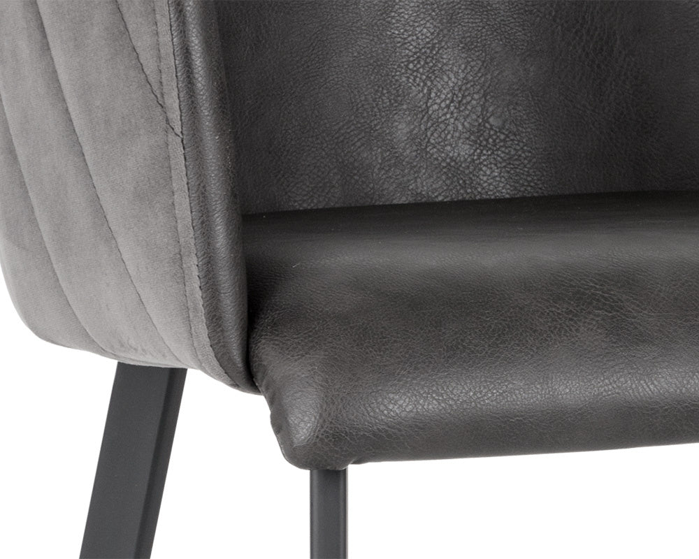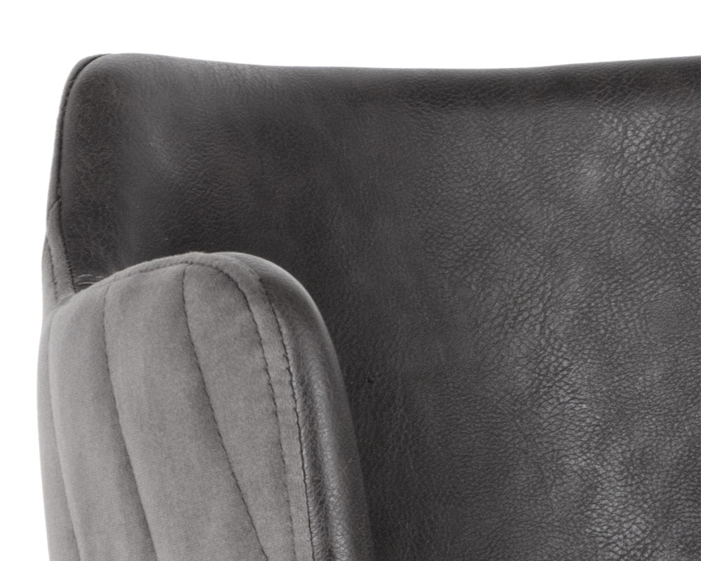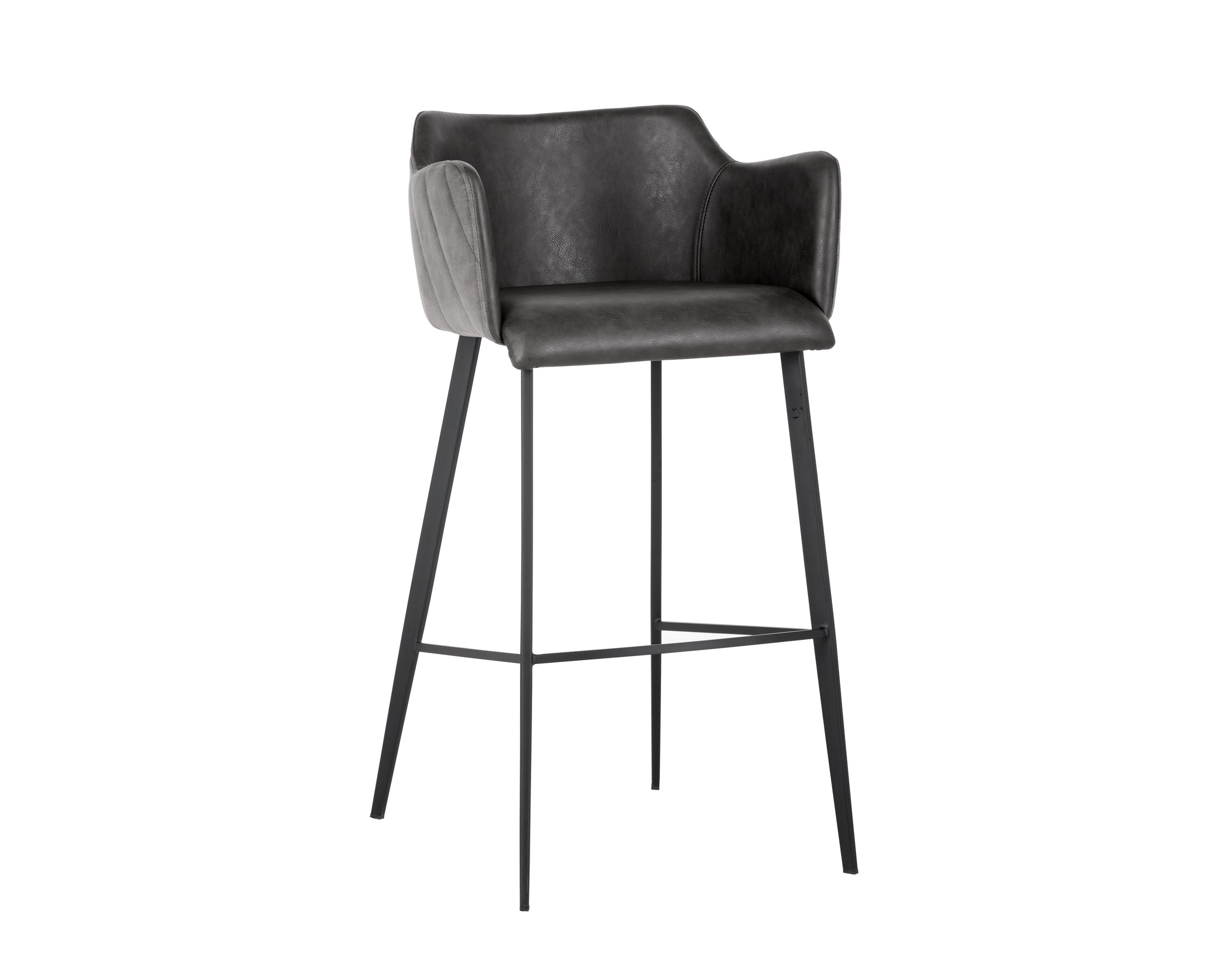 This modern barstool will provide comfort and style to any residential or commercial space. Features an interior seat in town grey faux leather and contrasting channel stitched exterior seatback in roman grey fabric. Finished with sturdy black powder-coated iron legs. Suitable for various dining, kitchen and bar spaces of all sizes. Handle With Care: This design has been crafted with faux leather. Faux leather is manufactured to reflect the natural characteristics of leather; as such, colour variations, markings, wrinkles, grooves, and light scratches are appreciated characteristics. No two pieces will be alike. Visit our Product Care page for more information on how to ensure the lasting beauty of this piece.