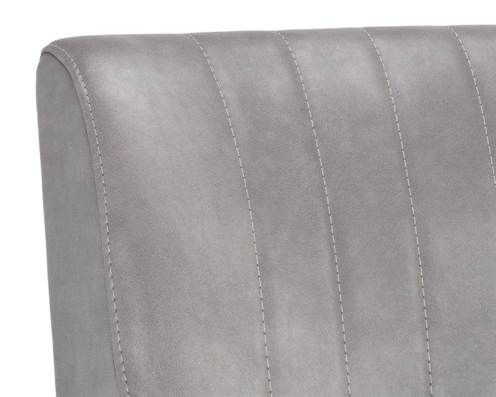 An urban designed stool featuring bold vertical channel tufting on the seat and back in bravo metal faux leather. Finished with a rustic bronze steel frame and stretchers. Great for residential and commercial placements. Suitable for various dining, kitchen and bar spaces of all sizes. Handle With Care: This design has been crafted with faux leather. Faux leather is manufactured to reflect the natural characteristics of leather; as such, colour variations, markings, wrinkles, grooves, and light scratches are appreciated characteristics. No two pieces will be alike. Visit our Product Care page for more information on how to ensure the lasting beauty of this piece.