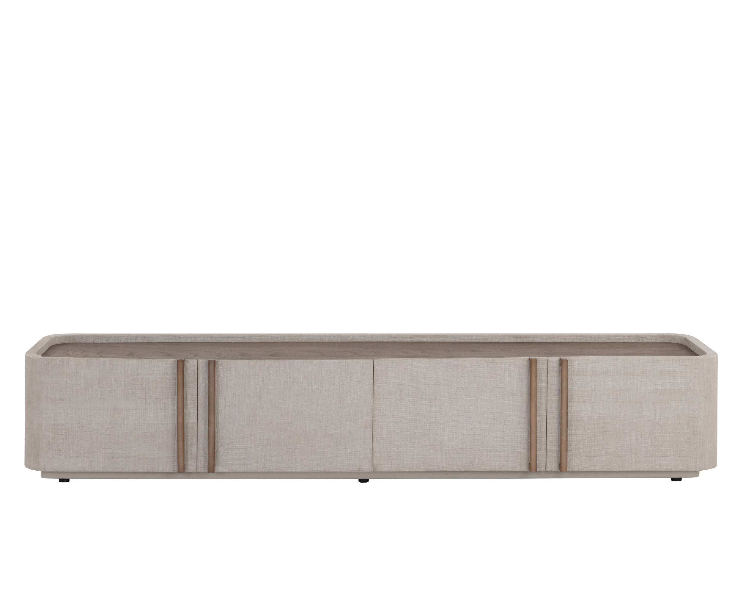 This contemporary media console and cabinet is defined by its beautiful and gentle curves. Upholstered in cream faux leather with a brown oak veneer tabletop that is sure to impress. Includes four cabinets and completed with a warm brass steel base. Coordinating console table, desk, and sideboard also available. Handle With Care: This design has been crafted with faux leather. Faux leather is manufactured to reflect the natural characteristics of leather; as such, colour variations, markings wrinkles, grooves, and light scratches are appreciated characteristics. No two pieces will be alike. Visit our Product Care page for more information on how to ensure the lasting beauty of this piece.