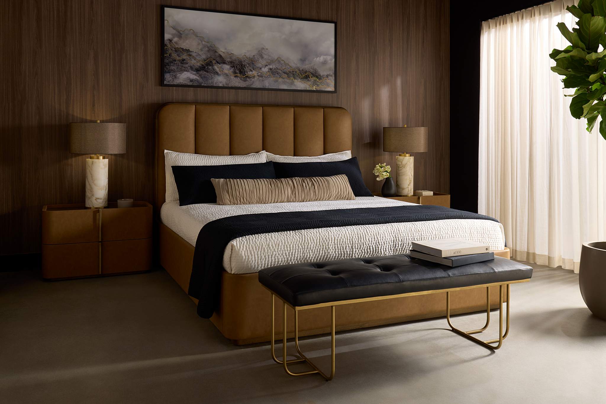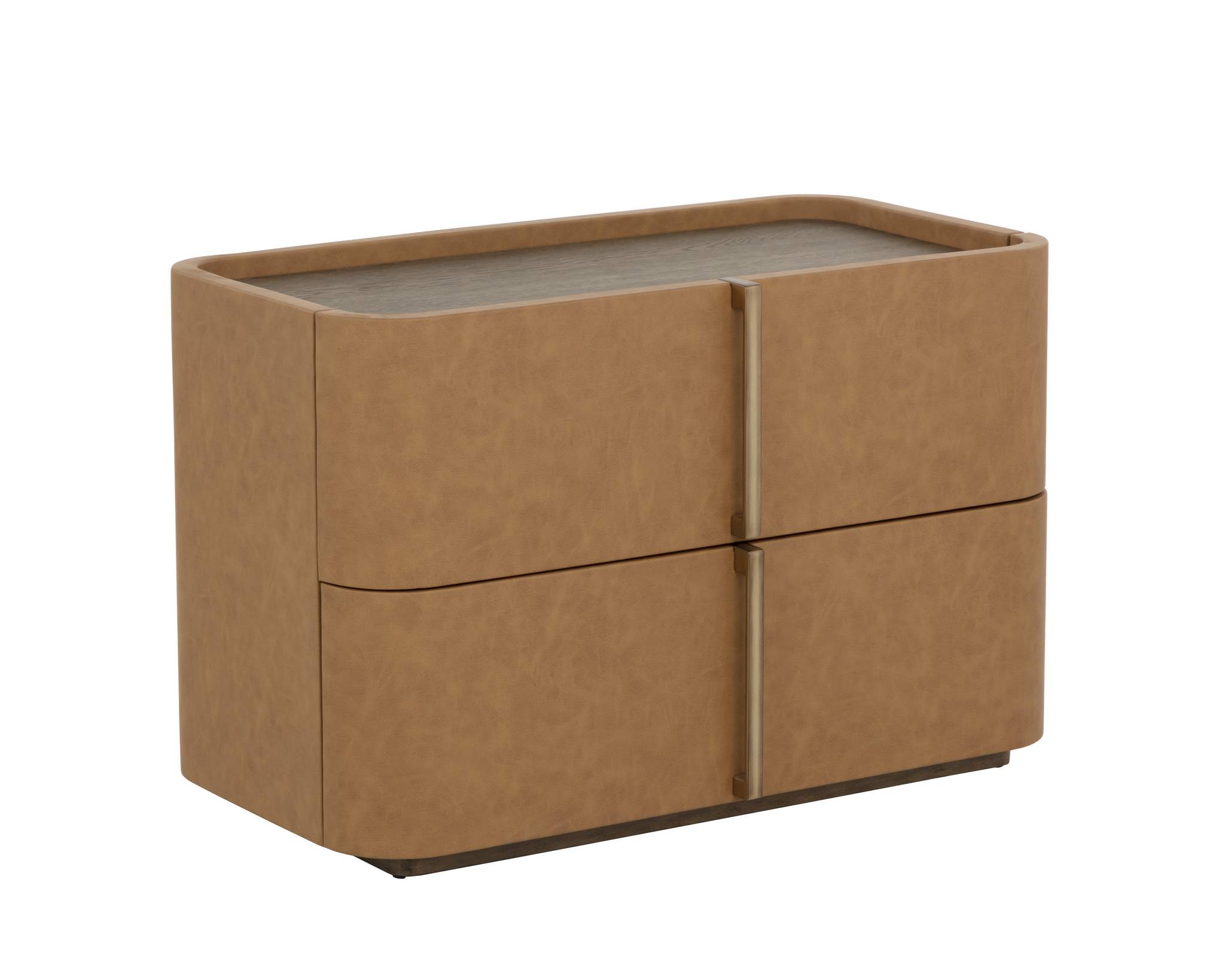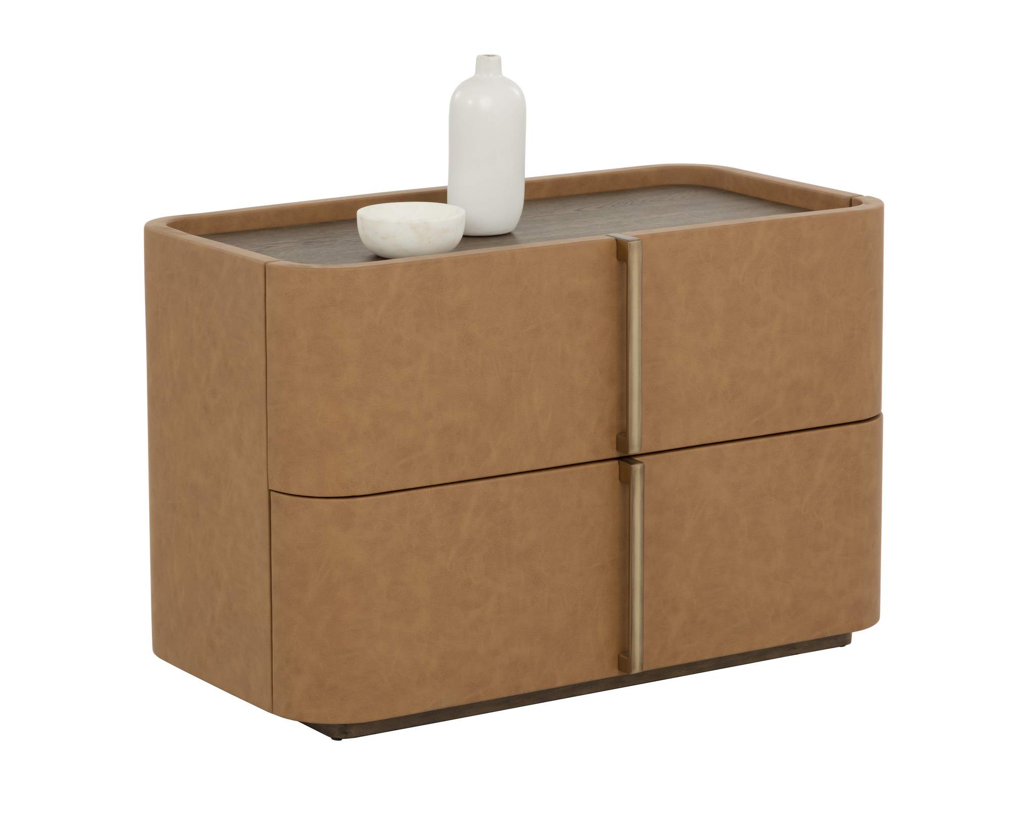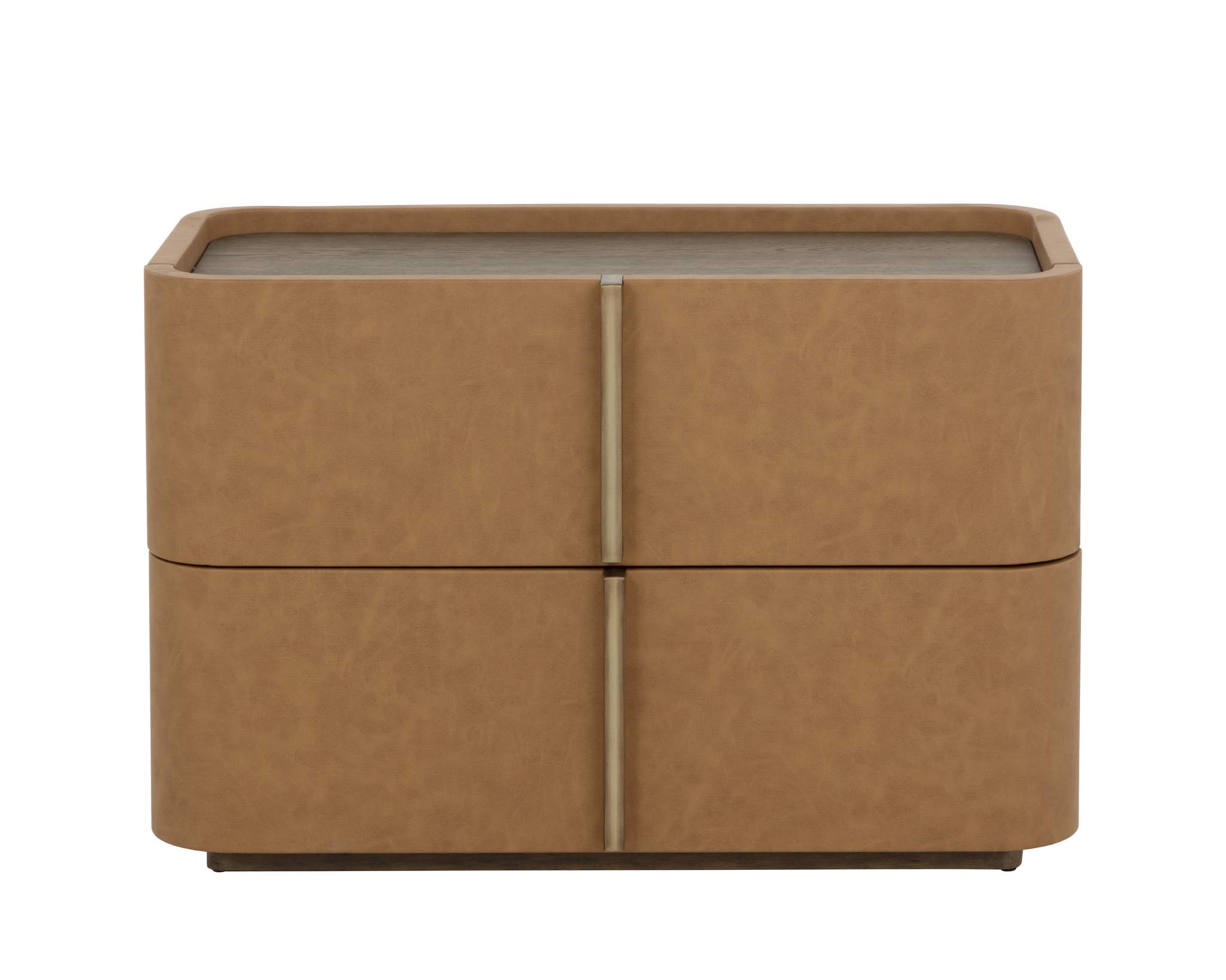 This contemporary large nightstand is defined by its beautiful and gentle curves. Wrapped in miliken cognac faux leather with a brown oak veneer tabletop that is sure to impress. Includes two drawers and completed with a solid acacia wood base.