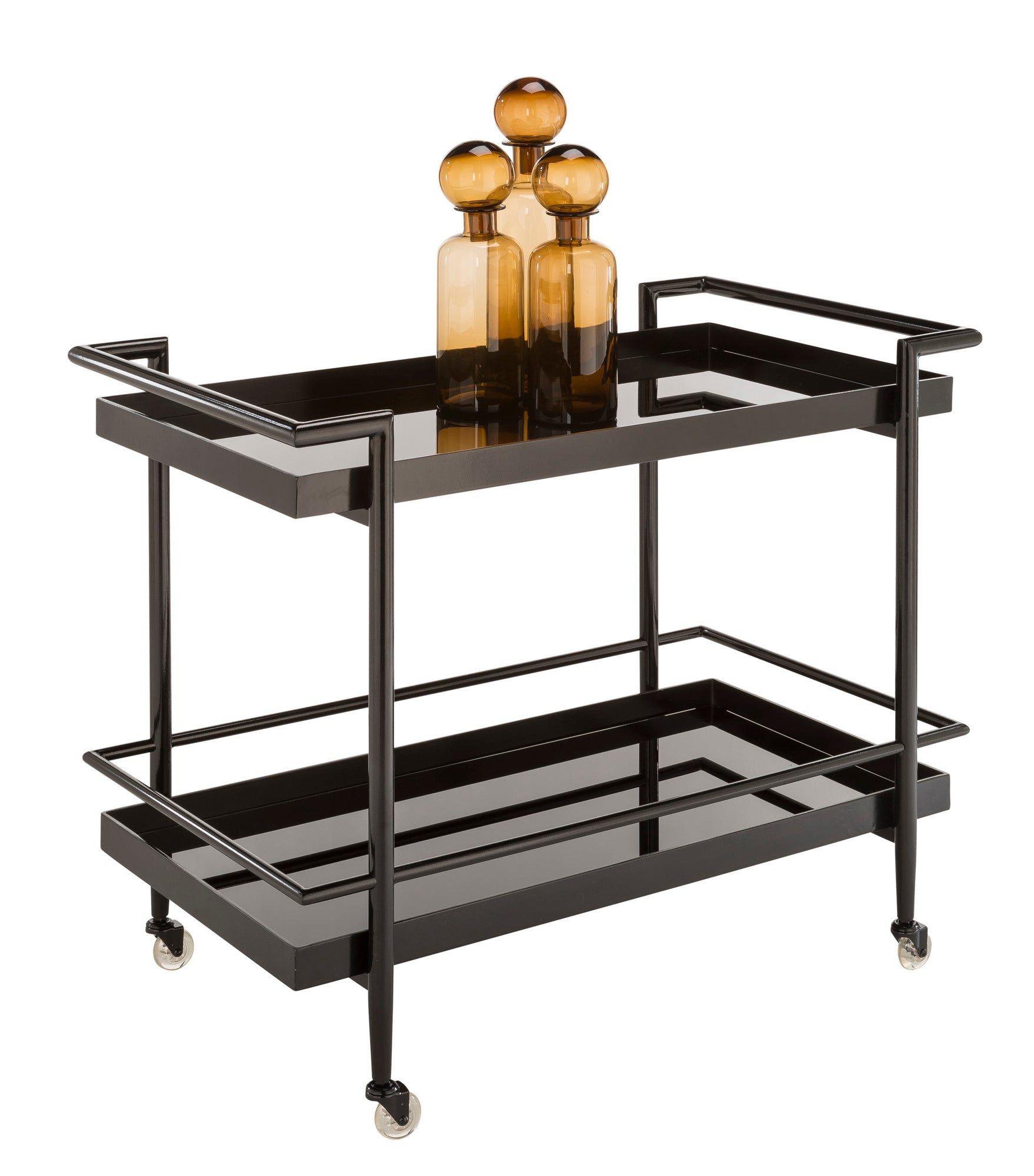 A truly versatile and stylish bar cart featuring sleek, black glass shelving with a black stainless steel tubular frame and legs. Castors allow for easy mobility.