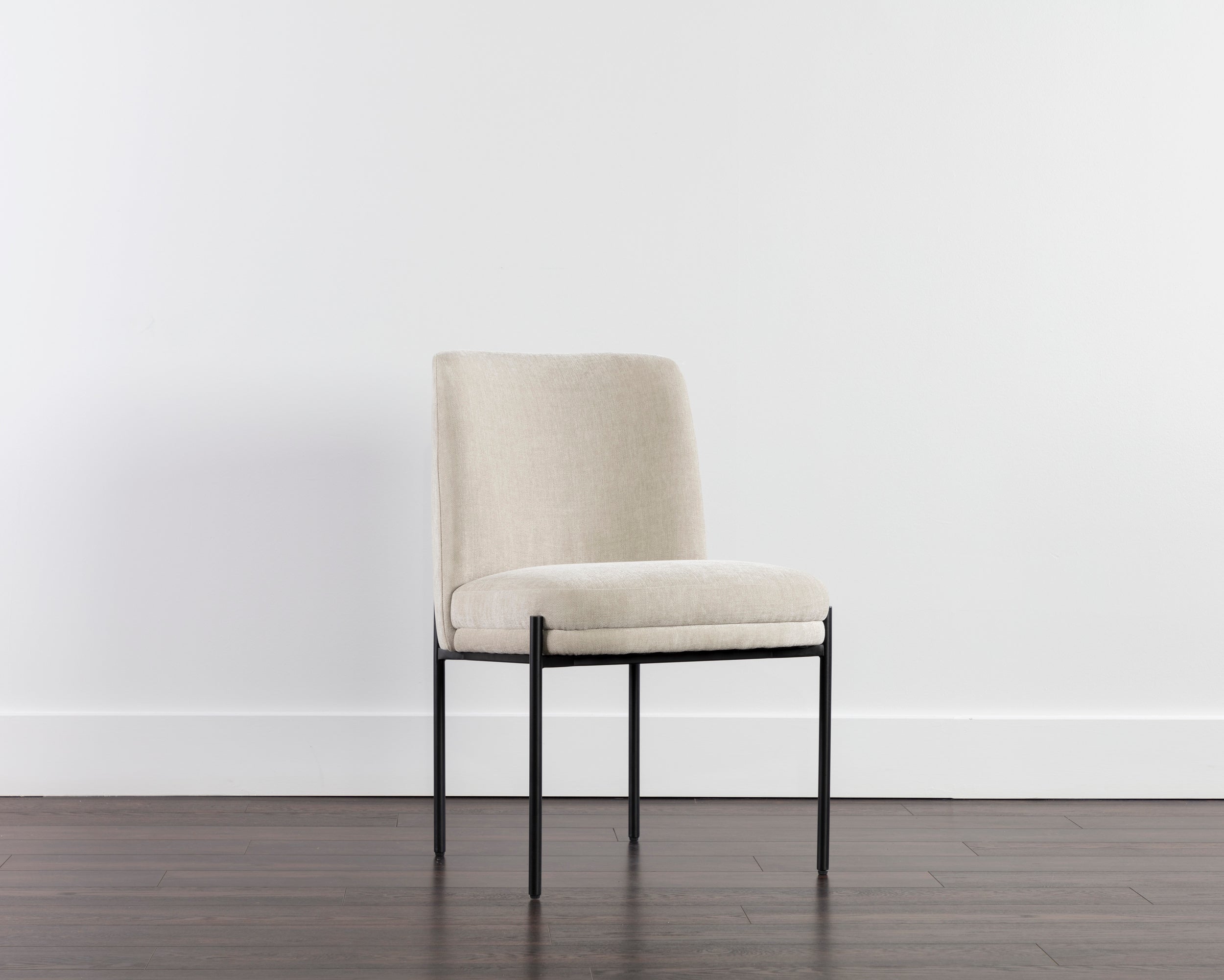 Allow guests to dine in style with this modern dining chair. Designed with a comfortable seat in a softly textured danny ivory fabric with exposed black metal legs.