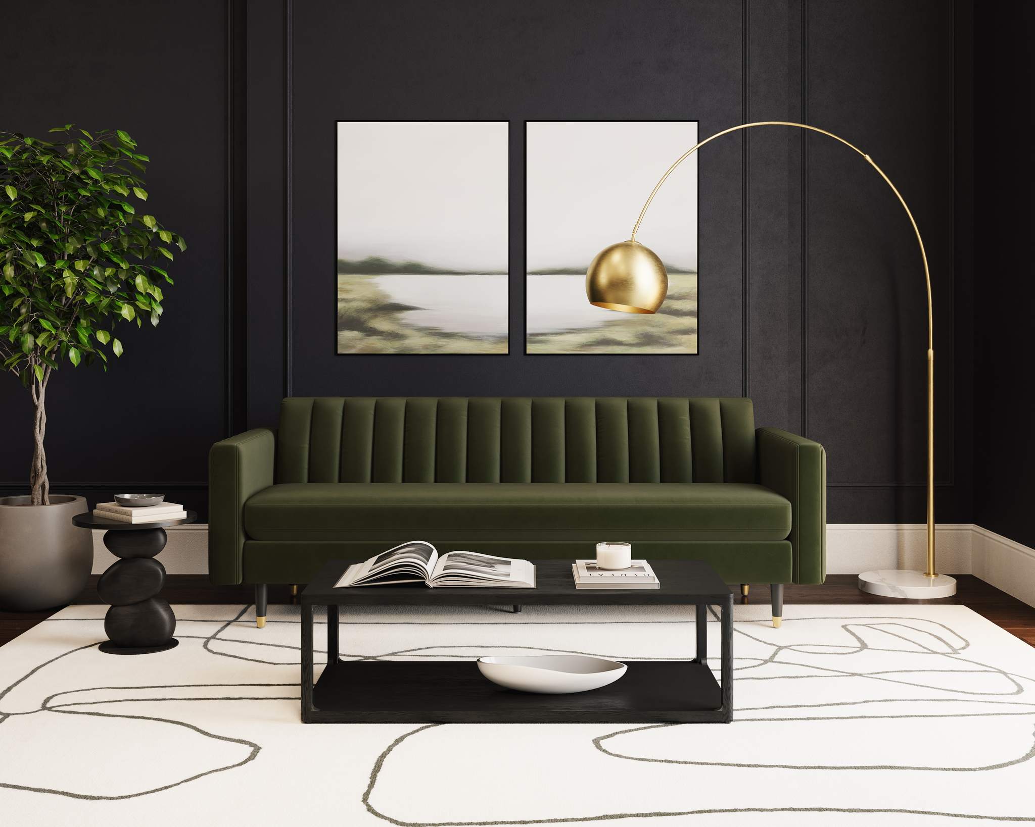 This structured sofa will make a bold and comfortable statement in any space. Features a seatback with channel tufting in velvet moss green or smokescreen grey fabric. Finished with black rubberwood legs and brushed antique brass caps.