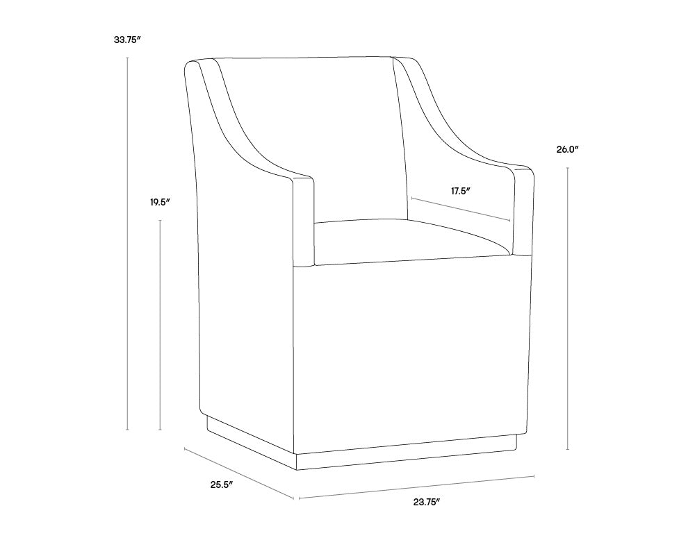 An eye-catching, ultra glamourous wheeled lounge chair. Stocked in our abbington black fabric with a brushed brass steel frame. Sophistication and comfort fit for various dining and lounge spaces.