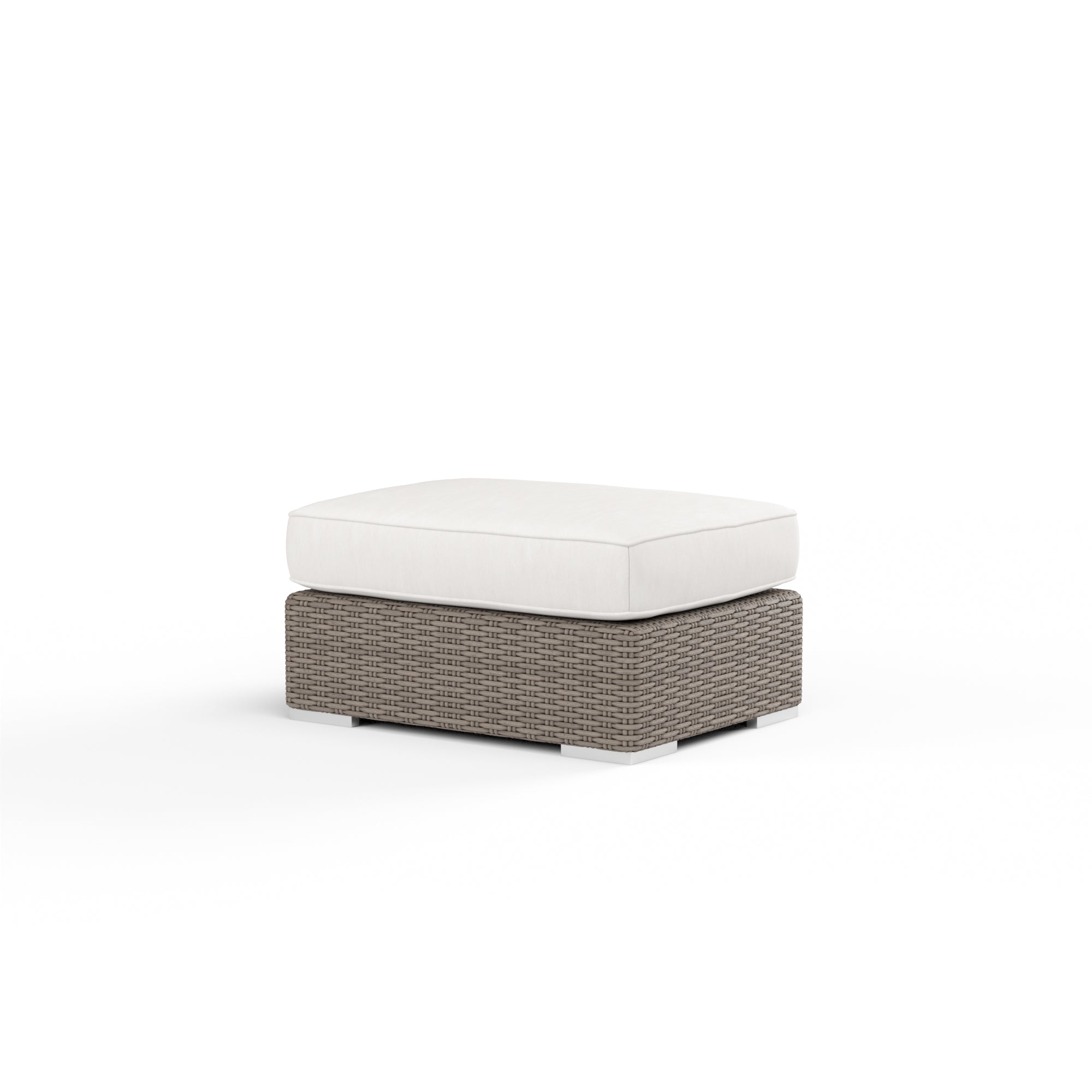 Sunset West's Coronado Ottoman features transitional lines, wrapped in a beautiful resin wicker finish in Driftwood. Outstanding comfort is provided with plush, fast drying cushions.
