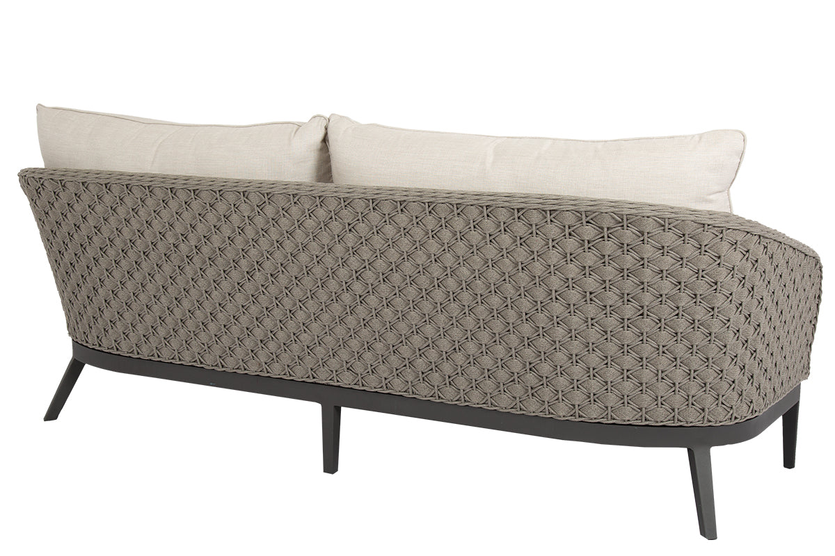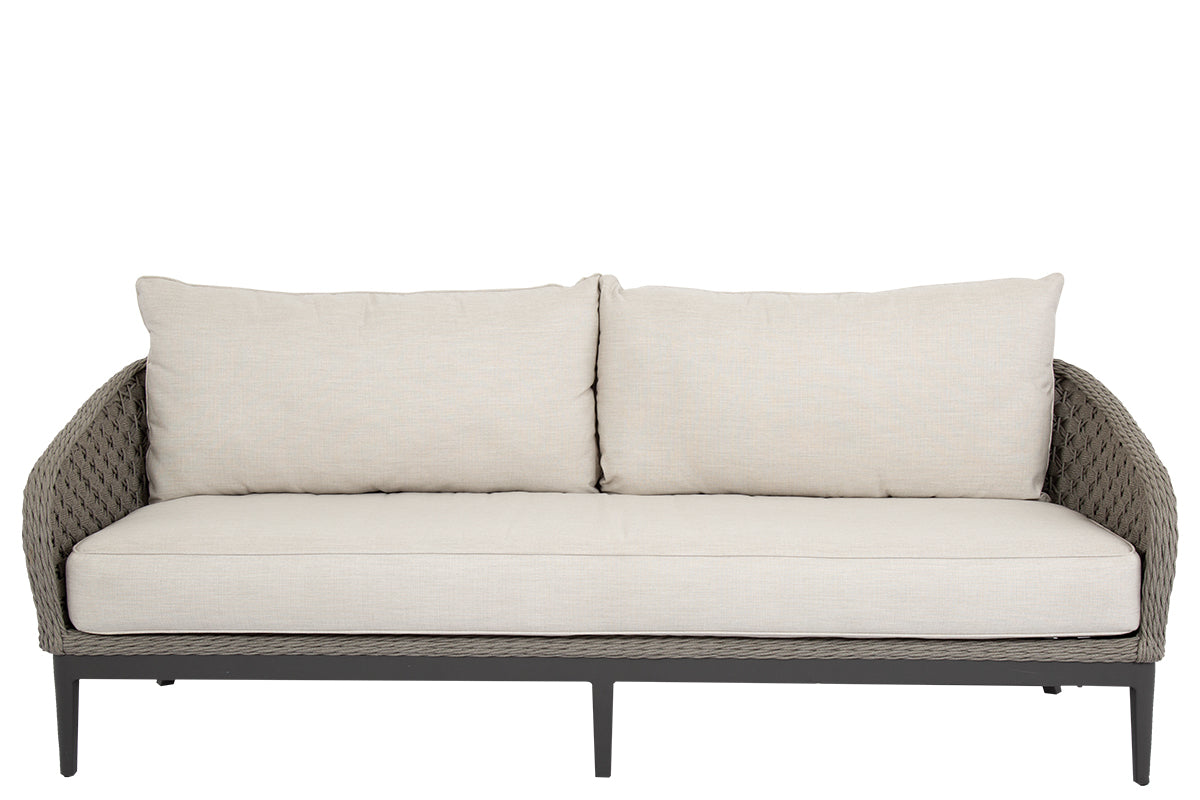 The Marbella Sofa offers a mid-century style frame with curved back and sloping arms, with tapered legs in Graphite powder-coated aluminum. Plush 6" cushions and pillow back offer ultimate comfort.