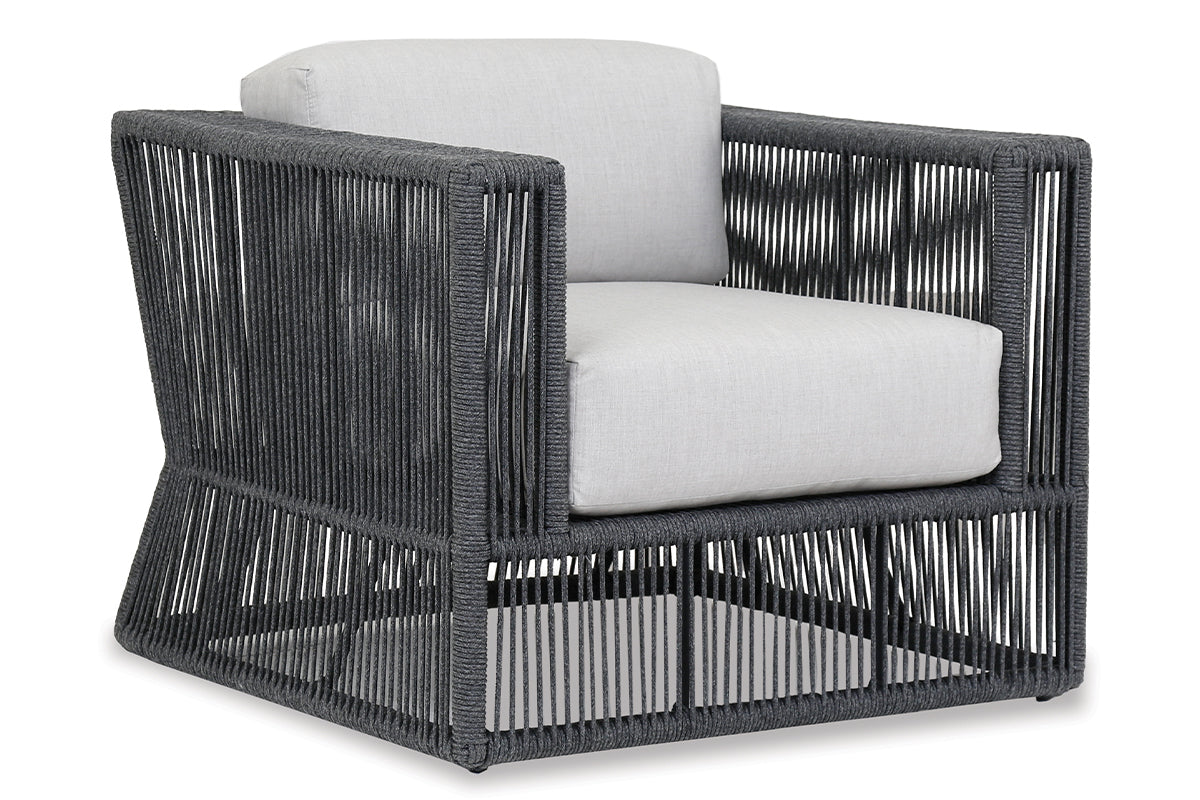 The Milano Club Chair provides clean lines and thoughtful angles with a hand-woven rope design. Its curved powder coated aluminum frame is expertly wrapped with premium all-weather olefin rope in a slate finish, and features and features a box frame with pinched back leg detail.