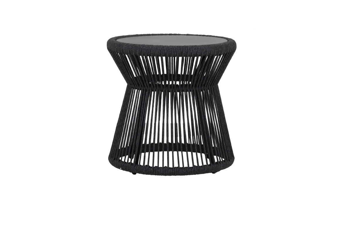 The Milano End table delivers a winning combination of both whimsy and refinement, with striated rope design and hourglass frame. This table features a honed natural Granite marble top, and round aluminum base wrapped in premium olefin rope in Slate.