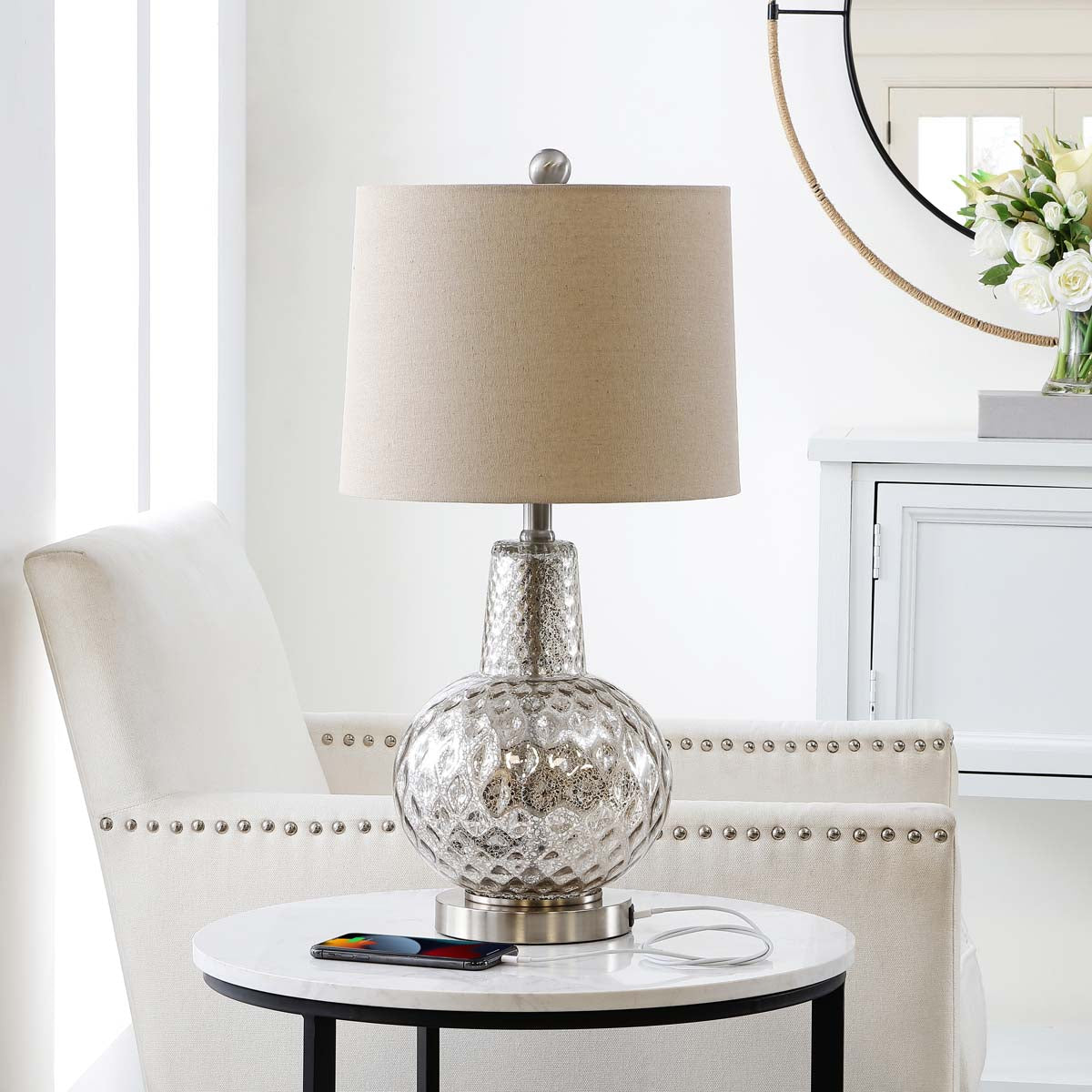 This stunning contemporary table lamp radiates beauty. Designed with mercury glass, its hammered texture instantly upgrades any room with its modern luxurious style. Often used in by designers in pairs to frame a sofa. This table lamp comes with a built-in USB port to keep your devices charged at all times.