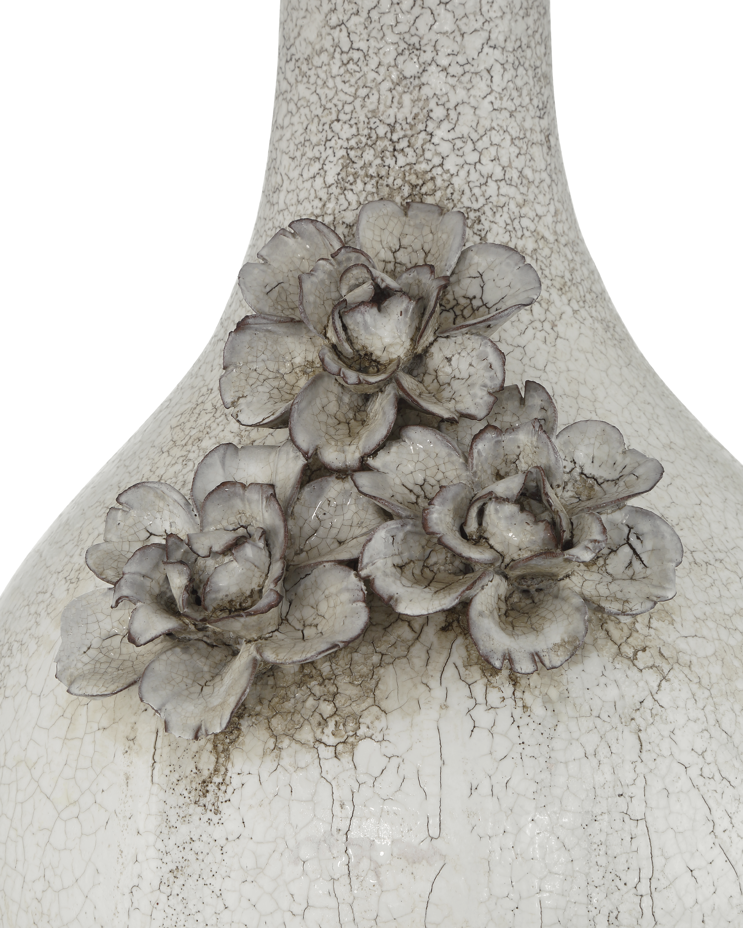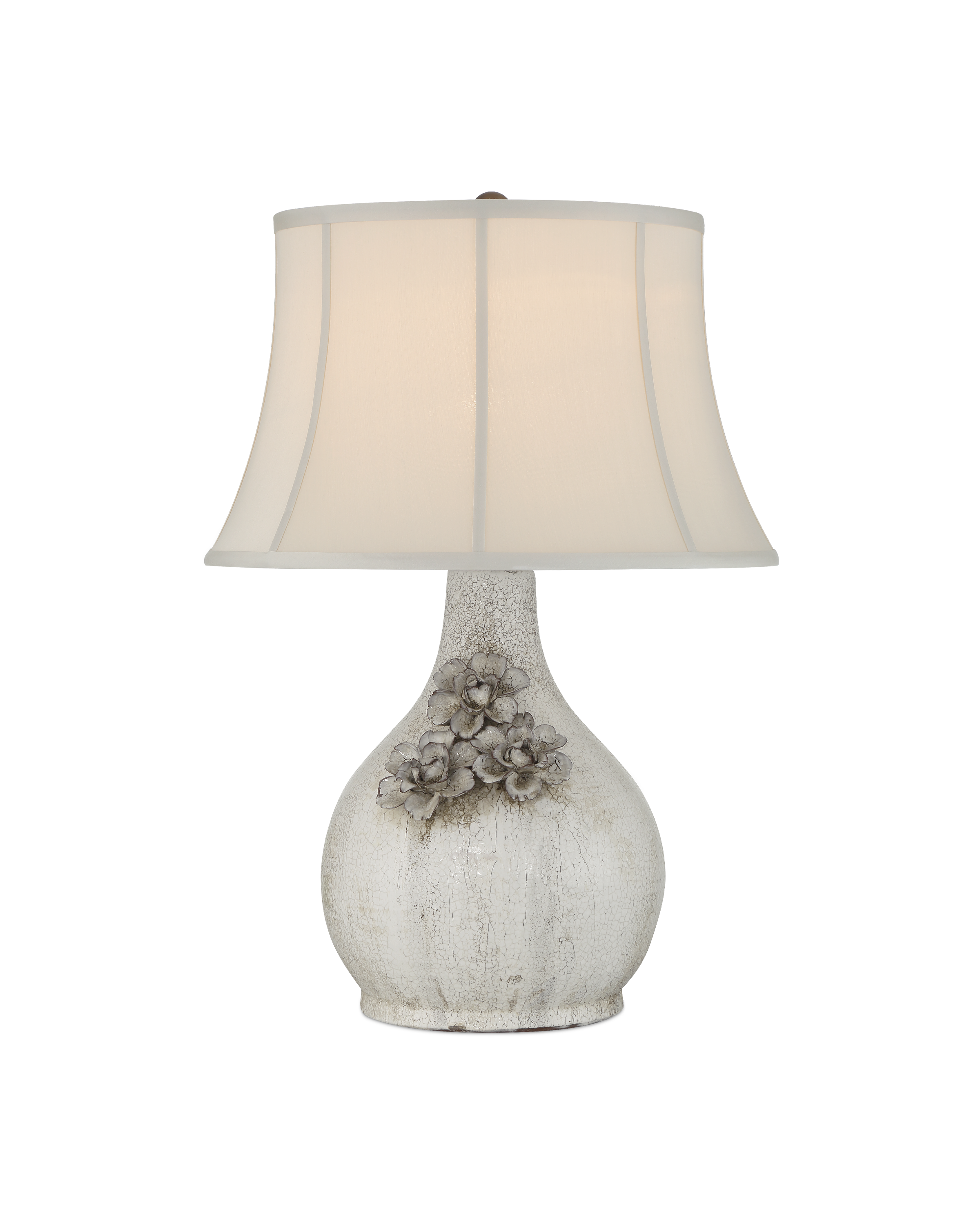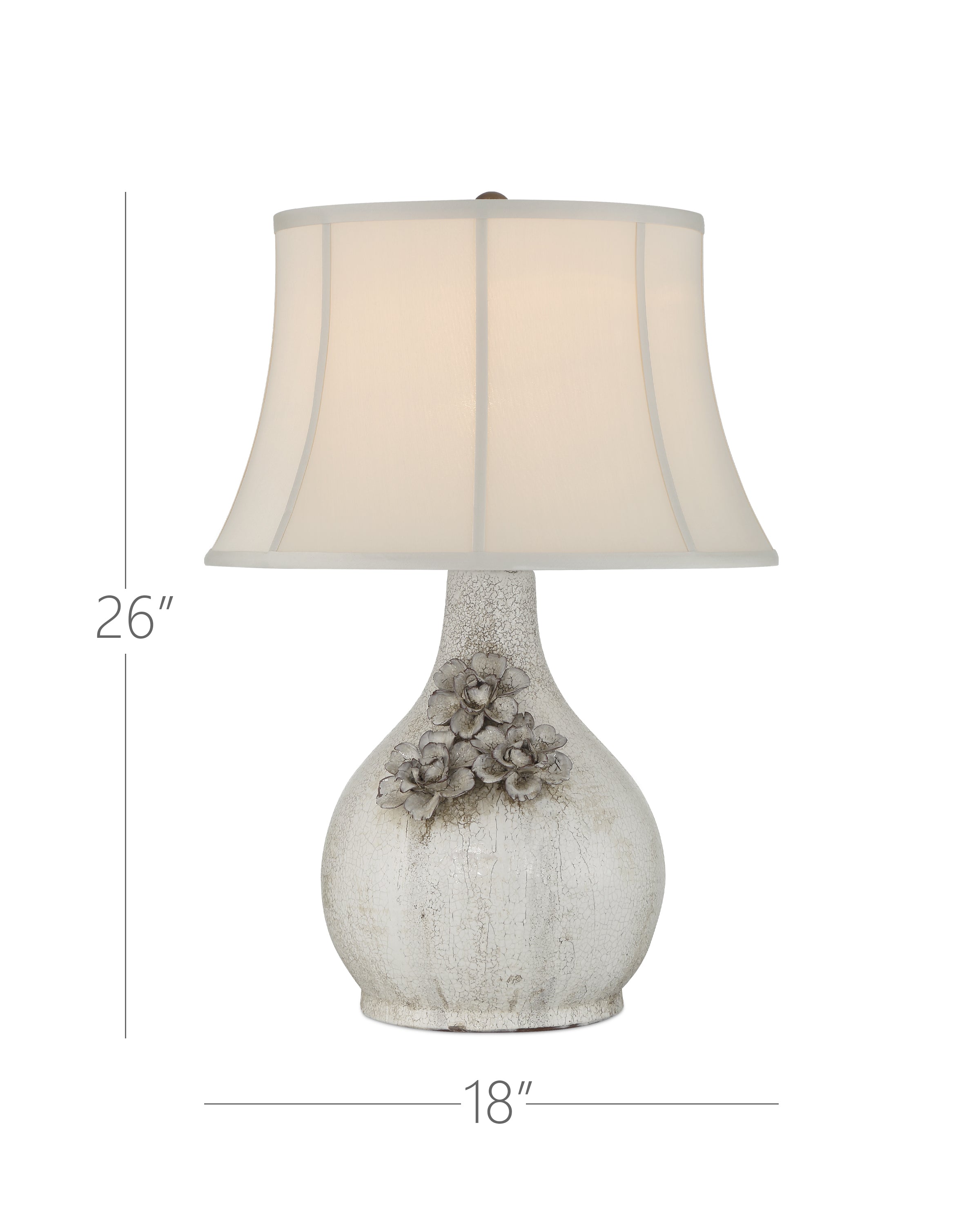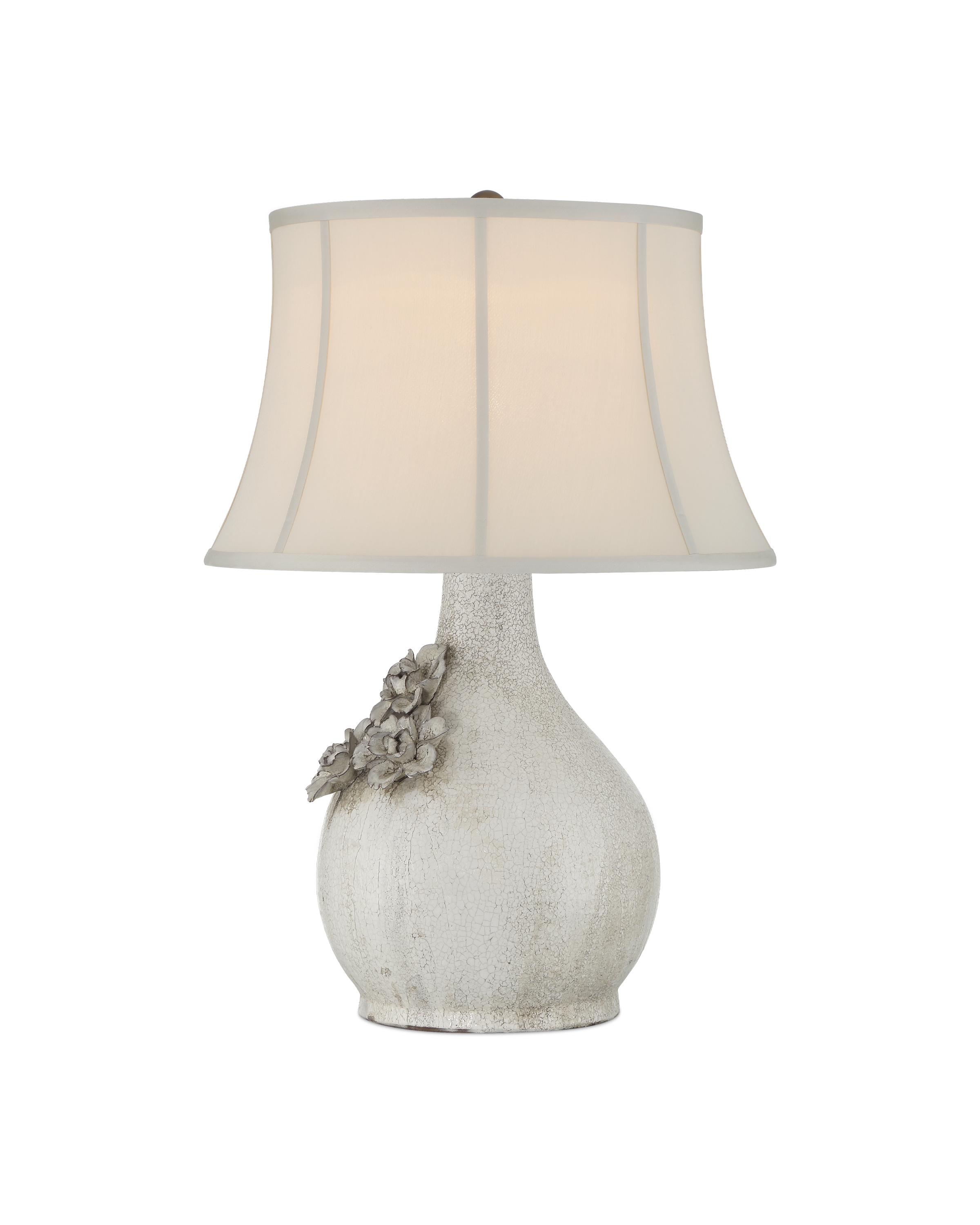 The Attar White Table Lamp is crafted from ceramic with a crackled, falling glaze that gives each piece a unique, aged character. The textured finish is especially pronounced on the trio of hand-formed flowers applied to the lamp’s body, adding dimension and artisanal detail. A soft-backed, bell-shaped shade completes the design, enhancing the vintage-inspired look with a gentle, traditional silhouette.