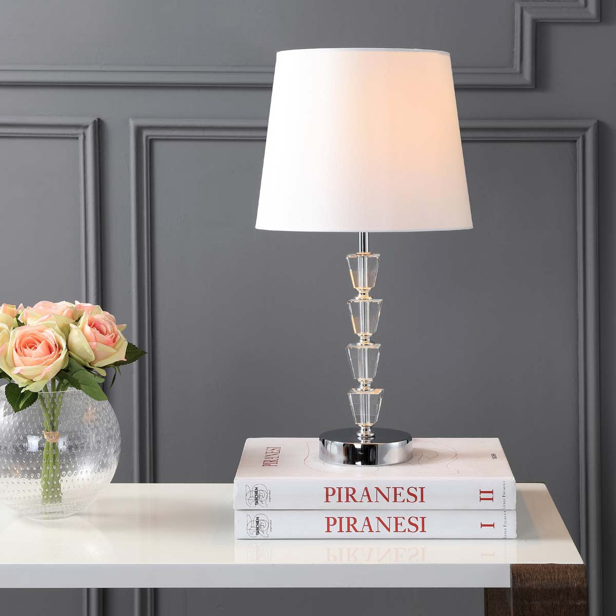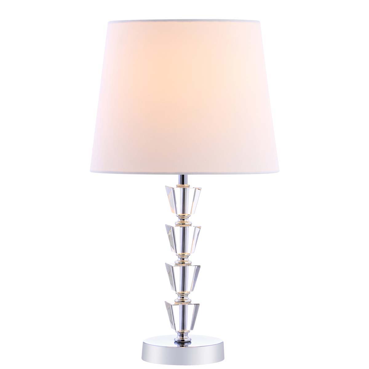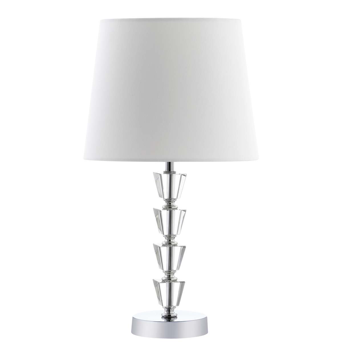 Add a delicate touch to the living room or bedroom with this contemporary table lamp. Finely crafted with a crystal clear sculpted design and sleek minimalist white shade, its gentle curves are perfectly paired with its chrome base.