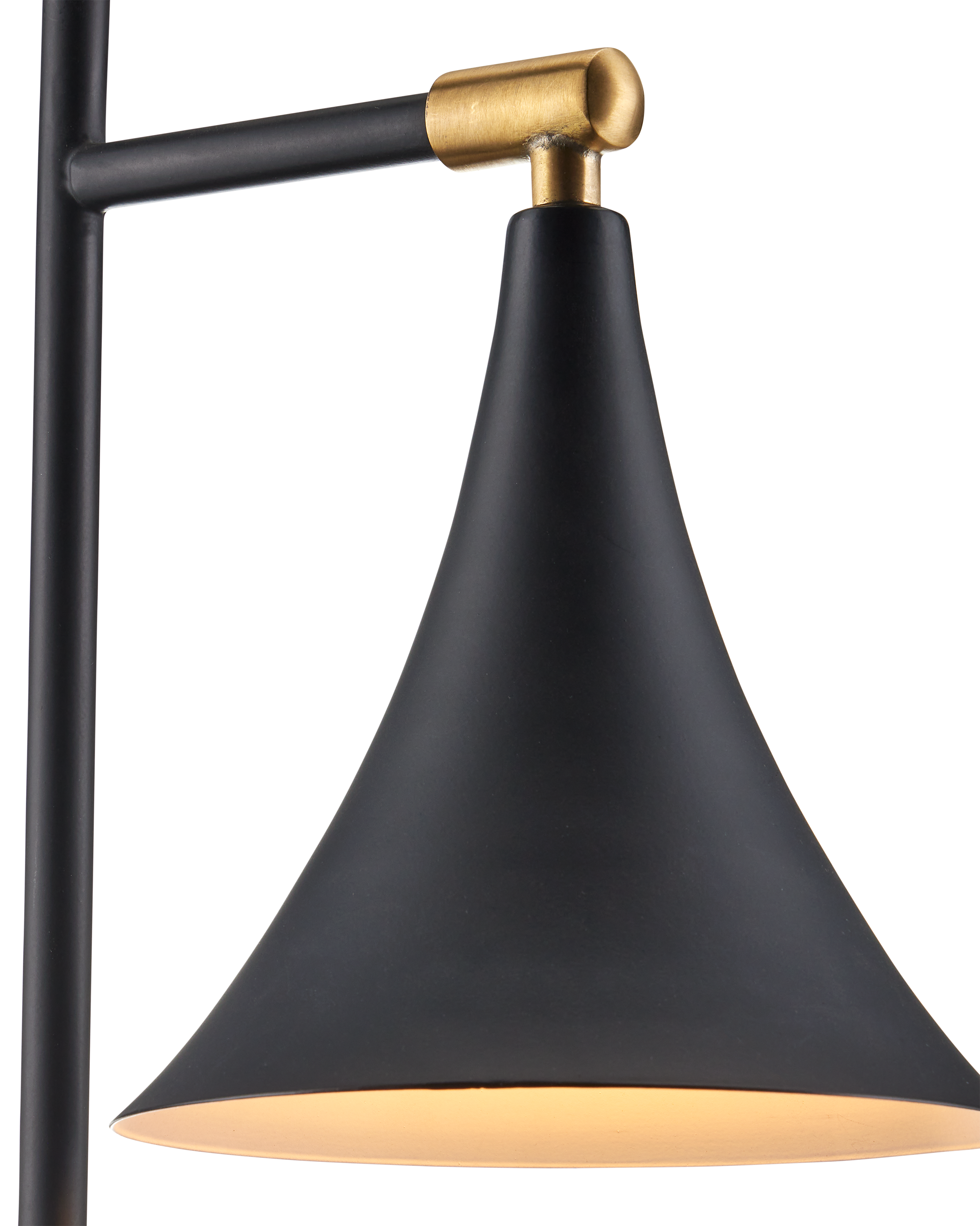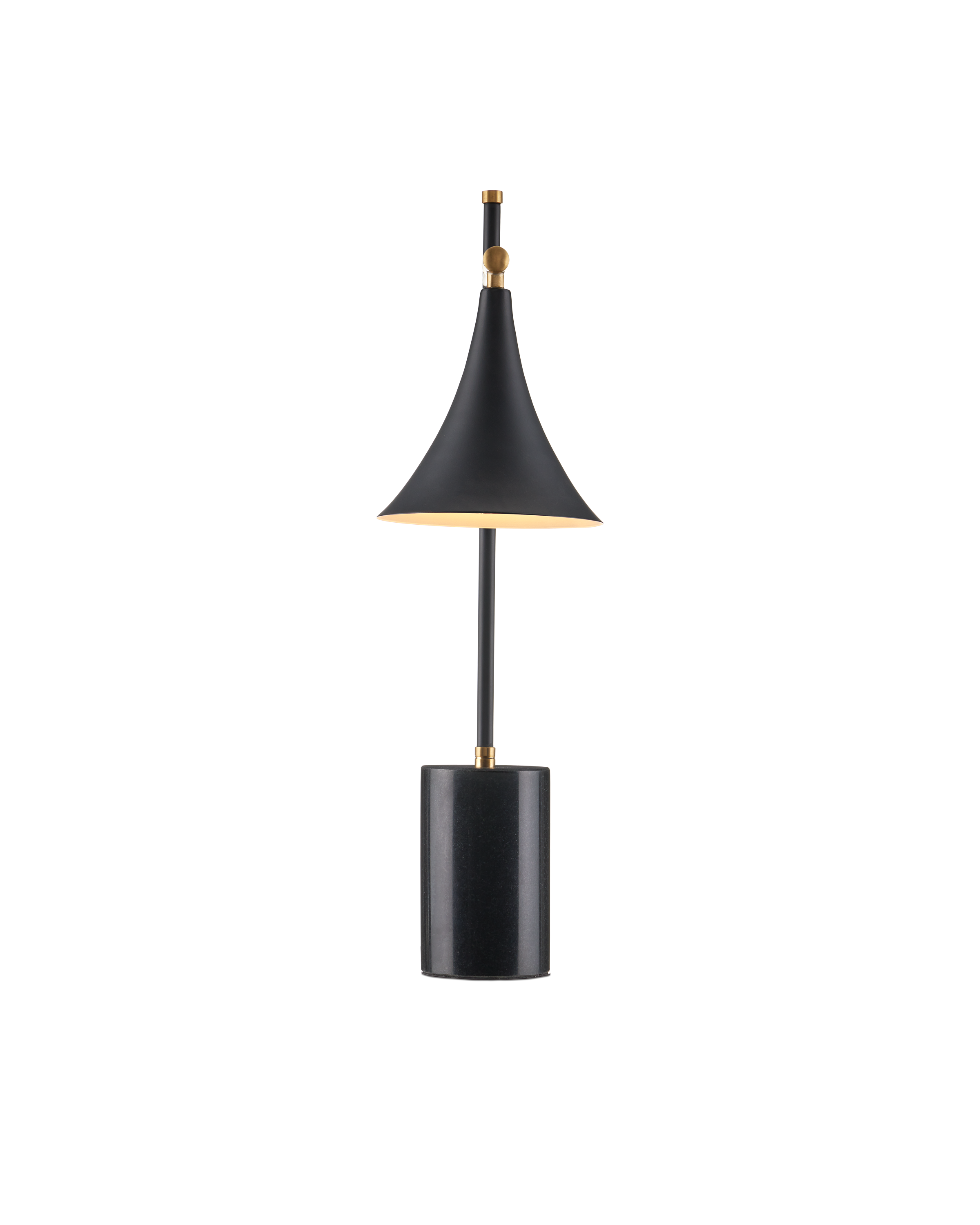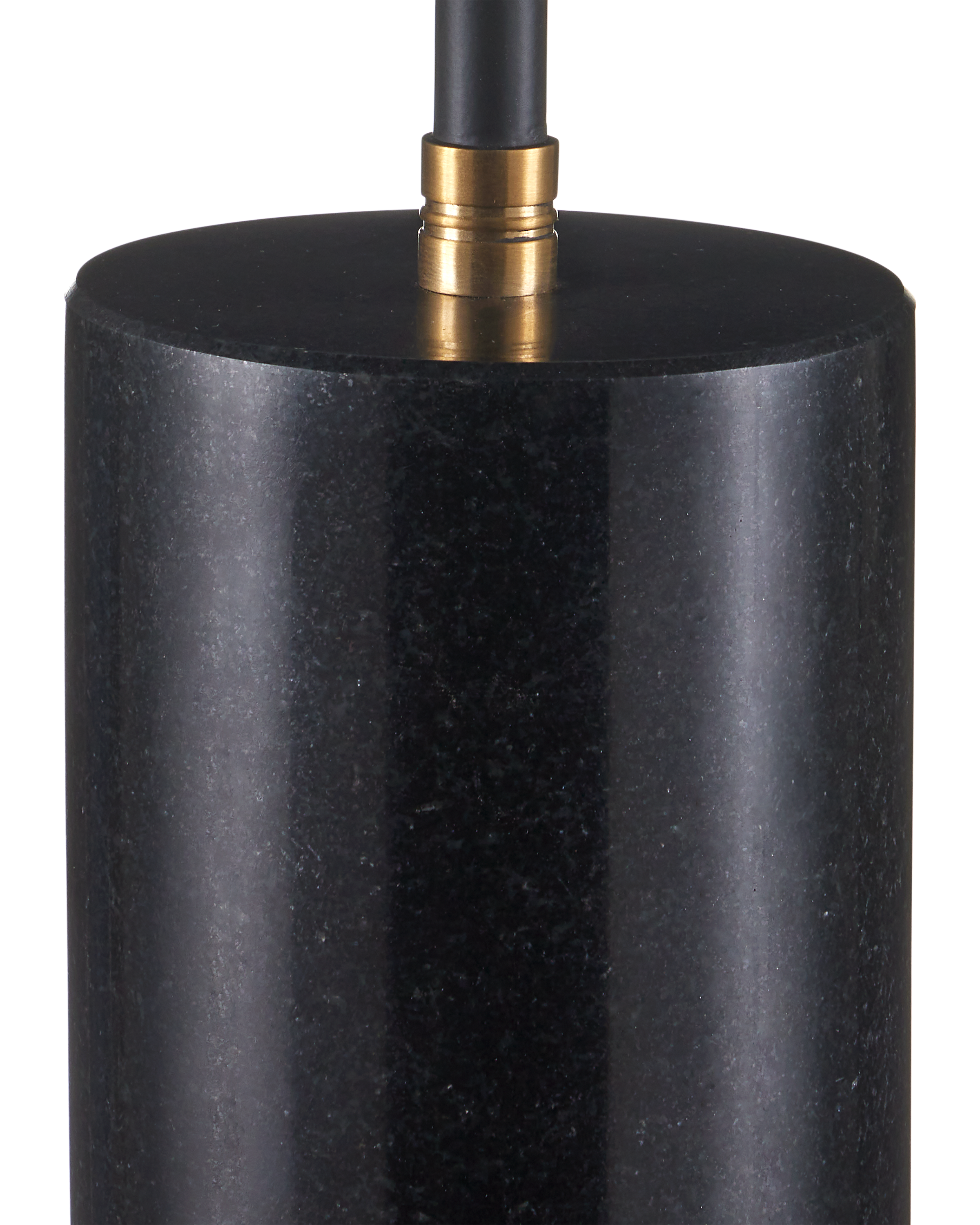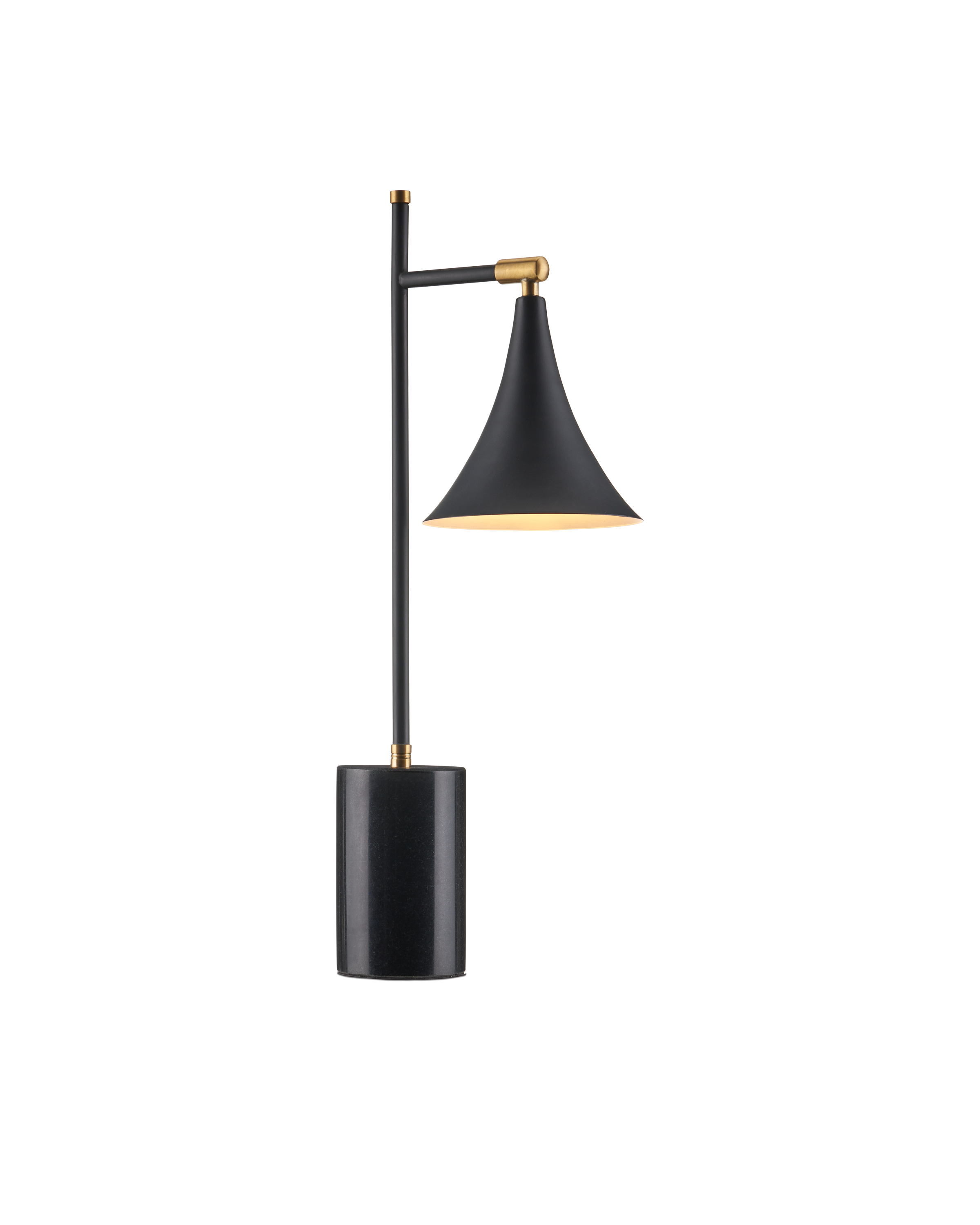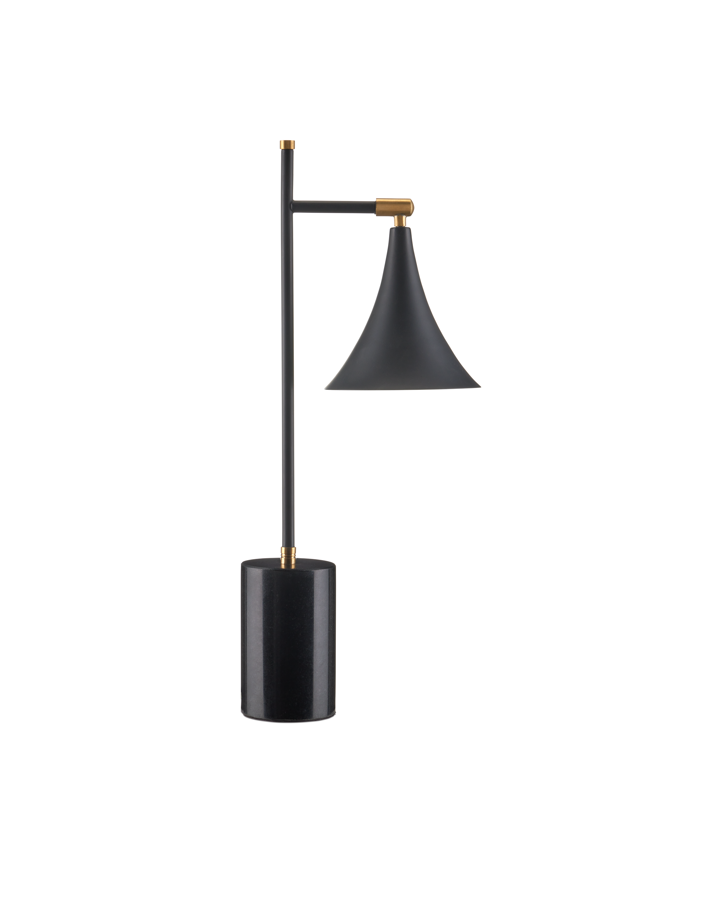 The Bibliophile Table Lamp earns its name with its elegant fluted shade that will cast down-light on the task being undertaken. The thin stem, which rises from a tall cylindrical black marble base, and the shade are in a matte black finish with sophisticated matte brass accents. Though this is a perfect helpmate for a desk, the black table lamp is not adjustable.