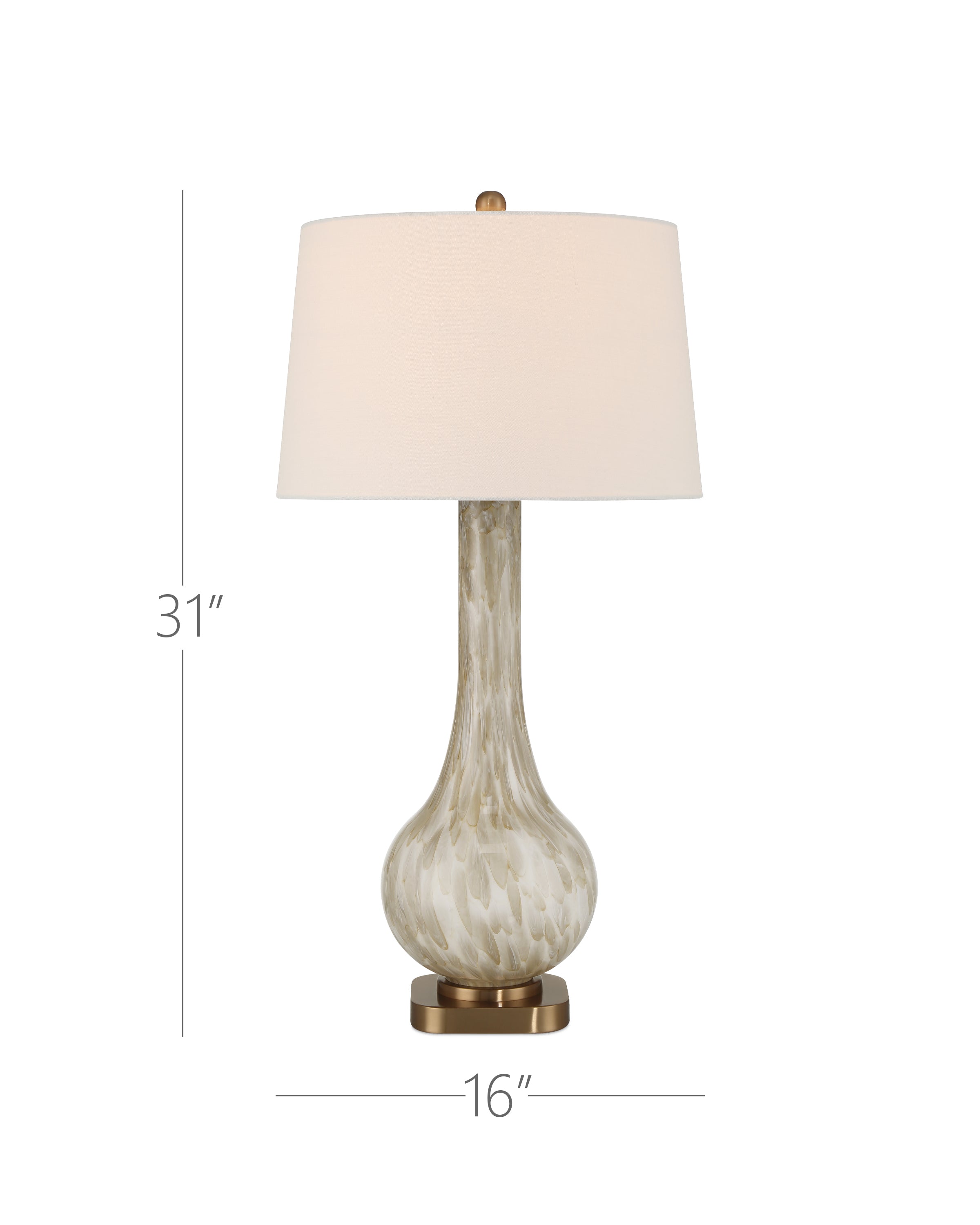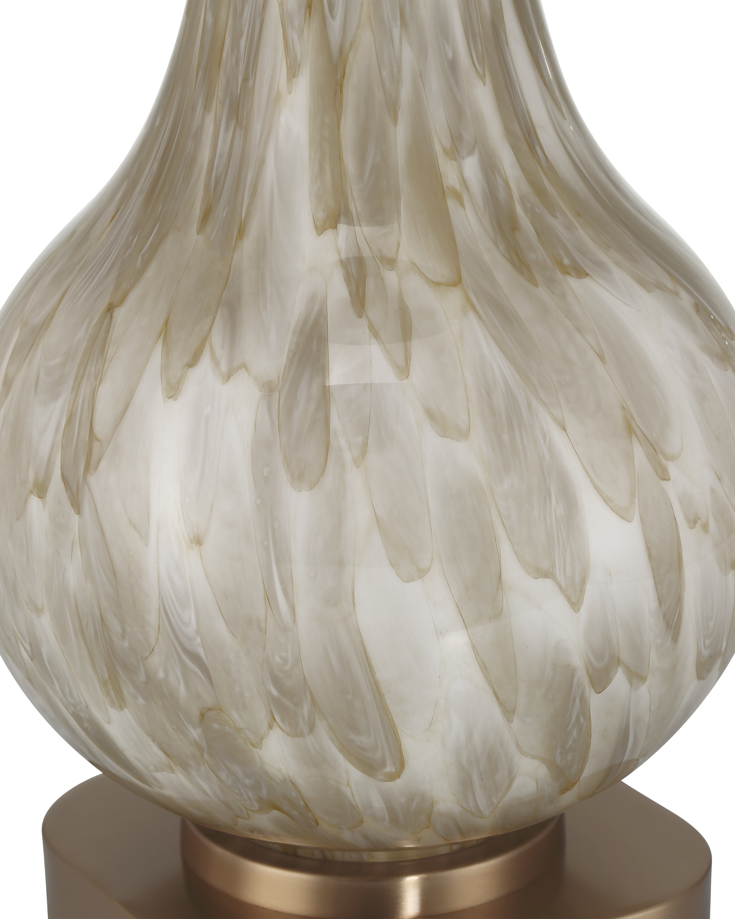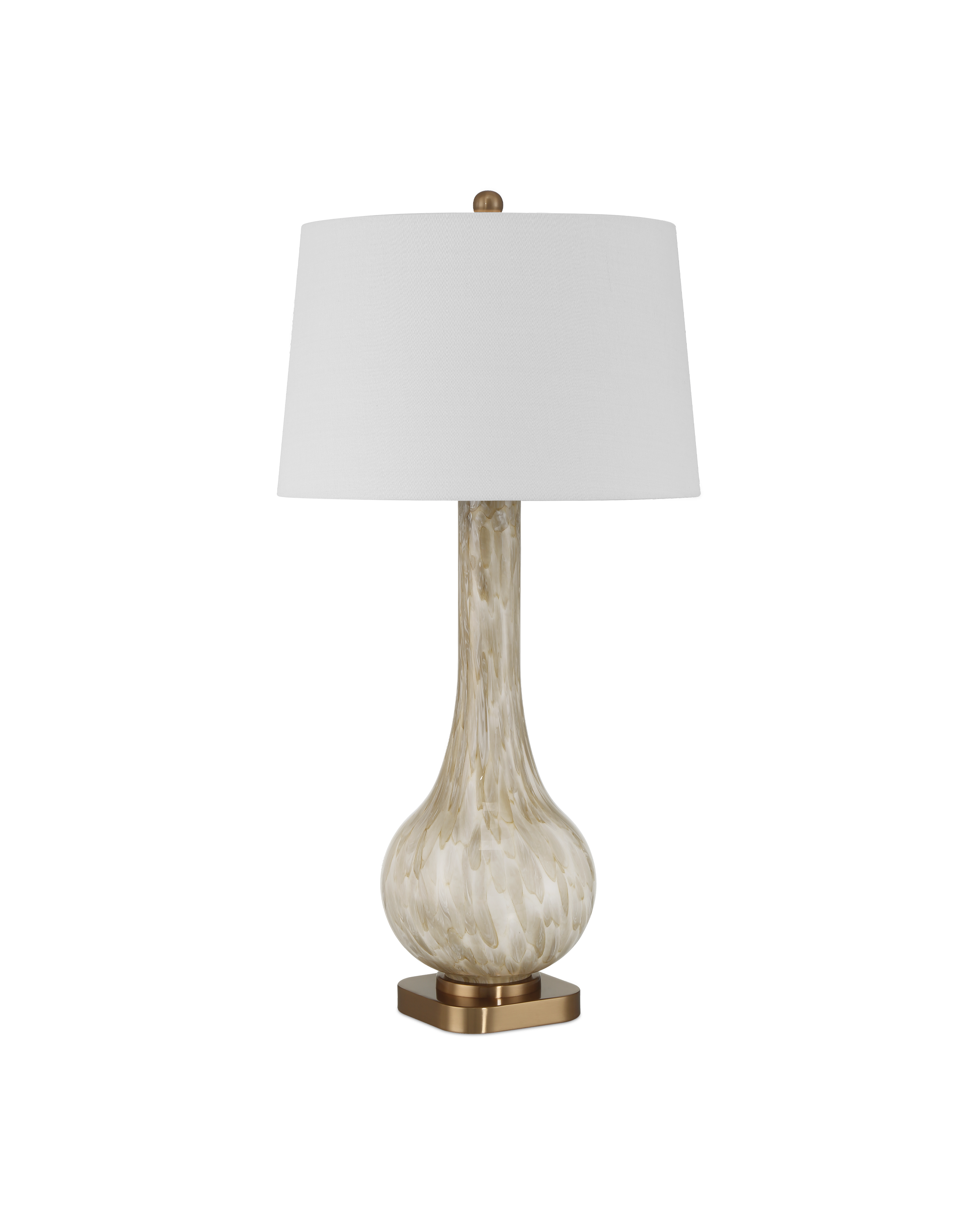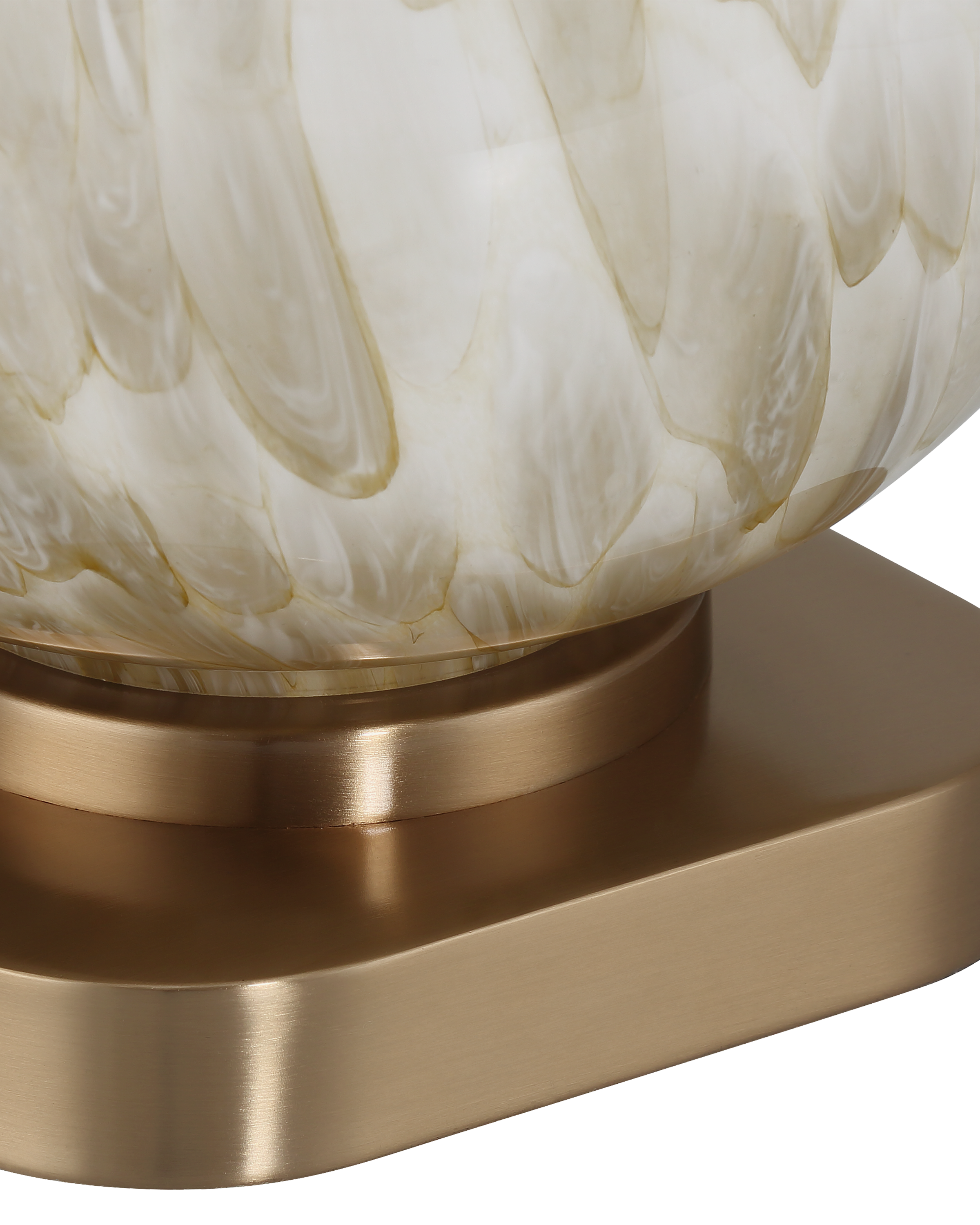 The Bombon Table Lamp is made from fused and marbled glass that brings floating patterns alive on its surface that create a sense of movement and depth. This pale visual texture is contrasted by the warmth of a stacked metal base and a round crystal finial om an antique brass finish. The rounded corners of the square base bring a traditional feel to its profile.