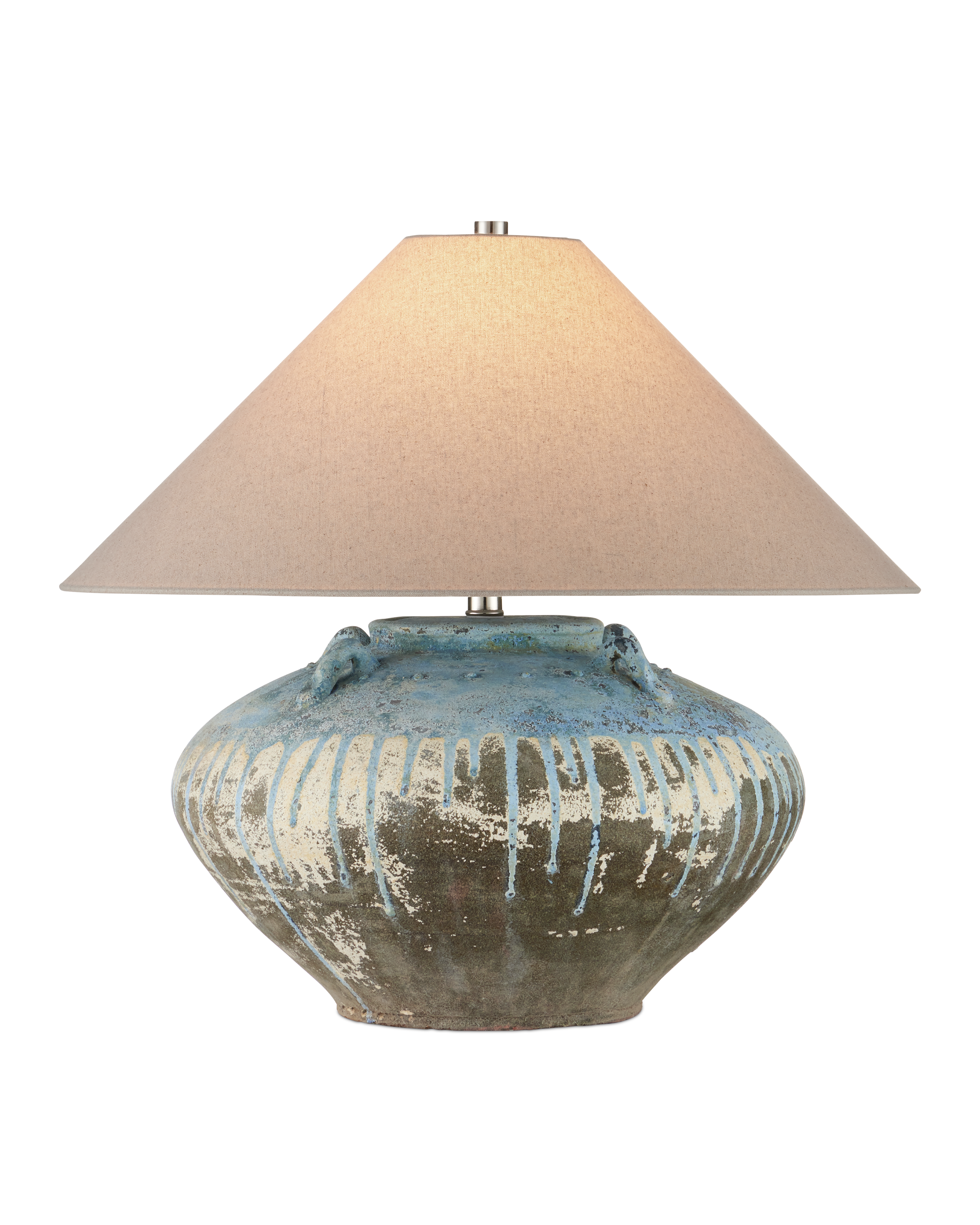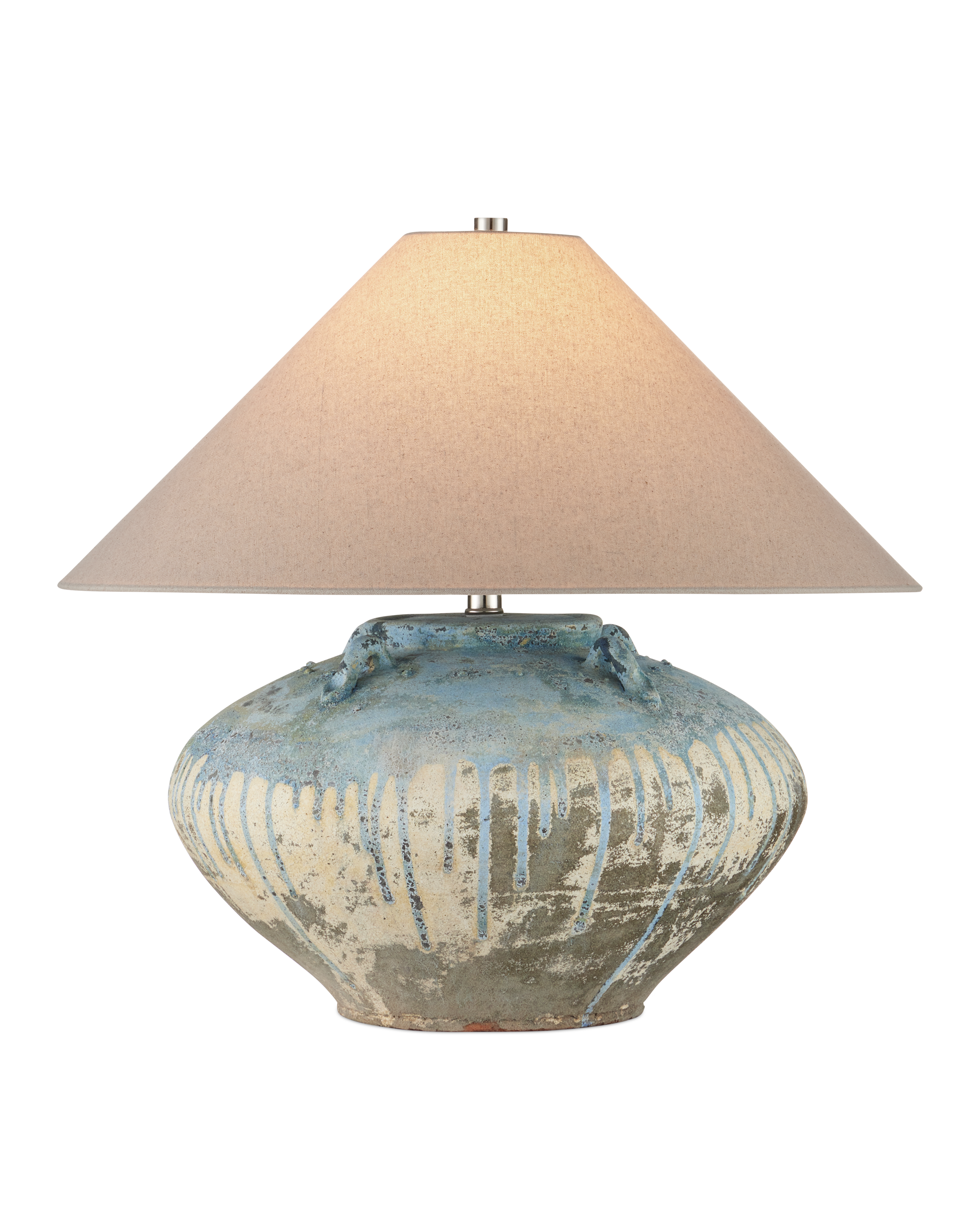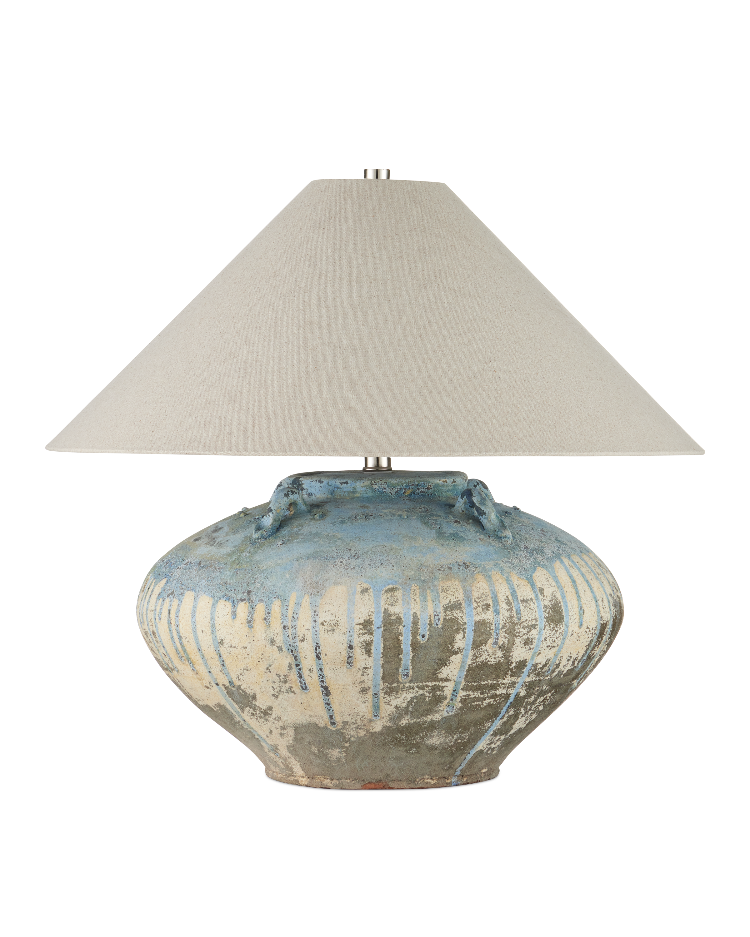 The Catania Antique Blue Drip Table Lamp is hand-built from terracotta and finished with layers of pale ivory and dripped blue glaze, applied by artisans for a richly varied, one-of-a-kind finish. The contrasting hues highlight the raw terracotta beneath, giving the piece a timeworn, Mediterranean character that feels centuries old. With its substantial jar-shaped body measuring two feet in diameter, the lamp makes a bold statement, while the flared modern empire shade adds a refined contrast to its rustic, handcrafted base.