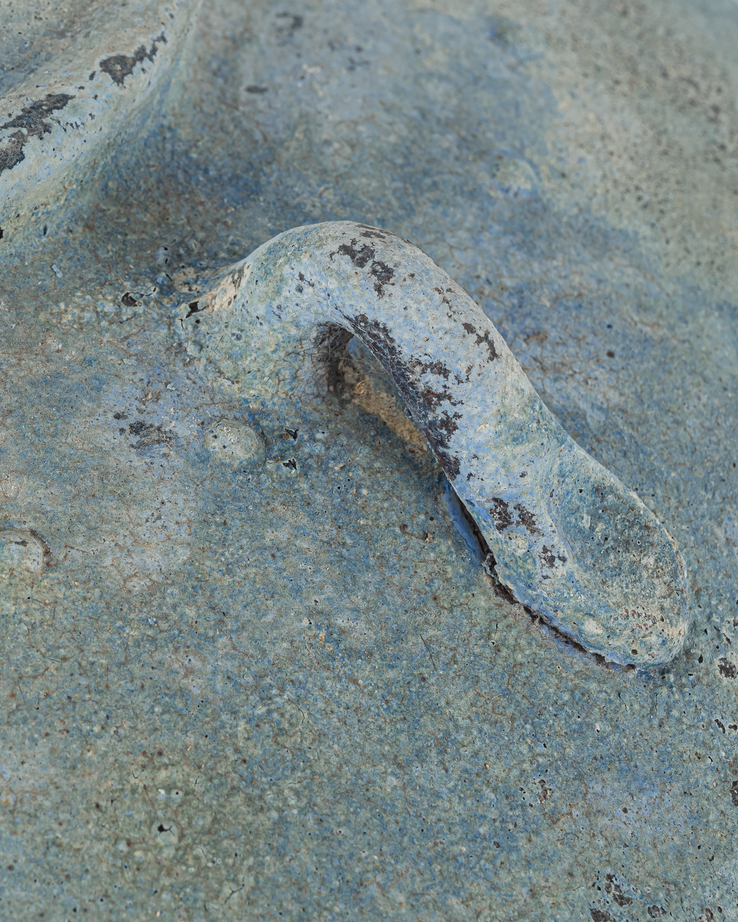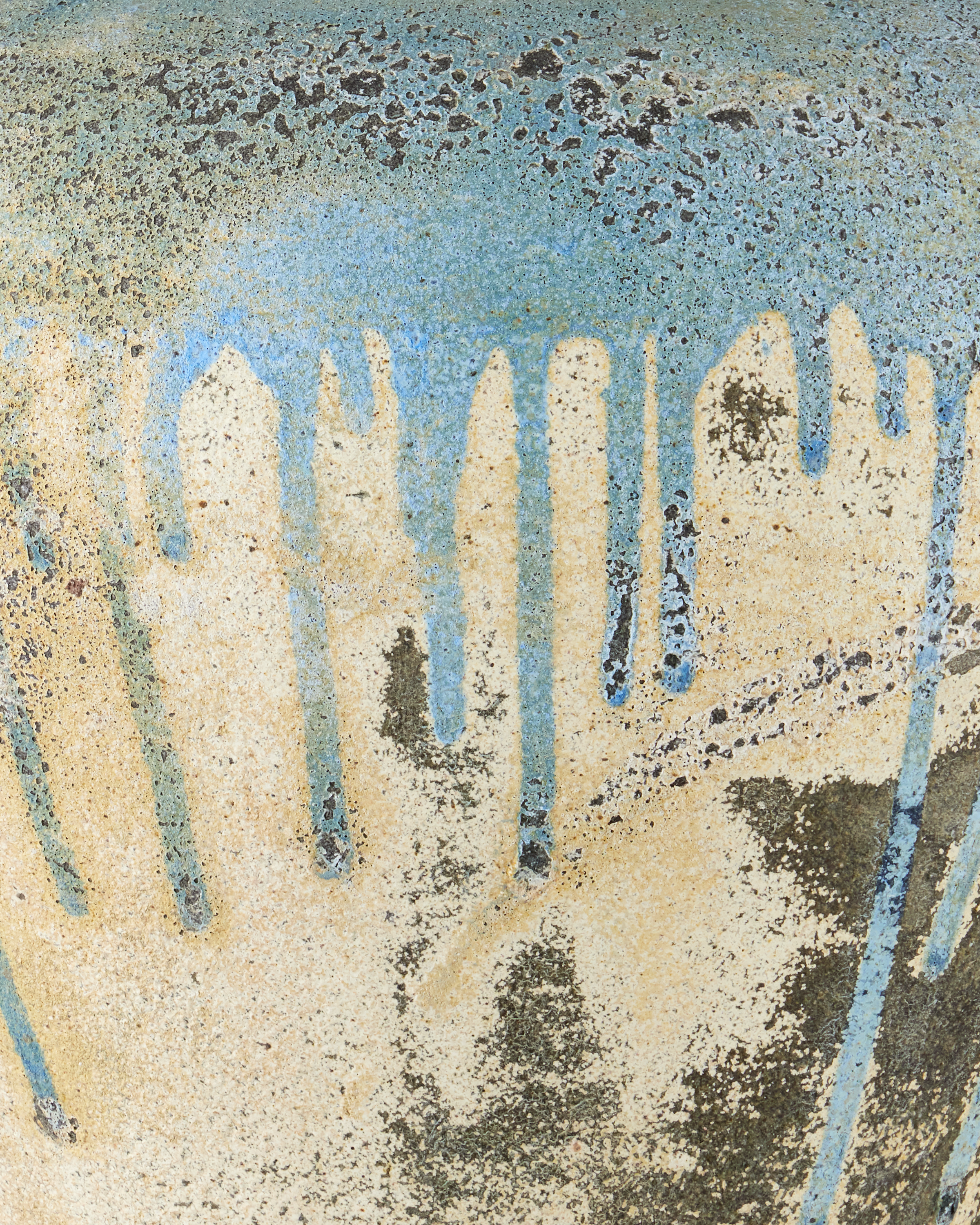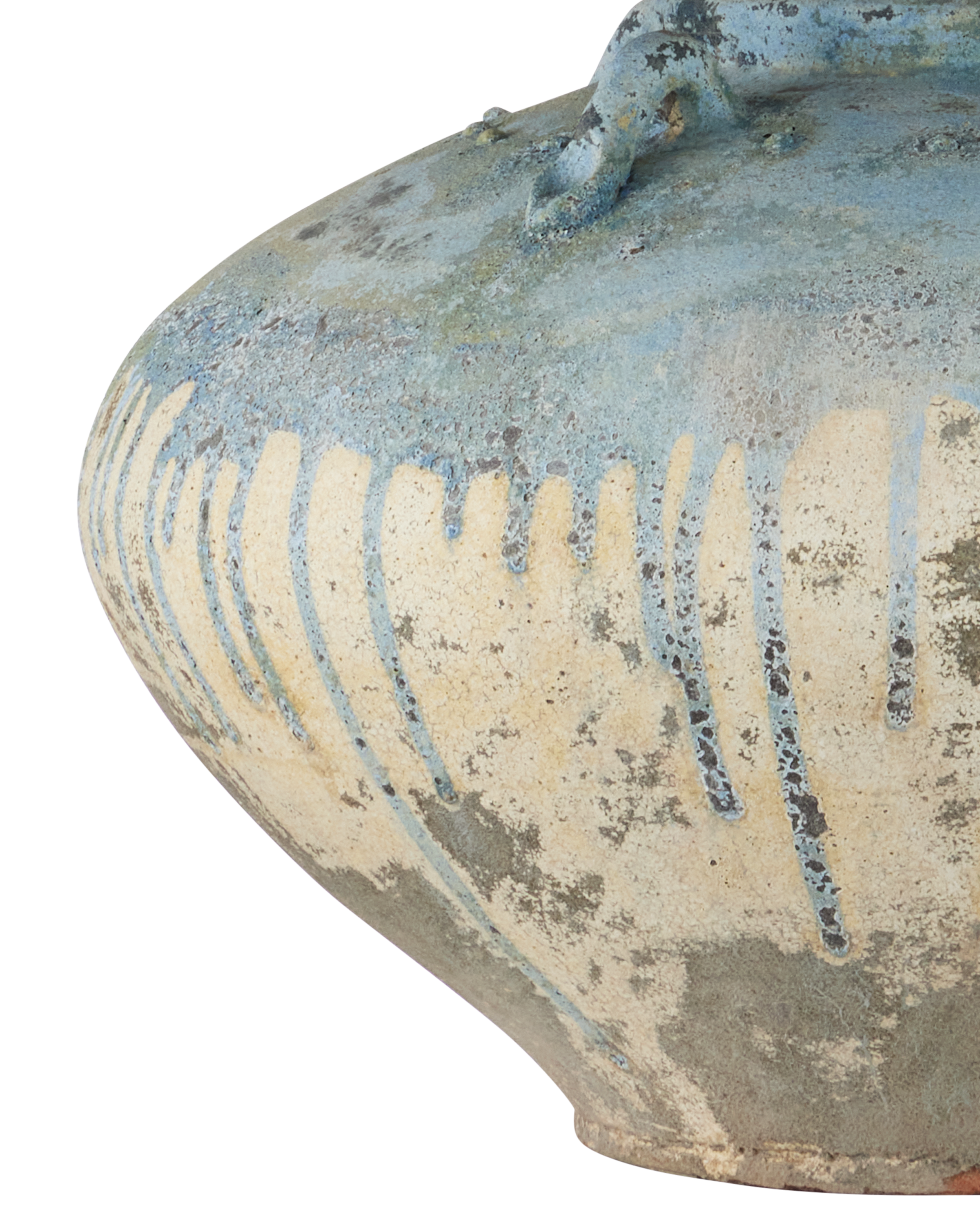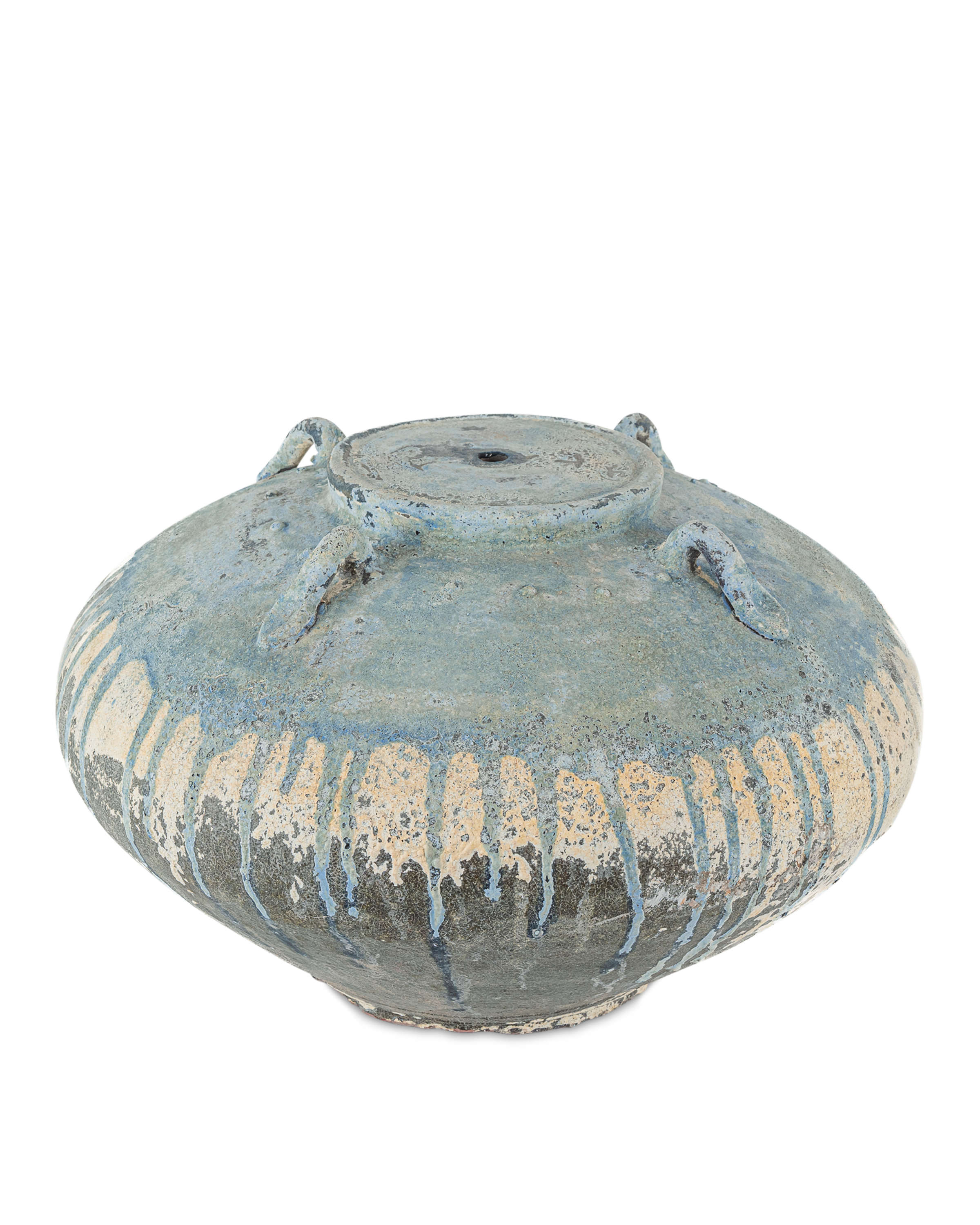 The Catania Antique Blue Drip Table Lamp is hand-built from terracotta and finished with layers of pale ivory and dripped blue glaze, applied by artisans for a richly varied, one-of-a-kind finish. The contrasting hues highlight the raw terracotta beneath, giving the piece a timeworn, Mediterranean character that feels centuries old. With its substantial jar-shaped body measuring two feet in diameter, the lamp makes a bold statement, while the flared modern empire shade adds a refined contrast to its rustic, handcrafted base.