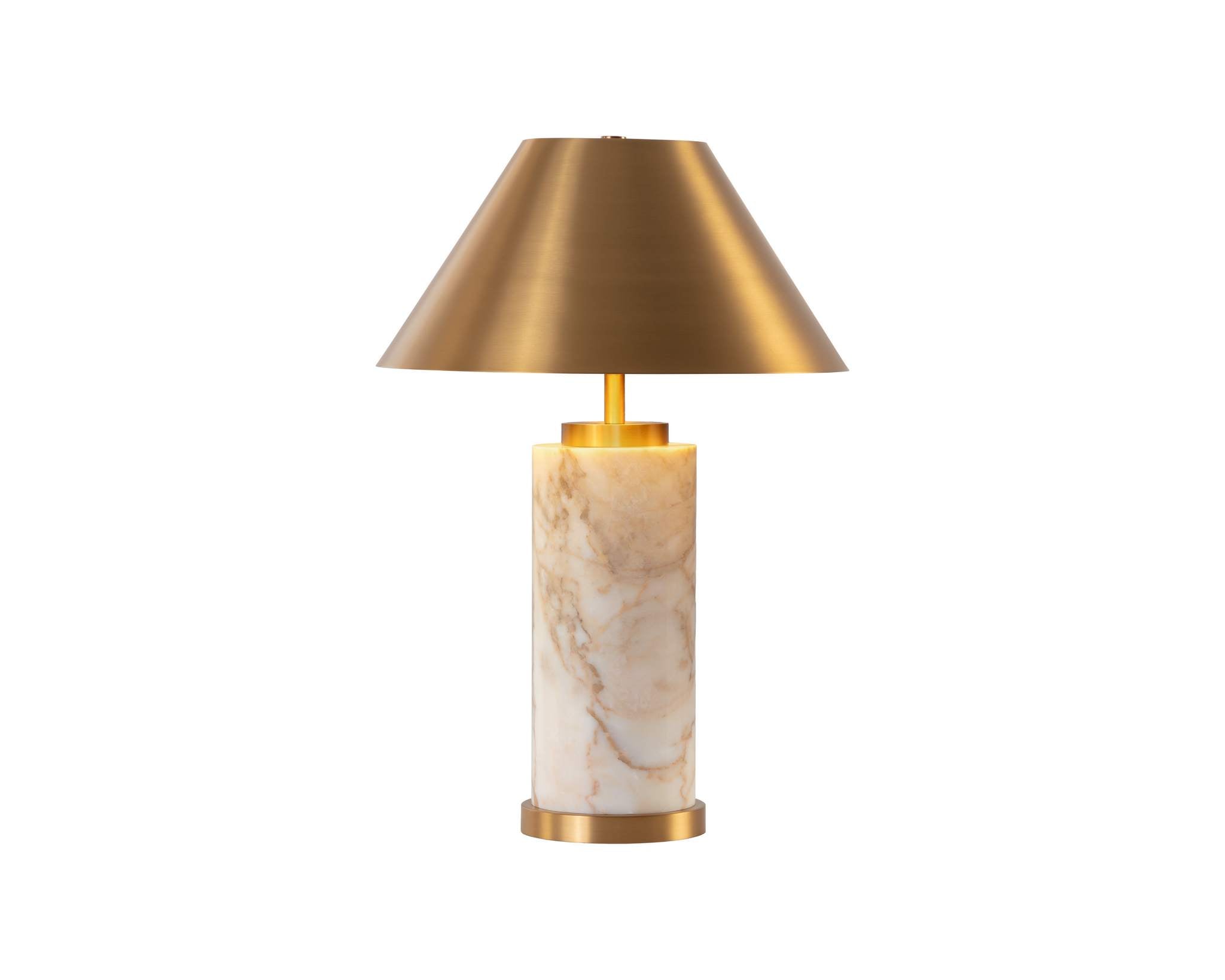 The Cilla Table Lamp features an opulent combination of luxe mixed materials. A cylindrical base of rich Italian marble highlights varying colour tones and organic veining patterns, giving each lamp a distinct character. Topped with a tapered metal shade in a brushed gold finish that beautifully complements the modern design and enhances the lamp's pleasant glow.